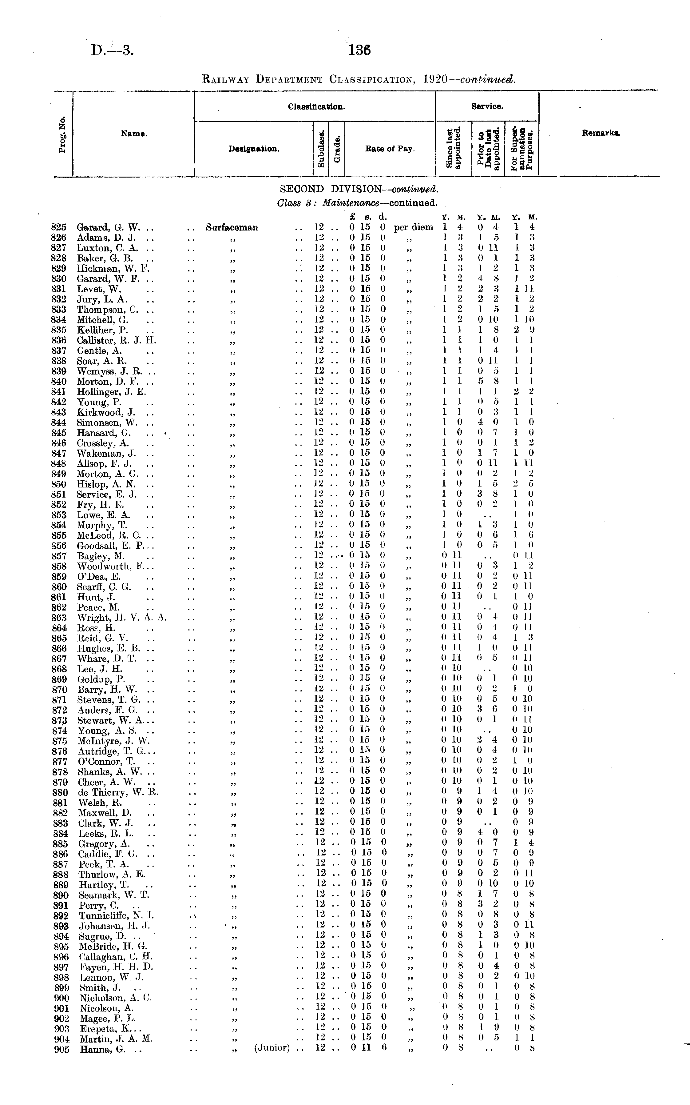 Classification. Service. Z ob Name. o M to 6 Z A o to Name. L _: -.«"rd S • S • 2 2 9 2, ID *+= * "S re a t.rH 00 Designation. o \e Bate of Fay. g-g oa-g b 3 3 & ? i ft 5 " CO& r^fig. uti 1 -co £1 B CO a-rt cd rfi frSa e a p to"to 8 § » a-rt 9 rfi cogg, frSa o a p to"to Remark* Remark* Designation. 5 Bate of Pay. SECOND DIVISION— continued. Glass 3 : Maintenance —continued. 825 Garard, G. W. 826 Adams, D. J. 827 Luxton, C A. 828 Baker, G. B. 829 Hickman, W. F. 830 Garard, W. F. .. 831 Levot, W. 832 Jury, L. A. 833 Thompson, 0. .. 834 Mitchell, G. 835 Keffiher, P. 836 Callister, R. J. H. 837 Gentle, A. 838 Soar, A. R. 839 Wemyss, J. R. .. 840 Morton, D. F. .. 841 Hollinger, J. E. 842 Young, P. 843 Kirkwood, J. .. 844 Simonsen, W. .. 845 Hansard, G. .. ■ 846 Crossley, A. 847 Wakenian, J. .. 848 Allsop, F. J. .. 849 Morton, A. G. 850 Hislop, A. N. .. 851 Service, E. J. .. 852 Fry, H. E. 853 Lowe, E. A. 854 Murphy, T. 855 McLeod, R. C. .. 856 Goodsall, E, P... 857 Bagley, M. 858 Wood worth, F... 859 O'Dea, E. 860 Scarff, C. G. 861 Hunt, J. 862 Peace, M. 863 Wright, H. V. A. A. 864 Ross, H. 865 Reid, G. V. 866 Hughes, E. B. .. 867 Whare, D. T. .. 868 Lee, J. H. 869 Goldup, P. 870 Barry, H. VV. 871 Stevens, T. G. .. 872 Anders, F. G. . . 87.3 Stewart, W. A... 874 Young, A. S. 875 Mclntyre, J. W. 876 Autridge, T. G... 877 O'Connor, T. .. 878 Shanks, A. W. 879 Cheer, A. W. .. 880 de Thierry, W. R. 881 Welsh, R. 882 Maxwell, I). .. 883 Clark, W.J. .. 884 Leeks, R. L. .. 885 Gregory, A. 886 Caddie, F. G. 887 Peek, T. A. 888 Thurlow, A. E. 889 Hartley, T. 890 Seamark, W. T. 891 Perry, 0. .. 892 Tunniclifl'e, N. I. 893 Johansen, H. J. 894 Sugrue, D. .. 895 MoBride, 11. G. 896 Oailaghan, 0. H. 897 Eayen, H. H. D. 898 Lennon, W. J. 899 Smith, J. 900 Nicholson, A. (!. 901 Nicolson, A. 902 Magee, P. L. 903 Erepeta, K... 904 Martin, J. A. M. 905 Hanna, G. .. £ s. d. Y. M. Y. M. Surfaceman .. 12 .. 0 15 0 per diem 14 0 4 ■ ... 12'.. 0 16 0 „ 13 15 .. 12 .. 0 15 0 I 3 0 1.1 .. 12 .. 0 15 0 „ 13 0 1 .: 12 .. 0 15 0 „ 13 12 .. 12 .. 0 15 0 „ 12 4 8 .. 12 .. 0 15 0 „ 12 2 3 .. 12 .. 0 15 0 „ 12 2 2 .. 12 .. 0 15 0 „ 12 1 5 .. 12 .. 0 15 0 „ 12 0 10 .. 12 .. 0 15 0 „ 1118 .. 12 .. 0 16 0 „ 1 I I 0 .. 12 .. 0 15 0 ., 1 I 1 4 .. 12 .. 0 15 0 „ 1 I 0 II .. 12 .. 0 15 0 „ 110 5 .. 12 ,. 0 15 0 11 5 8 .. 12 .. 0 15 0 „ 1111 .. 12 .. 0 15 0 „ 1 1 0 5 .. 12 .. 0 15 0 „ I 1 0 3 .. 12 .. 0 15 0 „ 10 4 0 .. 12 .. 0 15 0 „ 10 0 7 .. 12 .. 0 15 0 „ 10 0 1 .. 12 .. 0 15 0 „ I 0 1. 7 .. 12 .. 0 15 0 „ 10 0 11 .. 12 .. 0 15 0 „ 10 0 2 .. 12 .. 0 15 0 „ 10 1 5 .. 1.2 .. 0 15 0 „ I 0 3 S .. 12 .. 0 15 0 „ 1 0 0 2 .. 12 . . 0 15 0 „ 10 .. 12 .. 0 15 0 „ 1 0 I 3 .. 12 .. 0 15 0 „ I 0 0 6 . . 12 .. 0 15 0 „ 10 0 5 .. 12 .... 0 15 0 „ 0 11 .. 12 .. 0 15 0 „ 0 II 0 3 .. 12 .. 0 15 0 „ 0 110 2 .. 12 .. 0 16 0 „ 0 II 0 2 .. 12 .. 0 15 0 „ 0 II 0 I .. 12 .. 0 15 0 „ 0 11 .. 12 .. 0 15 0 ,. 0 11 0 4 .. 12 .. 0 15 0 „ 0 11 0 4 .. 1.2 .. 0 15 0 ., 0 11 0 4 .. 12 .. 0 15 0 „ 0 II I 0 .. 12 .. 0 1.5 0 „ 0 II 0 5 .. 12 .. 0 15 0 „ 0 10 .. 12 .. 0 15 0 „ 0 10 0 I .. 12 .. 0 15 0 „ 0 10 0 2 .. 12 .. 0 15 0 „ 0 10 0 5 .. 12 . . 0 15 0 „ 0 10 3 6 .. 12 .. 0 15 0 „ 0 10 0 1 .. 12 .. 0 15 0 ,. 0 10 . . 12 .. 0 15 0 „ 0 10 2 4 .. 12 .. 0 15 0 „ 0 10 0 4 .. 12 .. 0 15 0 „ 0 10 0 2 .. 12 .. 0 15 0 „ 0 10 0 2 . . 12 . . 0 15 0 ,. 0 10 0 I .. 12 . . 0 15 0 „ 0 9 14 .. 12 .. 0 15 0 „ 0 9 0 2 .. 12 .. 0 15 0 „ 0 9 0 1 .. 12 .. 0 15 0 „ 0 9 .. 12 .. 0 15 0 „ 0 9 4 0 .. 12 .. 0 15 0 „ 0 9 0 7 .. 12 .. 0 15 0 „ 0 9 0 7 .. 12 .. 0 15 0 „ 0 9 0 5 .. 12 .. 0 15 0 „ 0 9 0 2 .. 12 .. 0 15 0 ., 0 9 0 10 .. 12 .. 0 15 0 „ 0 8 17 .. 12 .. 0 15 0 „ 0 8 3 2 .. 12 .. 0 15 0 „ 0 8 0 8 .. 12 .. 0 15 0 „ 0 8 0 3 .. 12 .. 0 15 0 „ 0 8 13 .. 12 .. 0 15 0 „ 0 8 10 .. 12 .. 0 15 0 „ 0 8 0 1 .. 12 .. 0 15 0 „ 0 8 0 4 .. .12 .. 0 15 0 „ 0 8 0 2 . . 12 .. 0 15 0 „ 0 8 0 1 .. 12 .. ' 0 15 0 „ 0 S 0 1 .. 12 .. 0 15 0 „ 0 8 0 1 .. 12 .. 0 15 0 „ 0 8 0 1 .. 12 .. 0 15 0 „ 0 8 1 9 .. 12 .. 0 16 0 „ 0 8 0 5 (Junior) .. 12 .. 0 11 6 „ 0 8 Y. M. 1 4 I 3 I 3 1 3 1 3 I 2 1 11 1 2 1 2 1 10 2 9 I I I. 1 1 I 1 I 1 I 2 2 1 I 1 1 1 0 I 0 I 2 I 0 1 11 1 2 2 5 1 0 I 0 I 0 1 0 I 6 I 0 0 1.1 1 2 0 11 0 11 1 0 0 11 0 II 0 11 1 3 0 11 0 11 0 10 0 10 1 0 0 10 0 10 0 II 0 10 0 10 0 10 1 0 0 10 0 10 o io 0 9 0 9 0 9 0 9 1 4 0 9 0 9 0 11 0 10 0 8 0 8 0 8 0 11 0 8 0 10 0 8 0 8 0 10 0 8 0 8 0 8 0 S 0 8 1 I 0 8
