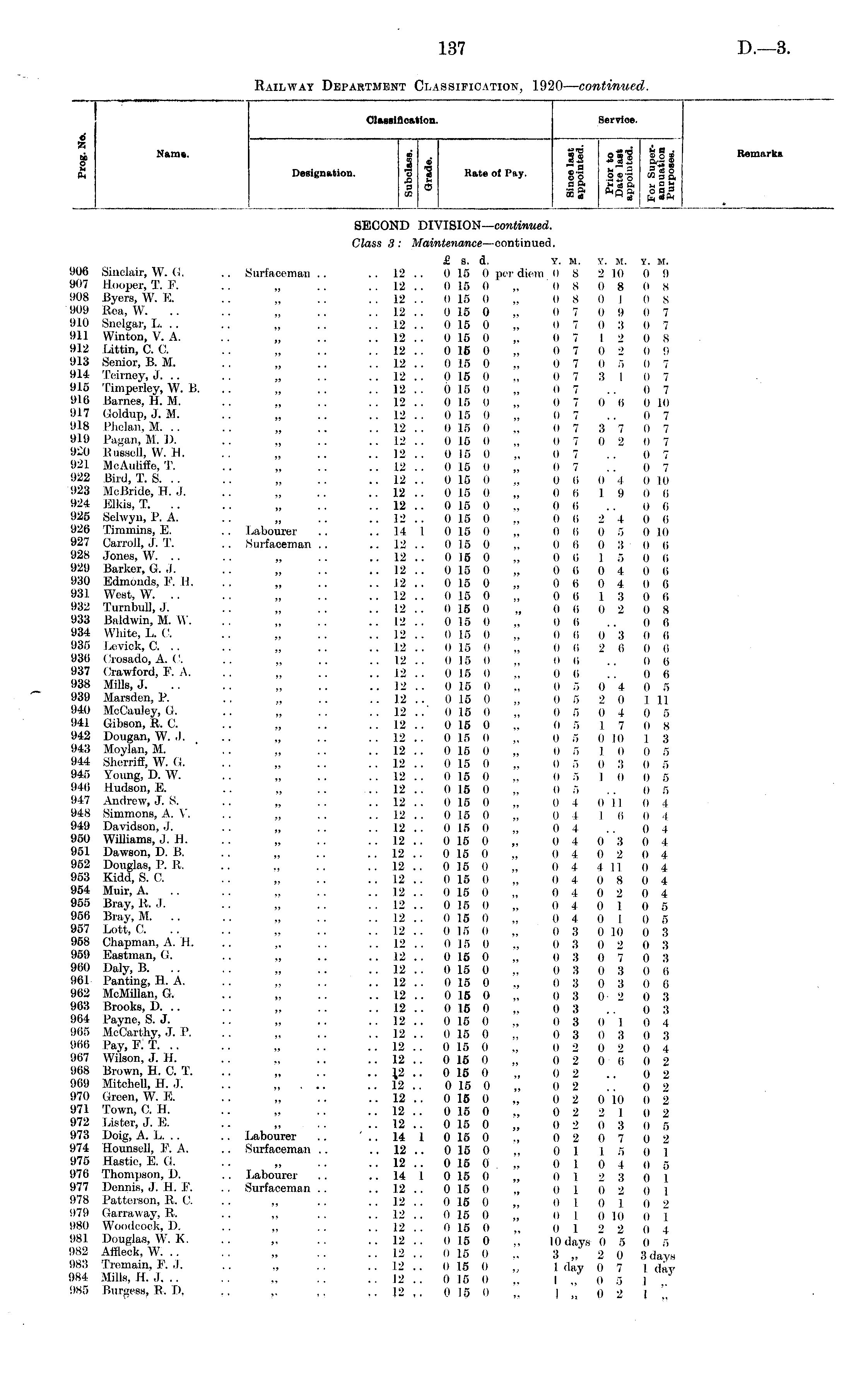 I o* X & Nam*. o B to Design atii Classification. Serviee. -: rtt3 £ 9 rt* I • 3| S £.l HI ion. | I RateofPny. g-g g«-g cogg, rtm a&Srta^air co ° ■£% <frns, Sa? w " M act to "to CI aesifl cation. I 1 A a o co it aft S'l §i-3 B to frreto Service. i. a . 9 O 9 S-~ 9 Hi co 3 a u a n OBS to*to limm Remarks larks Designation. Rate of Pay. SECOND DIVISION— continued. Class 3: Maintenance —continued. 906 Sinclair, W. G, 907 Hooper, T. F. 908 Byers, W. E. 909 Rett, VV. 910 Snelgar, L. .. 911 Winton, V. A. 912 Littin, C C 913 Senior, B. M. 914 Teirney, J. .. 915 Timperley, W. B. 916 Barnes, H. M. 917 Goldup, J. M. 918 Plielan, M. .. 919 Pagan, M. 1). 920 PiiissclJ, W. B. 921 McAuliffe, T. 922 Bird, T. S. .. 923 McBride, 11. .1. 924 Elkis, T. .. 925 Selwyn, P. A. 926 Timmins, E. 927 Carroll, J. T. 928 Jones, W. .. 929 Barker, G. J. 930 Edmonds, F. II. 931 West, W. .. 932 Turnbull, J. 933 Baldwin, M. W. 934 White, L. ('. 935 Lovick, C .. 936 (Jrosado, A. ('. 937 Crawford, F. A. 938 Mills, J. 939 Marsden, P. 940 MoCauley, G. 94.1 Gibson, R. C 942 Dougan, W. ,1. 943 Moylan, M. 944 Sherriff, W. G. 945 young, D. W. 946 Hudson, E. 947 Andrew, J. S. 948 Simmons, A. V. 949 Davidson, J, 950 Williams, ,1. H. 951 Dawson, D. B. 952 Douglas, I'. R. 953 Kidd, S. 0. 954 Muir, A. 955 Bray, R. J. 956 Bray, M. .. 957 Lott, C. 958 Chapman, A. 11. 959 Eastman, G. 960 Daly, B. .. 961 Panting, H. A. 962 McMillan, G. 963 Brooks, D. .. 964 Payne, S. J. 965 McCarthy, J. P. 966 Pay, F: T. .. 967 Wilson, J. H. 968 Brown, H. 0. T. 969 Mitchell, H. J. 970 Green, W. E. 971 Town, C. H. 972 Lister, J. E. 973 Doig, A. L. . . 974 Hounsell, F. A. 975 Hastie, E. G. 976 Thompson, D. 977 Dennis, J. H. F. 978 Patterson, R. C 979 Garraway, R. 980 Woodcook, D. 981 Douglas, W. K. 982 Affleck, W. .. 983 Tromain, F. .1. 984 oVIills, H. J. .. 985 Burgess, R. D. Surfaceman .. ii ■ • ii ■ • ii • ■ ii • • ii • • ii • • ii • - ii ■ - Labourer Surfaceman. .. ii ■ • ii • • Labourer Surfaceman .. Labourer Surfaceman . . i- 11 £ s. d. Y. m. v. m. v. M, .. 12 .. 0 15 0 per diem 0 8 2 10 0 9 .. 12 .. 0 15 0 „ 0 8 0 8 0 8 . . 12 . . 0 15 0 „ 0 S 0 I 0 S .. 12 .. 0 15 0 „ 0 7 0 9 0 7 .. 12 . . 0 15 0 „ 0 7 0 3 0 7 .. 12 .. 0 15 0 „ 0 7 12 0 8 .. 12 .. 0 15 0 „ 0 7 0 2 0 9 .. 12 .. 0 15 0 „ 0 7 0 5 0 7 .. 12 .. 0 15 0 „ 0 7 3 I 0 7 .. 12 .. 0 15 0 „ 0 7 .. 0 7 .. 12 .. 0 15 0 „ 0 7 0 6 0 10 .. 12 .. 0 15 0 „ 0 7 .. 0 7 .. 12 . . 0 15 0 „ 0 7 3 7 0 7 .. 12 .. 0 15 0 „ 0 7 0 2 0 7 .. 12 .. 0 15 0 „ 0 7 .. 0 7 .. 12 .. 0 15 0 „ 0 7 .. 0 7 .. 12 .. 0 15 0 „ 0 6 0 4 0 10 .. 12 .. 0 15 0 „ 0 6 19 0 6 .. 12 .. 0 15 0 „ 0 6 .. 0 6 .. 12 .. 0 15 0 ., 0 6 2 4 0 6 .. 14 1 0 15 0 „ 0 6 0 5 0 10 .. 12 .. 0 15 0 „ 0 6 0 3 0 6 .. 12 .. 0 15 0 „ 0 6 1 5 0 6 .. 12 .. 0 15 0 „ 0 6 0 4 0 6 .. 12 .. 0 15 0 „ 0 6 0 4 0 6 .. 12 .. 0 15 0 „ 0 6 1 3 0 6 .. 12 .. 0 15 0 „ 0 6 0 2 O 8 .. 12 .. 0 15 0 „ 0 6 .. 0 6 .. 12 .. 0 15 0 „ 0 6 0 3 0 6 .. 1.2 .. 0 15 0 „ (I 6 2 6 0 6 .. 12 .. 0 15 0 „ 0 6 .. 0 6 .. 12 .. 0 15 0 ., 0 6 .. 0 6 .. 12 .. 0 15 0 ., 0 5 0 4 0 5 .. 12 .. 0 16 0 „ 0 5 2 0 I 11 .. 12 ..' 0 15 0 „ 0 5 0 4 0 5 .. 12 .. 0 15 0 „ 0 5 17 0 8 .. 12 .. 0 15 0 „ 0 5 0 10 I 3 .. 12 .. 0 15 0 „ 0 5 1 0 0 5 .. 12 .. 0 15 0 „ 0 5 0 3 0 5 .. 12 . . 0 15 0 „ 0 5 1 0 0 5 .. 12 .. 0 15 0 „ 0 5 .. 0 5 .. 12 .. 0 15 0 „ 0 4 Oil 0 4 .. 12 .. 0 15 0 „ 0 .1 1 6 0 1 .. 12 .. 0 15 0 „ 0 4 .. 0 4 .. 12 .. 0 16 0 „ 0 4 0 3 0 4 .. 12 .. 0 15 0 „ 0 4 0 2 0 4 .. 12 .. 0 15 0 „ 0 4 4 11 0 4 .. 12 .. 0 15 0 „ 0 4 0 8 0 4 .. 12 .. 0 15 0 „ 0 4 0 2 0 4 . . 12 .. 0 15 0 „ 0 4 0 1 0 5 -. 12 .. 0 15 0 „ 0 4 0 1 0 5 .. 12 .. 0 15 0 „ 0 3 0 10 0 3 .. 12 .. 0 15 0 „ 0 3 0 2 0 3 .. 12 .. 0 15 0 „ 0 3 0 7 0 3 .. 12 .. 0 15 0 „ 0 3 0 3 0 6 .. 12 .. 0 15 0 ., 0 3 0 3 0 6 .. 12 .. 0 15 0 „ 0 3 0 2 0 3 .. 12 .. 0 15 0 „ 0 3 .. 0 3 .. 12 .. 0 16 0 ., 0 3 0 1 0 4 .. 12 .. 0 15 0 ., 0 3 0 3 0 3 .. 12 . . 0 15 0 ., 0 2 0 2 0 4 .. 12 .. 0 16 0 „ 0 2 0 6 0 2 .. \2 .. 0 15 0 „ 0 2 .. 0 2 .. 12 .. 0 15 0 „ 0 2 .. 0 2 .. 12 .. 0 15 0 „ 0 2 0 10 0 2 .. 12 .. 0 15 0 ., 0 2 2 1 0 2 .. 12 .. 0 15 0 „ 0 2 0 3 0 5 .. 14 1 0 15 0 ., 0 2 0 7 0 2 • • 12 .. 0 15 0 „ 0 I I 5 0 1 •• 12 .. 0 15 0 0 1 0 4 0 5 ■ • 14 I 0 15 0 „ 0 1 2 3 0 1 • • 12 .. 0 15 0 „ 0 1 ()2 (II .. .12 .. 0 15 0 „ 0 1 0 1 0 2 •• 12 .. 0 16 0 „ 0 I 0 10 0 1 • . 12 .. 0 15 0 „ 0 1 2 2 0 4 • • 12 .. 0 1.5 0 ,, 10 days 0 5 0 f, •■ 12 .. 0 15 0 .. 3 „' 2 0 3 days ■• 12 .. 0 15 0 „ I day 0 7 I day .. 12 .. 0 15 0 „ I „ 0 5 | • • 12 ,. 0 15 0 ,. | o 2 1 ',.