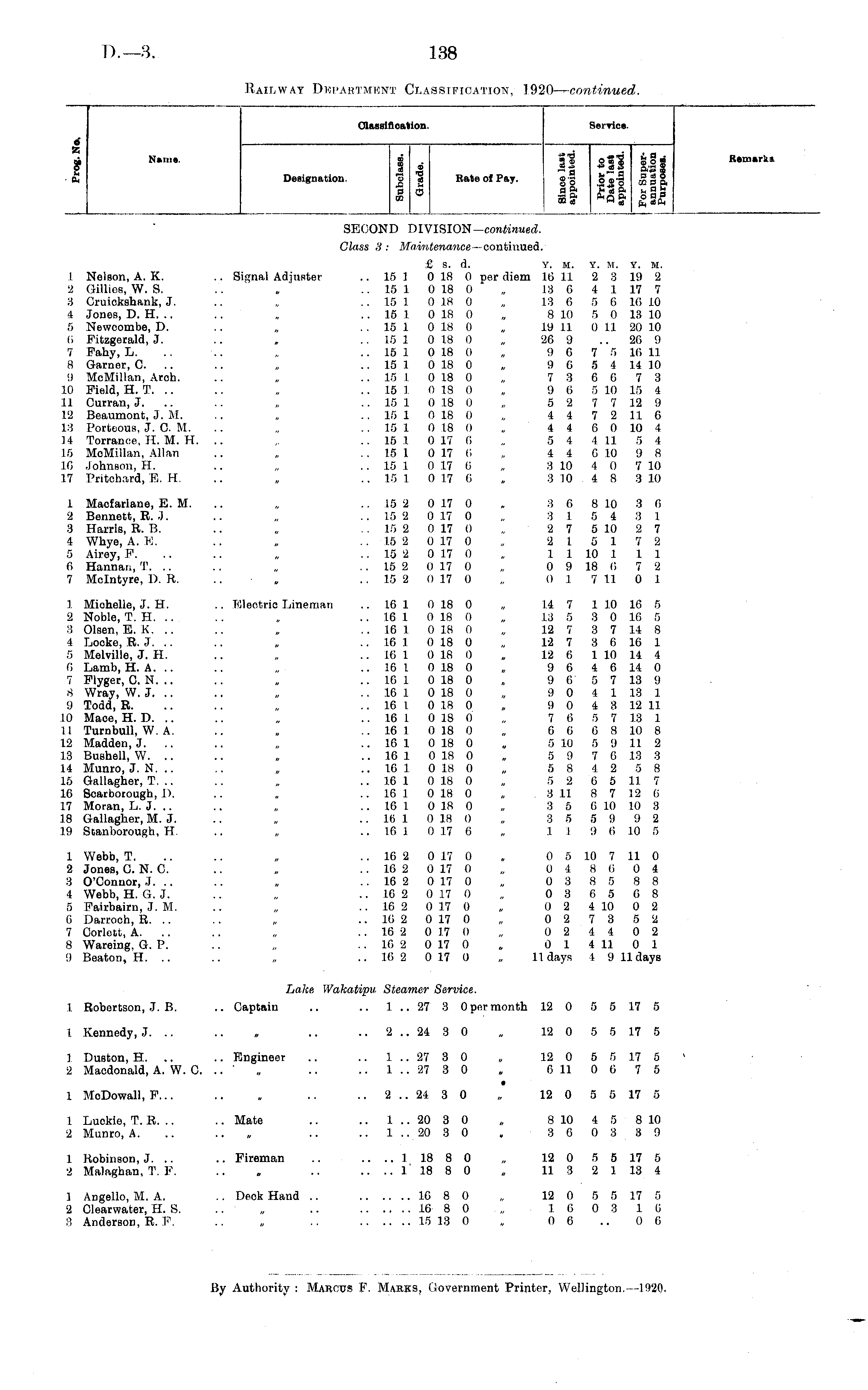 Classification Service. i oil S CM Name. no 1 4 I s Bate of Pay. H"6 "S m a 9 A 9 2 I S" A to CO ctt O of cD K""3 .25 3 fr ti to ton to fr< u i B -i a*, ta B cS 3 co b a 8II to"to Remar.il,i Designation. .—i .,. ' i i l , , „„ ! j, :_— r SECOND DIVISION -continued. CUiss 3: Maintenance - continued. £ s. d. y. m. Y. M. y. M. 1 Nelson, A. K. .. Signal Adjuster .. 15 1 0 18 0 per diem 16 11 2 3 19 2 2 Gillies, W. S. .'. „ .. 15 1 0 18 0 „ 13 6 4 1 17 7 3 Cruiekshank, J. .. „ .. 15 1 0 18 0 „ 13 6 5 6 16 10 4 Jones, D. H. .. .. „ .. 15 1 0 18 0 „ 8 10 5 0 13 10 5 Newcombe, D. .. „ . . 15 1 0 18 0 „ 19 11 0 11 20 10 6 Fitzgerald, J. .. , .. 15 1 0 18 0 „ 26 9 26 9 7 Fahy, L. .. .. „ .. 15 1 0 18 0 „ 9 6 7 5 16 11 8 Garner, 0. .. .. „ .. 15 1 0 18 0 „ 9 6 5 4 14 10 9 McMillan, Aroh. .. „ ..15 1 0 18 0 „ 7 3 6 6 7 3 10 Field, H. T. .. .. „ .. 15 1 0 18 0 „ 9 6 5 10 15 4 11 Curran, J. .. „ .. 15 1 0 18 0 „ 5 2 7 7 12 9 12 Beaumont, J. M. .. „ .. 15 1 0 18 0 „ 4 4 7 2 11 6 18 Porteous, J. O. M. „ .. 15 1 0 18 0 „ 4 4 6 0 10 4 14 Torrance, II. M. H. .. „ .. 15 1 0 17 6 „ 5 4 4 11 5 4 15 McMillan, Allan .. „ .. 15 I 0 17 6 „ 4 4 0 10 9 8 16 Johnson, IT. .. „ .. ,15 1 0 17 6 „ 3 10 4 0 7 10 17 Pritohard, B. H, .. , .. 15 1 0 17 6 „ 8 10". i 8 8 10 1 Macfarlano, E. M. .. „ .. 15 2 0 17 0 ,, 3 6 8 10 3 6 2 Bennett, R. 3. .. „ .. 15 2 0 17 0 „ 3 1 5 4 8 1 3 Harris, R. B. .. „ 15 2 0 17 0 „ 2 7 5 10 2 7 4 Whye, A. E. .. „ .. 1.5 2 0 17 0 „ 2 15 1 7 2 5 Airey, F. .. .. „ .. 15 2 0 17 0 „ 1 1 10 1 1 1 6 Hannan, T. .. .. „ .. 15 2 0 17 0 „ 0 9 18 6 7 2 7 Mclntyre, D. R. .. „ .. 15 2 0 17 0 „ 0 1 7 11 0 1 1 Michelle, J. H. .. Electric Lineman .. 16 1 0 18 0 „ 14 7 1 10 16 5 2 Noble, T. H. .. .. „ .. 16 1 0 18 0 „ 13 5 3 0 16 5 3 Olsen, E. K. .. .. „ .. 16 1 0 18 0 , 12 7 3 7 14 8 4 Locke, R.J. .. .. „ ..16 1 0 18 0 „ 12 7 3 6 16 1 5 Melville, J. H. .. „ .. 1.6 1 0 18 0 „ 12 6 110 14 4 6 Lamb, H. A. .. .. „ .. 16 1 0 18 0 „ 9 6 4 6 14 0 7 Flyger, 0. N. .. .. „ .. 16 1 0 18 0 „ 9 6 5 7 13 9 8 Wray, W. J. .. .. „ .. 16 1 0 18 0 „ 9 0 4 1 13 1 9 Todd, R. .. .. „ .. 16 1 0 18 0 „ 9 0 4 3 12 11 10 Mace, H. D. .. .. „ .. 16 1 0 18 0 „ 7 6 5 7 13 1 11 Turnbull, W. A. .. „ .. 16 1 0 18 0 „ 6 6 6 8 10 8 12 Madden, J. .. .. „ .. 16 1 0 18 0 „ 5 10 5 9 11 2 1.3 Bushell, W. .. .. „ .. 16 1 0 18 0 „ 5 9 7 0 13 3 14 Munro, J.N. .. .. „ ..161 018 0 „ 584258 15 Gallagher, T. .. .. „ .. 16 I 0 18 0 „ 5 2 6 5 11 7 16 Scarborough,!). .. , .. 16 1 0 18 0 „ 3 11 8 7 12 6 17 Moran, L. J, .. .. „ .. 16 1 0 18 0 „ 3 5 6 10 10 3 18 Gallagher, M. J. .. „ .. 16 1 0 18 0 „ 3 5 5 9 9 2 19 Stan borough, H. .. „ .. 16 1 0 17 6 „ 1 I 9 6 10 5 1 Webb, T. .. .. „ .. 16 2 0 17 0 „ 0 5 10 7 11 0 2 Jones, 0. N. 0. .. „ .. 16 2 0 17 0 „ 0 4 8 6 0 4 8 O'Connor, J. .. .. „ .. 16 2 0 17 0 „ 0 3 8 5 8 8 4 Webb, H. G. J. .. „ .. 16 2 0 17 0 „ 0 3 6 5 6 8 5 Fairbairn, J. M. .. „ .. 16 2 0 17 0 „ 0 2 4 10 0 2 0 Darroch, R. .. .. „ .. 16 2 0 17 0 „ 0 2 7 3 5 2 7 Corlett, A. .. „ .. 16 2 0 1.7 0 „ 0 2 4 4 0 2 8 Wareing, G. P. .. „ .. 16 2 0 17 0 , 0 1 4 11 0 1 9 Beaton, H. .. .. „ .. 16 2 0 17 0 „ 11 days 4 9 11 days Lake Wakatipu Steamer Service. 1 Robertson, J. B, .. Captain .. .. 1 .. 27 3 0 per month 12 0 5 5 17 5 1 Kennedy, J. .. .. „ .. .. 2 .. 24 3 0 „ 12 0 5 5 17 5 1 Duston, H. .. .. Engineer .. .. 1 .. 27 3 0 „ 12 0 5 5 17 5 2 Macdonald, A. W. 0. .. „ .. .. 1 .. 27 3 0 „ 6 11 0 6 7 5 1 McDowall, F... .. „ .. .. 2 .. 24 3 0 „ 12 0 5 5 17 5 1 Luckie, T. R. .. .. Mate .. .. 1 .. 20 3 0 „ 8 10 4 5 8 10 2 Munro, A. .. .. .. .. 1 .. 20 3 0 . 3 6 0 3 3 9 1 Robinson, J. .. .. Fireman .. .... 1 18 8 0 „ 12 0 5 5 17 5 2 Malaghan, T. F. .. „ .. .... l' 18 8 0 „ 11 3 2 1 13 4 1 Angello, M. A. .. Deck Hand .. 10 8 0 „ 12 0 5 5 17 5 2 Clearwater, H. B, .. . .. 16 8 0 „ 16 0 3 1 6 8 Anderson, R. P, .. „ .. 15 13 0 „ 0 6 .. 0 6 8