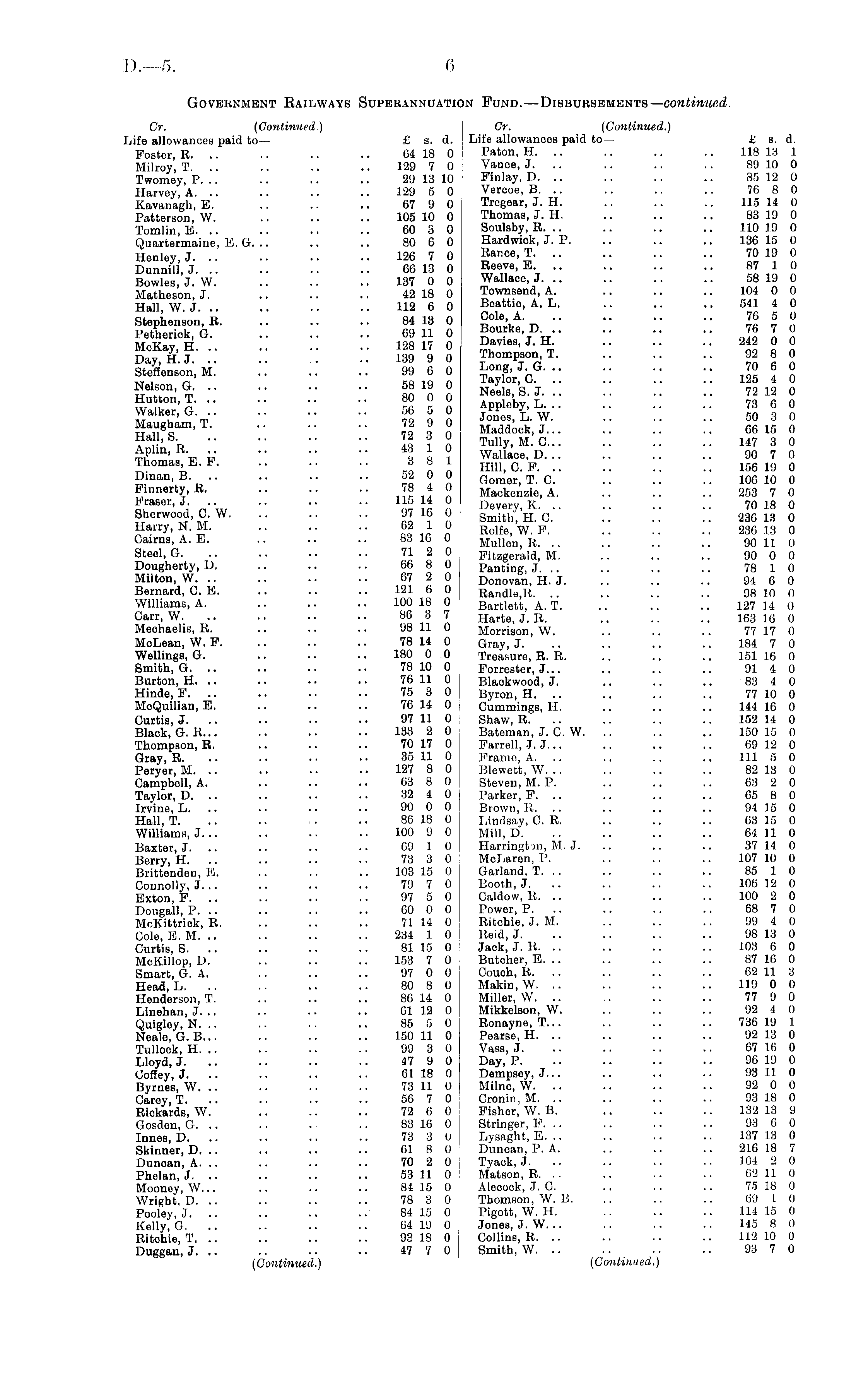 Government Eailways Superannuation Fund.—Disbursements— continued. Cr. (Continued.) Gr. (Continued.) Life allowances paid to— £ s. d. Life allowances paid to— £ s. d. Fostor, R. .. .. .. .. 64 18 0 Paton, H. .. .. .. .. 118 13 1 Milroy, T. .. .. .. .. 129 7 0 Vance, J. .. .. .. .. 89 10 0 Twomey, P. .. .. .. .. 29 13 10 Finlay, D. .. .. .. .. 85 12 0 Harvey, A. .. .. .. .. 129 5 0 Vercoe, B. .. .. .. .. 76 8 0 Kavanagh, E. .. .. .. 67 9 0 Tregear, J. H. .. .. .. 115 14 0 Patterson, W. .. .. .. 105 10 0 Thomas, J. H. .. .. .. 83 19 0 Tomlin, E. .. .. .. .. 60 3 0 Soulsby, R. .. .. .. .. 110 19 0 Quartermaine, E.G... .. .. 80 6 0 Hardwiok, J. P. .. .. .. 136 15 0 Henley, J 126 7 0 Ranee, T 70 19 0 Dunnill, J 66 13 0 Reeve, E 87 1 0 Bowles, J. W. .. .. .. 137 0 0 Wallace, J. .. .. .. .. 58 19 0 Matheson, J. 42 18 0 £ ow °? 4. l?f 9 S Hall, W. J. .. .. .. .. 112 6 0 Beattie, A. L. .. .. .. 541 4 0 Stephenson, R 84 13 0 ° ole > A - _ 76 5 0 Petheriok.G 69 11 0 D. TO 7 0 McKay.H 128 17 0 Navies, J. H 242 0 0 Day.H.J 139 9 0 T 92 8 0 Steffenson.M 99 6 0 Long, J G 70 6 0 xt i n kg 10 n Taylor, C. .. .. .. .. 125 4 0 5222: £ & 19 a o Neels.S.J 72 12 0 a t°"'n ?? n n Appleby, L 73 6 0 Walker, G 56 5 0 ,™ 0 £ w 50 3 0 Maugbam.T 72 9 0 j 66 15 0 * ~' „ A i n Tully, M. C 147 3 0 AP lin > l4 - ■• 4 ? 1 0 Wa £ c D 90 7 0 Thomas E.F 3 8 1 Hill> 0 . F IG6 la 0 Dinan, B. .. .. .. .. o2 0 0 Qomer, T. C. .. .. .. 106 10 0 Finnerty.R. .8 4 0 Mackenzie, A 253 7 0 Eraser, J. .. 115 14 0 Deve ry, X 70 18 0 Sherwood, C.W 9, 16 0 Bm ith, H. C 236 13 0 Harry, N. M 62 1 0 Ro i £e , W . F. 236 13 0 Cairns, A. E. 83 16 0 Mullen, R 90 11 0 Steel, G. .. 71 2 0 Fitzgerald, M. .. .. .. 90 0 0 Dougherty, D. .. .. .. 66 8 0 Panting, J. .. .. .. .. 78 1 0 Milton, W. .. .. .. .. 67 2 0 Donovan, H. J. .. .. .. 94 6 0 Bernard, C. E. .. .. .. 121 6 0 R a ndle,R. .. .. .. .. 98 10 0 Williams, A. .. .. .. 100 18 0 Bartlett, A. T. .. .. .. 127 14 0 Carr, W. .. .. .. .. 80 3 7 Harte, J. R. .. .. .. 163 10 0 Meohaelis, R. .. .. .. 98 11 0 Morrison, W. .. .. .. 77 17 0 MoLean, W. F. .. .. .. 78 14 0 Gray, J. .. .. .. .. 184 7 0 Wellingß, G. .. .. .. 180 0 0 Treasure, R. R. .. .. .. 151 10 0 Smith, G. .. .. .. .. 78 10 0 Forrester, J... .. .. .. 91 4 0 Burton, H. .. .. .. .. 76 11 0 Blaokwood, J. .. .. .. 83 4 0 Hinde, F. .. .. .. .. 75 3 0 Byron, H. .. .. .. .. 77 10 0 McQuillan, E. .. .. .. 76 14 0 Cummings, H. .. .. .. 144 16 0 Curtis, J. .. .. .. .. 97 11 0 Shaw, R. .. .. .. .. 152 14 0 Black, G. R... .. .. •• 133 2 0 Bateman, J. C. W. .. .. .. 150 15 0 Thompson, R. .. .. .. 70 17 0 Farrell, J. J... .. .. .. 69 12 0 Gray, R. .. .. .. •• 35 11 0 Frame, A. .. .. .. .. 11l 5 0 Peryer, M. .. .. .. .. 127 8 0 Blewett, W. .. .. .. .. 82 13 0 Campboll, A. .. .. .. 63 8 0 Steven, M. P. .. .. .. 63 2 0 Taylor, D. .. .. .. .. 32 4 0 Parker, F. .. .. .. .. 65 8 0 Irvine, L. .. .. .. .. 90 0 0 Brown, R. .. .. .. .. 94 15 0 Hall, T. .. .. ~ .. 86 18 0 Lindsay, C. R. .. .. .. 63 15 0 Williams, J... .. .. .. 100 9 0 Mill, D. .. .. .. .. 64 11 0 Baxter, J. .. .. .. .. 09 1 0 Harrington, M. J. .. .. .. 37 14 0 Berry, H. .. .. .. . • 73 3 0 McLaren, P. .. .. .. 107 10 0 Brittonden, E. .. .. .. 103 15 0 Garland, T. .. .. .. .. 85 1 0 Connolly, J... .. .. .. 79 7 0 Booth, J. .. .. .. .. 106 12 0 Exton, F. .. .. .. .. 97 5 0 Caldow, R. .. .. .. .. 100 2 0 Dougall, P. .. .. .. .. 60 0 0 Power, P. .. .. .. .. 68 7 0 McKittriok, R. .. .. .. 71 14 0 Ritchie, J. M. .. .. .. 99 4 0 Cole, E. M. .. .. .. .. 234 1 0 I Reid, J. .. .. .. .. 98 13 0 Curtis, S. .. .. .. .. 81 15 0 ' Jack, J. It. .. .. .. .. 103 6 0 McKillop, D. .. .. .. 153 7 0 Butcher, E. .. .. .. .. 87 16 0 Smart, G. A. .. .. .. 97 0 0 Couoh, R. .. .. .. .. 62 11 3 Head, L. .. .. .. .. 80 8 0 Makin, W. .. .. .. .. 119 0 0 Henderson, T. .. .. .. 86 14 0 Miller, W. .. .. .. 77 9 0 Linehan, J. .. .. .. .. 61 12 0 Mikkelson, W. .. .. .. 92 4 0 Quigloy, N. .. .. .. .. 85 5 0 Ronayne, T... .. .. .. 736 19 1 Neale, G. 8... .. .. .. 150 11 0 Pearse, H. .. .. .. .. 92 13 0 Tullock, H. .. .. .. .. 99 3 0 Vass, J. .. .. .. .. 67 16 0 Lloyd, J. .. .. .. 47 9 0 Day, P. .. .. .. .. 96 19 0 Coffey, J. .. .. .. .. 61 18 0 Dempsey, J... .. .. .. 93 11 0 Byrnes, W. .. .. .. .. 73 11 0 Milne, W. .. .. .. .. 92 0 0 Carey, T. .. .. .. .. 56 7 0 Cronin, M. .. .. .. .. 93 18 0 Riokards, W. .. .. .. 72 6 0 Fisher, W. B. .. .. .. 132 13 9 Gosdon, G. .. .. .. .. 83 16 0 j Stringer, F. .. .. .. .. 93 6 0 Innes, D. .. .. .. .. 73 3 U Lysaght, E. .. .. .. .. 137 13 0 Skinner, D. .. .. .. .. 61 8 0 Duncan, P. A. .. .. .. 216 18 7 Dunoan, A. .. .. .. .. 70 2 0 Tyack, J. .. .. .. 104 2 0 Phelan, J. .. .. .. .. 53 11 0 Matson, R. .. .. .. .. 62 11 0 Mooney.W... .. .. .. 8115 0 Aleoock, J. C. .. .. .. 75 18 0 Wright, D. .. .. .. .. 78 3 0 Thomson, W. B. .. .. .. 69 1 0 Pooley, J. .. .. .. .. 84 15 0 Pigott, W. H. .. .. .. 114 15 0 Kelly, G. .. .. .. ■• 64 19 0 Jones, J. W... .. .. .. 145 8 0 Ritohie, T. .. .. .. .. 93 18 0 Collins, R. .. .. .. .. 112 10 0 Duggan, J. .. .. .. .. 47 7 0 I Smith, W. .. .. .. .. 93 7 0 (Continued.) (Continued.)
