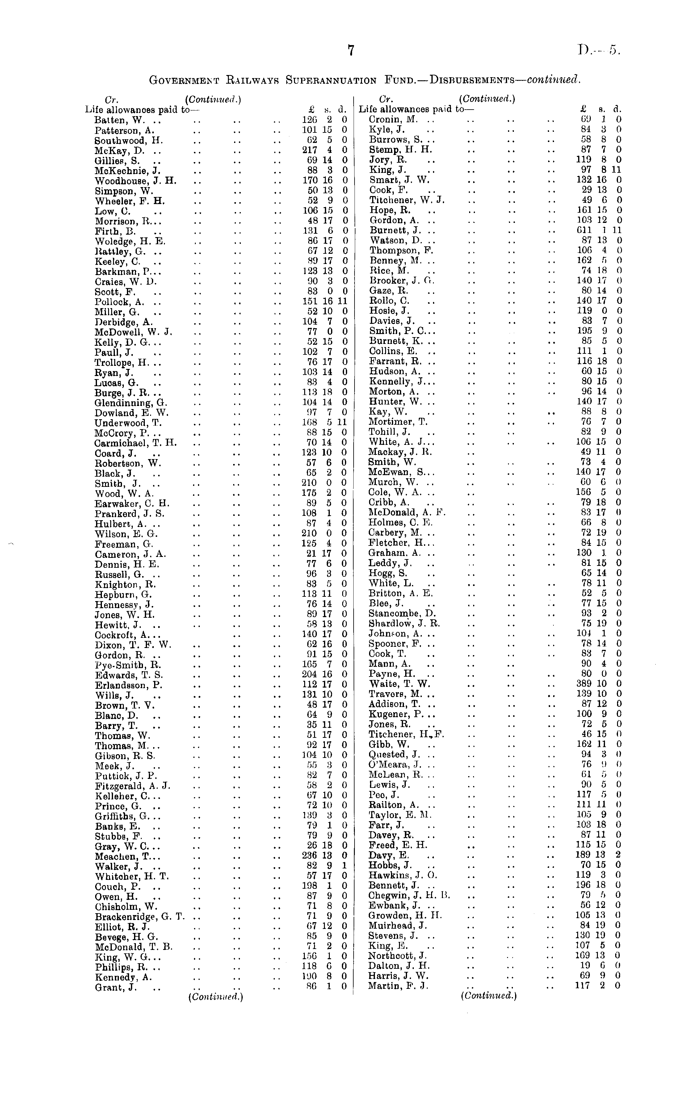 Government Eailways Superannuation Fund. —Disbursements — continued. Cr. (Continued.) Cr. (Continued.) Life allowanoes paid to— £ s. d. Life allowances paid to— £ s. d. Batten, W. .. .. .. .. 126 2 0 Cronin, M. .. .. .. .. 69 1 0 Patterson, A. .. .. .. 101 15 0 Kyle, J. .. .. .. .. 84 3 0 Southwood, H. .. .. .. 02 5 0 Burrows, S. .. .. .. .. 58 8 0 McKay, D. .. .. .. .. 217 4 0 Stemp, H. H. .. .. .. 87 7 0 Gillies, S. .. .. .. .. 69 14 0 Jory, R. .. .. .. .. 119 8 0 McKechnie, J. .. .. . - 88 3 0 King, J. .. .. .. .. 97 811 Woodhouse, J. H. .. .. .. 170 16 0 Smart, J. W. .. .. .. 132 16 0 Simpson, W. .. .. .. 50 13 0 Cook, F. .. .. .. .. 29 13 0 Wheeler, F. H. .. .. .. 52 9 0 Titchener, W. J. .. .. .. 49 6 0 Low, C. .. .. .. .. 106 15 0 Hope, R. .. .. .. .. 161 15 0 Morrison, R... .. .. .. 48 17 0 Gordon, A. .. .. .. .. 103 12 0 Firth, B. .. .. .. .. 131 6 0 Burnett, J. .. .. .. .. 611 111 Woledge, H. E. .. .. .. 86 17 0 Watson, D... .. .. .. 87 13 0 Rattley, G. .. .. .. .. 67 12 0 Thompson, F. .. .. .. 106 4 0 Keeley, C. .. .. .. .. 89 17 0 Benney, M. .. .. .. .. 162 5 0 Barkman.P... .. .. .. 123 13 0 Rice, M. .. .. .. .. 74 18 0 Craies, W. D. .. .. .. 90 3 0 Brooker, J. G. .. .. .. 140 17 0 Scott, F. .. .. .. .. 83 0 0 Gaze, R. .. .. .. .. 80 14 0 Pollock, A. .. .. .. .. 151 16 11 Rollo, C. .. .. .. .. 140 17 0 Miller, G. .. .. • • .. 52 10 0 Hosie, J. .. .. .. 119 0 0 Derbidge, A. .. . .. .. 104 7 0 Da vies, J. .. .. .. .. 83 7 0 McDowell, W. J. .. .. .. 77 0 0 Smith, P. C... .. 195 9 0 Kelly, D. G. .. .. •• .. 52 15 0 Burnett, K. .. .. .. .. 85 5 0 Paull, J. .. .. •• •■ 102 7 0 Collins, E. .. .. .. .. 11l 1 0 Trollope, H. .. .. .. .. 76 17 0 Farrant, R. .. .. .. .. 116 18 0 Ryan, J. .. .. • • .. 103 14 0 Hudson, A. .. .. .. .. 60 15 0 Luoas, G. .. .. •• .. 83 4 0 Kennelly, J... .. .. .. 80 15 0 Burge, J. R. .. .. •• .. 113 18 0 Morton, A. .. .. .. .. 96 14 0 Glendinning, G. .. .. .. 104 14 0 Hunter, W. .. .. .. 140 17 0 Dowland, E. W 97 7 0 Kay, W 88 8 0 Underwood, T. .. .. .. 108 511 Mortimer, T. .. .. .. 70 7 0 McCrory, P. .. .. .. .. 88 15 0 Tohill, J. .. .. .. 82 9 0 Carmiohael, T. H. .. .. .. 70 14 0 White, A. J... .. .. .. 106 15 0 Coard, J. •. •. .. 123 10 0 Maokay, J. R. .. 49 11 0 Robertson, W. .. .. .. 57 6 0 Smith, W. .. .. .. 73 4 0 Black, J. .. .. •■ .. 65 2 0 MoEwan, 5... .. .. .. 140 17 0 Smith, J. .. .. .. .. 210 0 0 Murch, W. .. .. .. .. 00 0 0 Wood, W. A. .. .. .. 175 2 0 i Cole, W. A. .. .. 156 5 0 Earwaker, C. H. .. .. .. 89 5 0 Cribb, A. .. .. .. 79 18 0 Prankord, J. S. .. .. .. 108 1 0 McDonald, A. F. .. .. .. 83 17 0 Hulbert, A. .. .. .. .. 87 4 0 Holmes, C. E. .. .. .. 66 8 0 Wilson, E. G. .. .. .. 210 0 0 Carbery, M. .. .. .. .. 72 19 0 Freeman, G. ... •• ■■ 125 4 0 Fletcher, H... .. .. .. 84 15 0 Cameron, J. A. .. .. .. 21 17 0 Graham. A. .. .. .. .. 130 1 0 Dennis, H. E. .. .. .. 77 6 0 Leddy, J. .. .. .. .. 81 15 0 Russell, G. .. • • • ■ ■ ■ 96 3 0 Hogg, S. .. .. .. 65 14 0 Knighton, R. .. .. .. 83 5 0 White, L. .. .. .. .. 78 11 0 Hepburn, G. .. .. .. 11.3 11 0 Britton, A. E. .. .. .. 52 5 0 Hennessy, J. .. .. .. 76 14 0 Blee, J. .. .. .. .'. 77 15 0 Jones, W. H. .. .. .. 89 17 0 Stancombe, D. .. .. .. 93 2 0 Hewitt, J. .. .. .. .. 58 13 0 Shardlow, J. R. .. .. 75 19 0 Cockroft, A. .. .. .. 140 17 0 Johnson, A... .. .. .. 101 1 0 Dixon, T. F. W. .. .. .. 62 16 0 Spooner, F. .. .. .. .. 78 14 0 Gordon, R. .. .. .. .. 91 15 0 Cook, T. .. .. .. .. 83 7 0 Pye-Smitb, R. .. .. .. 165 7 0 Mann, A. .. .. .. 90 4 0 Edwards, T. S. .. .. .. 204 16 0 Payne, H. .. .. .. .. 80 0 0 Erlandsson, P. .. .. .. 112 17 0 Waite, T. W. .. .. .. 389 10 0 Wills, J. .. .. •• .. 131 10 0 Travore, M. .. .. .. .. 139 10 0 Brown, T. V. .. •• •• 48 17 0 Addison, T. .. .. .. .. 87 12 0 Blanc, D. .. .. •. .. 04 9 0 Kugener, P. .. .. .. .. 100 9 0 Barry, T. .. .. • • • • 35 11 0 Jones, R. .. .. .. 72 5 0 Thomas, W. .. .. .. 51 17 0 Titchener, lI,F. .. .. .. 46 15 0 Thomas, M. .. .. .. .. 92 17 0 Gibb, W. .. .. .. .. 162 11 0 Gibson, R. S. .. • • •. 104 10 0 Quested, J. .. .. .. .. 94 3 0 Meek, J. .. • ■ • • 55 3 0 O'Meara, J. .. .. .. .. 76 9 0 Puttiok, J. P. •• •• •• 82 7 0 McLean, R... .. .. .. 01 5 0 Fitzgerald, A. J. .. .. .. 58 2 0 Lewis, J. .. .. .. .. 90 5 0 Kelleber, C. .. .. .. .. 67 10 0 Peo, J. .. .. .. .. 117 5 0 Prince, G. .. •■ •• •■ 72 10 0 Railton, A. .. .. .. .. 11l 11 0 Griffiths, G. .. .. .. .. 139 3 0 Taylor, E. M. .. .. .. 105 9 0 Banks, E. .. .. .. .. 79 1 0 Farr, J. .. .. .. .. 103 18 0 Stubbs, F 79 9 0 Davey, R 87 11 0 Gray, W. C. .. .. .. .. 26 18 0 Freed, E. H. .. .. .. 115 15 0 Meachen, T... .. .. .. 236 13 0 Davy, E. .. .. .. .. 189 13 2 Walker, J. .. .. .. .. 82 9 1 Hobbs, J. .. .. .. .. 70 15 0 Whitoher, H. T. .. .. .. 57 17 0 Hawkins, J. O. .. .. .. 119 3 0 Couoh, P. .. .. .. .. 198 1 0 Bennett, J. .. .. .. .. 196 18 0 Owen, H. .. .. .. .. 87 9 0 Chegwin, J. H. B. .. .. 79 5 0 Ohisholm, W. .. .. .. 718 0 Ewbank, J. .. .. .. .. 56 12 0 Brackenridge, G. T. .. .. .. 71 9 0 Growden, H. 11. .. .. ~ 105 13 0 Elliot, R. J. .. .. .. 07 12 0 Muirhead.J. .. .. .. 84 19 0 Bevege, H. G. .. .. .. 85 9 0 Stevens, J. .. .. .. .. 130 19 0 McDonald, T. B. .. .. .. 71 2 0 King, E. .. .. .. .. 107 5 0 King, W. G... .. .. .. 156 1 0 Northcott, J. .. .. .. 169 13 0 Phillips, R... .. .. ..' 118 6 0 Dalton, J. H. .. .. .. 19 6 0 Kennedy, A. .. .. .. 190 8 0 Harris, J. W. .. .. .. 69 9 0 Grant, J. .. .. .. •• 86 1 0 Martin, F. J. .. .. .. 117 2 0 (Continued.) (Continued.)