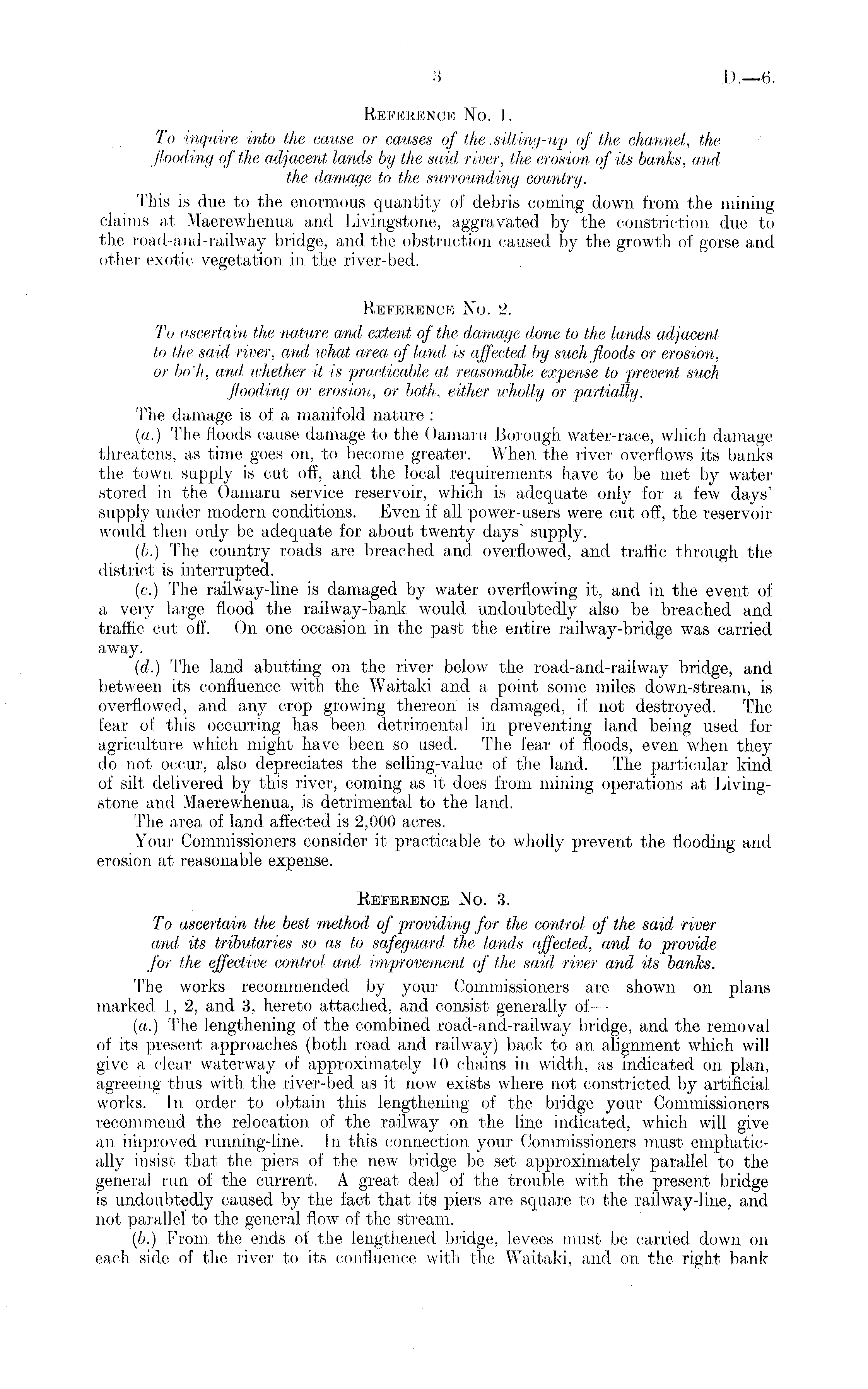 Reference No. 1. To inquire into the cause or causes of the .silting-up of the channel, the flooding of the adjacent lands by the said river, the erosion of its banks, and the damage to the surrounding country. This is due to the enormous quantity of debris coming down from, the mining claims at Maerewhenua and Livingstone, aggravated by the constriction due to the road-and-railway bridge, and the obstruction caused by the growth of gorse and. other exotic vegetation in the river-bed. Reference No. 2. To ascertain the nature and extent of the damage done to the lands adjacent to the said river, and ivhat area of land is affected by such floods or erosion, or boh, and whether it is practicable at reasonable expense to prevent such flooding or erosion, or both, either wholly or partially. The damage is of a manifold nature : (a.) The floods cause damage to the Oamaru Borough water-race, which damagethreatens, as time goes on, to become greater. When the river overflows its banks the town supply is cut off, and the local requirements have to be met by water stored in the Oamaru service reservoir, which is adequate only for a few days' supply under modern conditions. Even if all power-users were cut off, the reservoir' would then, only be adequate for about twenty days' supply. (L.) The country roads are breached and overflowed, and traffic through the district is interrupted. (c.) The railway-line is damaged by water overflowing it, and in the event of a, very large flood the rail way-bank would undoubtedly also be breached and traffic cut off. On one occasion in the past the entire railway-bridge was carried away. (d.) The land abutting on the river below the road-and-railway bridge, and between its confluence with the Waitaki and a point some miles down-stream, is overflowed, and any crop growing thereon is damaged, if not destroyed. The fear of this occurring has been detrimental in preventing land being used for agriculture which might have been so used. The fear of floods, even when they do not occur, also depreciates the selling-value of the land. The particular kind of silt delivered by this river, coming as it does from mining operations at Livingstone and Maerewhenua, is detrimental to the land. The area of land affected is 2,000 acres. Your Commissioners consider it practicable to wholly prevent the flooding and erosion at reasonable expense. Reference No. 3. To ascertain the best method of providing for the control of the said river a,nd, its tributaries so as to safeguard the lands affected, and to provide for the effective control and improvement of the said river and its banks. The works recommended by your Commissioners are shown on plans marked 1, 2, and 3, hereto attached, and consist generally of— (a.) The lengthening of the combined road-and-railway bridge, and the removal of its present approaches (both road and railway) back to an alignment which will give a clear waterway of approximately 10 chains in. width, as indicated on plan, agreeing thus with the river-bed as it now exists where not constricted by artificial works. In order to obtain, this lengthening of the bridge your Commissioners recommend the relocation of the railway on the line indicated, which, will give an improved running-line. In this connection your Commissioners must emphatically insist that the piers of the new bridge be set approximately parallel to the general run of the current. A great deal of the trouble with the present bridge is undoubtedly caused by the fact that its piers are square to the railway-line, and not parallel, to the general flow of the stream. (b.) From the ends of the lengthened bridge, levees must be carried down on each side of the river to its confluence with the Waitaki, and on the right bank