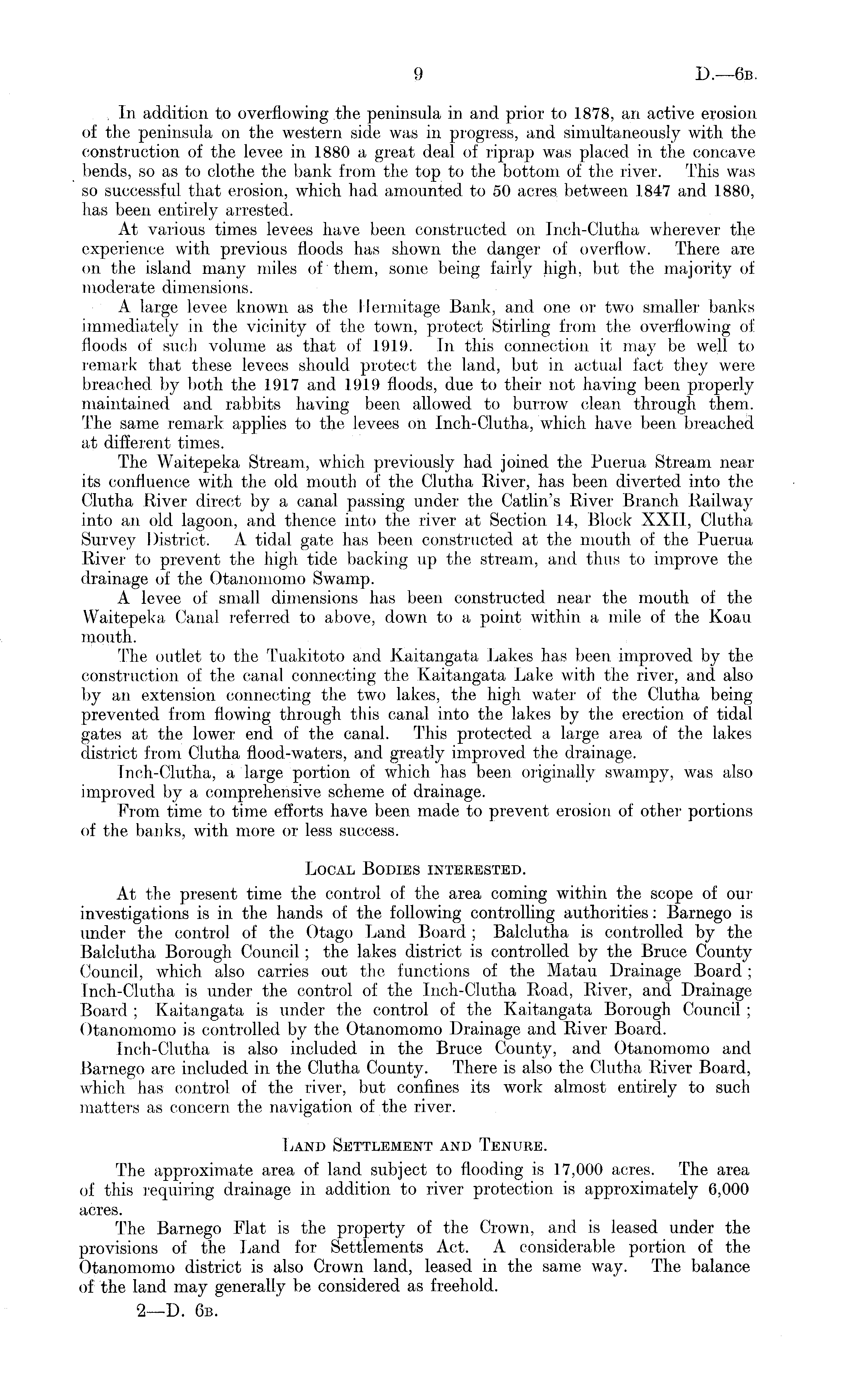 , In addition to overflowing the peninsula in and prior to 1878, an active erosion of the peninsula on the western side was in progress, and simultaneously with the construction of the levee in 1880 a great deal of riprap was placed in the concave bends, so as to clothe the bank from the top to the bottom of the river. This was so successful that erosion, which had amounted to 50 acres between 1847 and 1880, has been entirely arrested. At various times levees have been constructed on Inch-Clutha wherever the experience with previous floods has shown the danger of overflow. There are on the island many miles of them, some being fairly high, but the majority of moderate dimensions. A large levee known as the Hermitage Bank, and one or two smaller banks immediately in the vicinity of the town, protect Stirling from the overflowing of floods of such volume as that of 1919. In this connection it may be well to remark that these levees should protect the land, but in actual fact they were breached by both the 1917 and 1919 floods, due to their not having been properly maintained and rabbits having been allowed to burrow clean through them. The same remark applies to the levees on Inch-Clutha, which have been breached at different times. The Waitepeka Stream, which previously had joined the Puerua Stream near its confluence with the old mouth of the Clutha River, has been diverted into the Clutha River direct by a canal passing under the Catlin's River Branch Railway into an old lagoon, and thence into the river at Section 14, Block XXII, Clutha Survey District. A tidal gate has been constructed at the mouth of the Puerua River to prevent the high tide backing up the stream, and thus to improve the drainage of the Otanomomo Swamp. A levee of small dimensions has been constructed near the mouth of the Waitepeka Canal referred to above, down to a point within a mile of the Koau mouth. The outlet to the Tuakitoto and Kaitangata Lakes has been improved by the construction of the canal connecting the Kaitangata Lake with the river, and also by an extension connecting the two lakes, the high water of the Clutha being prevented from flowing through this canal into the lakes by the erection of tidal gates at the lower end of the canal. This protected a large area of the lakes district from Clutha flood-waters, and greatly improved the drainage. Inch-Clutha, a large portion of which has been originally swampy, was also improved by a comprehensive scheme of drainage. From time to time efforts have been made to prevent erosion of other portions of the banks, with more or less success. Local Bodies interested. At the present time the control of the area coming within the scope of our investigations is in the hands of the following controlling authorities: Barnego is under the control of the Otago Land Board ; Balclutha is controlled by the Balclutha Borough Council; the lakes district is controlled by the Bruce County Council, which also carries out the functions of the Matau Drainage Board ; Inch-Clutha is under the control of the Inch-Clutha Road, River, and Drainage Board ; Kaitangata is under the control of the Kaitangata Borough Council ; Otanomomo is controlled by the Otanomomo Drainage and River Board. Inch-Clutha is also included in the Bruce County, and Otanomomo and Barnego are included in the Clutha County. There is also the Clutha River Board, which has control of the river, but confines its work almost entirely to such matters as concern the navigation of the river. Land Settlement and Tenure. The approximate area of land subject to flooding is 17,000 acres. The area of this requiring drainage in addition to river protection is approximately 6,000 acres. The Barnego Flat is the property of the Crown, and is leased under the provisions of the Land for Settlements Act. A considerable portion of the Otanomomo district is also Crown land, leased in the same way. The balance of the land may generally be considered as freehold.