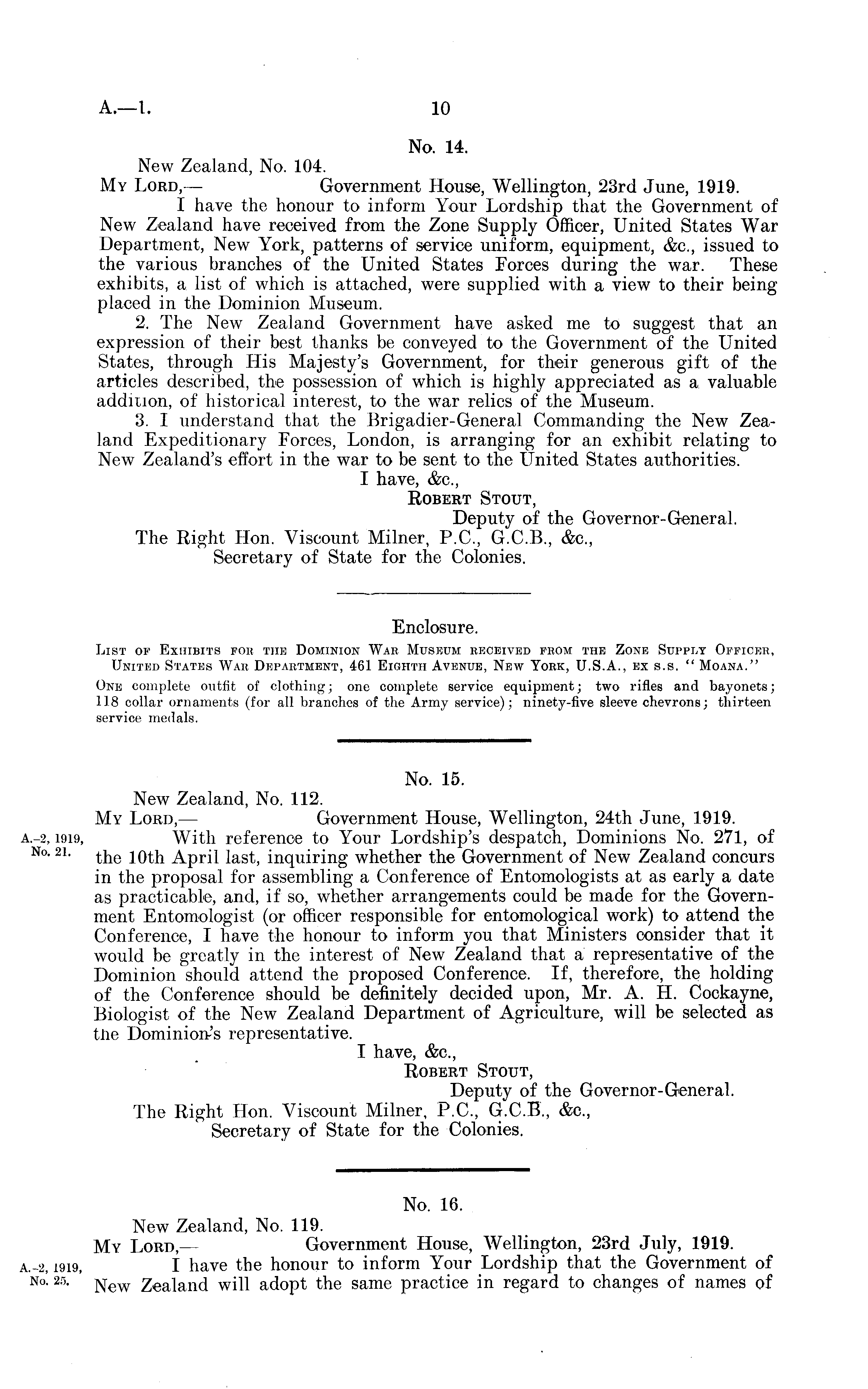 No. 14. New Zealand, No. 104. My Lord, — Government House, Wellington, 23rd June, 1919. I have the honour to inform Your Lordship that the Government of New Zealand have received from the Zone Supply Officer, United States War Department, New York, patterns of service uniform, equipment, &c, issued to the various branches of the United States Forces during the war. These exhibits, a list of which is attached, were supplied with a view to their being placed in the Dominion Museum. 2. The New Zealand Government have asked me to suggest that an expression of their best thanks be conveyed to the Government of the United States, through His Majesty's Government, for their generous gift of the articles described, the possession of which is highly appreciated as a valuable addition, of historical interest, to the war relics of the Museum. 3. I understand that the Brigadier-General Commanding the New Zealand Expeditionary Forces, London, is arranging for an exhibit relating to New Zealand's effort in the war to be sent to the United States authorities. I have, &c, Robert Stout, Deputy of the Governor-General. The Right Hon. Viscount Milner, P. 0., G.C.8., &c, Secretary of State for the Colonies.