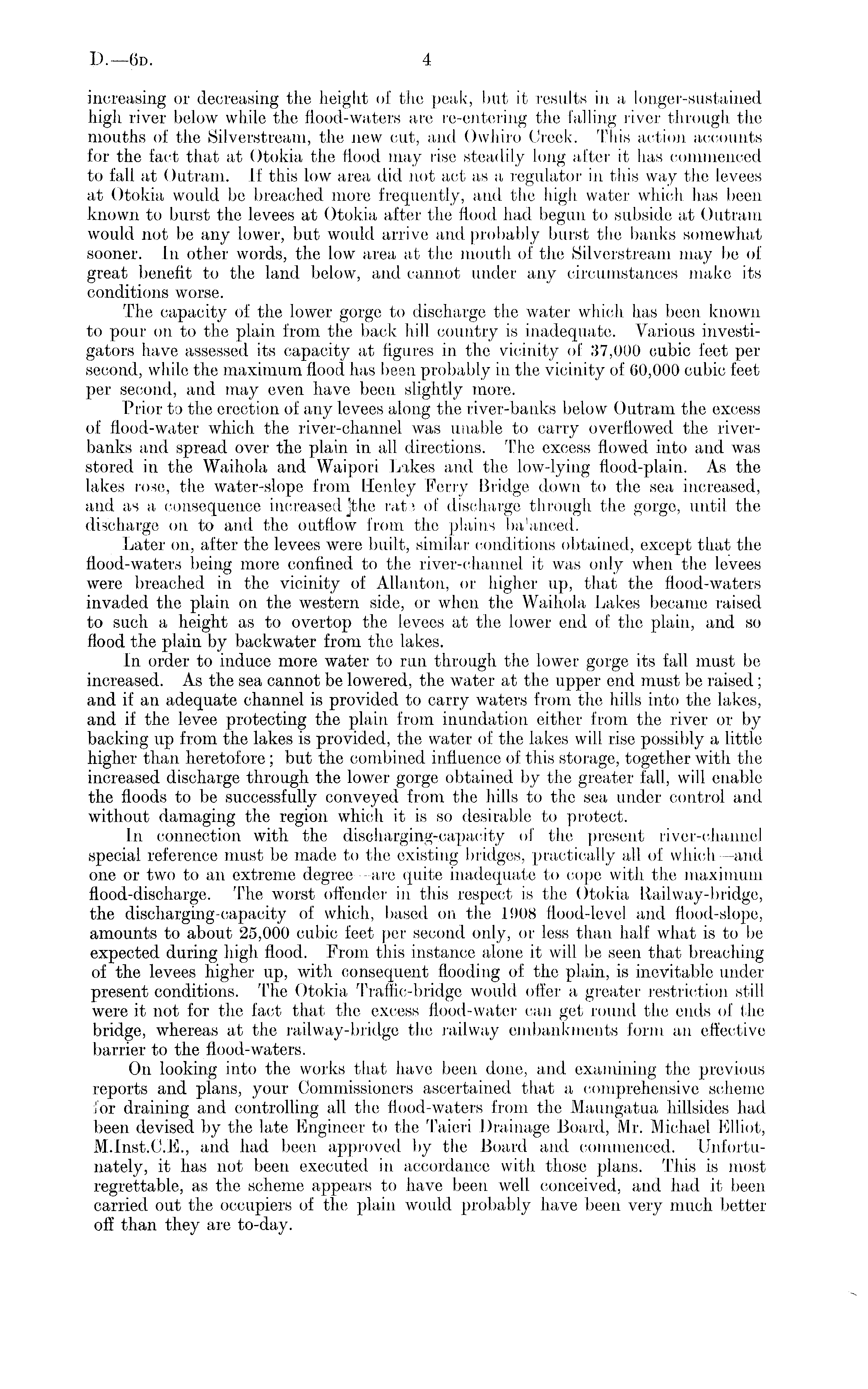 increasing or decreasing the height of the peak, but it results in a longer-sustained high river below while the flood-waters are re-entering the falling river through the mouths of the Silverstream, the new cut, and Owhiro Creek. This action accounts for the fact that at Otokia the flood may rise steadily long alter it has commenced to fall at Outram. If this low area did not act as a regulator in this way the levees at Otokia would be breached more frequently, and the high water which has been known to burst the levees at Otokia after the flood had begun to subside at Outram would not be any lower, but would arrive and probably burst the banks somewhat sooner. In other words, the low area at the mouth of the Silverstreani may be of great benefit to the land below, and cannot under any circumstances make its conditions worse. The capacity of the lower gorge to discharge the water which has been known to pour on to the plain from the back hill country is inadequate. Various investigators have assessed its capacity at figures in the vicinity of 37,000 cubic feet per second, while the maximum flood has been probably in the vicinity of 60,000 cubic feet per second, and may even have been slightly more. Prior to the erection of any levees along the river-banks below Outram the excess of flood-water which the river-channel was unable to carry overflowed the riverbanks and spread over the plain in all directions. The excess flowed into and was stored in the Waihola and Waipori Lakes and the low-lying flood-plain. As the lakes rose, the water-slope from Henley Perry Bridge down to the sea increased, and as a consequence increased jthe rat?, of discharge through the gorge, until the discharge on to and the outflow from the plains balanced. Later on, after the levees were built, similar conditions obtained, except that the flood-waters being more confined to the river-channel it was only when the levees were breached in the vicinity of Allauton, or higher up, that the flood-waters invaded the plain on the western side, or when the Waihola Lakes became raised to such a height as to overtop the levees at the lower end of the plain, and so flood the plain by backwater from the lakes. In order to induce more water to run through the lower gorge its fall must be increased. As the sea cannot be lowered, the water at the upper end must be raised; and if an adequate channel is provided to carry waters from the hills into the lakes, and if the levee protecting the plain from inundation either from the river or by backing up from the lakes is provided, the water of the lakes will rise possibly a little higher than heretofore; but the combined influence of this storage, together with the increased discharge through the lower gorge obtained by the greater fall, will enable the floods to be successfully conveyed from the hills to the sea under control and without damaging the region which it is so desirable to protect. In connection with the discharging-capacity of the present river-channel special reference must be made to the existing bridges, practically all of which —and one or two to an extreme degree —are quite inadequate to cope with the maximum flood-discharge. The worst offender in this respect is the Otokia liailway-bridge, the discharging-capacity of which, based on the 1908 flood-level and flood-slope, amounts to about 25,000 cubic feet per second only, or less than half what is to be expected during high flood. From this instance alone it will be seen that breaching of the levees higher up, with consequent flooding of the plain, is inevitable under present conditions. The Otokia Traffic-bridge would offer a greater restriction still were it not for the fact that the excess flood-water can get round the ends of the bridge, whereas at the railway-bridge the railway embankments form an effective barrier to the flood-waters. On looking into the works that have been done, and examining the previous reports and plans, your Commissioners ascertained that a comprehensive scheme for draining and controlling all the flood-waters from the Maungatua hillsides had been devised by the late Engineer to the Taieri Drainage Board, Mr. Michael Elliot, M.lnst.C.E., and had been approved by the Board and commenced. Unfortunately, it has not been executed in accordance with those plans. This is most regrettable, as the scheme appeal's to have been well conceived, and had it been carried out the occupiers of the plain would probably have been very much better off than they are to-day.