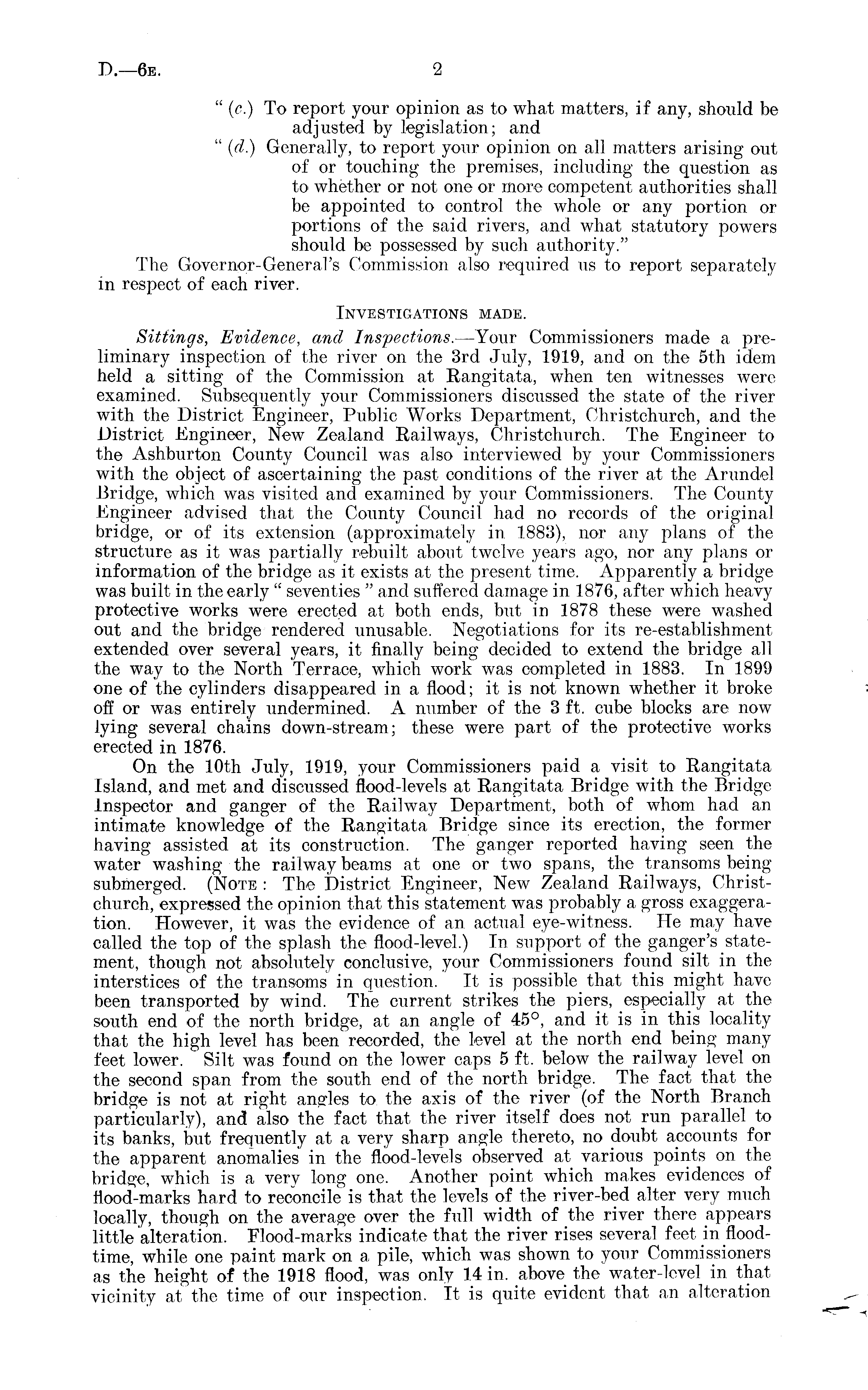 " (c.) To report your opinion as to what matters, if any, should be adjusted by legislation; and " (d.) Generally, to report your opinion on all matters arising out of or touching the premises, including the question as to whether or not one or more competent authorities shall be appointed to control the whole or any portion or portions of the said rivers, and what statutory powers should be possessed by such authority." The Governor-General's Commission also required us to report separately in respect of each river. Investigations made. Sittings, Evidence, and Inspections. —Your Commissioners made a preliminary inspection of the river on the 3rd July, 1919, and on the sth idem held a sitting of the Commission at Rangitata, when ten witnesses were examined. Subsequently your Commissioners discussed, the state of the river with the District Engineer, Public Works Department, Christchurch, and the District Engineer, New Zealand Railways, Christchurch. The Engineer to the Ashburton County Council was also interviewed by your Commissioners with the object of ascertaining the past conditions of the river at the Arundel Bridge, which was visited and examined by your Commissioners. The County Engineer advised that the County Council had no records of the original bridge, or of its extension (approximately in 1883), nor any plans of the structure as it was partially rebuilt about twelve years ago, nor any plans or information of the bridge as it exists at the present time. Apparently a bridge was built in the early " seventies " and suffered damage in 1876, after which heavy protective works were erected at both ends, but in 1878 these were washed out and the bridge rendered unusable. Negotiations for its re-establishment extended over several years, it finally being decided to extend the bridge all the way to the North Terrace, which work was completed in 1883. In 1899 one of the cylinders disappeared in a flood; it is not known whether it broke off or was entirely undermined. A number of the 3 ft. cube blocks are now lying several chains down-stream; these were part of the protective works erected in 1876. On the 10th July, 1919, your Commissioners paid a visit to Rangitata Island, and met and discussed flood-levels at Rangitata Bridge with the Bridge Inspector and ganger of the Railway Department, both of whom had an intimate knowledge of the Rangitata Bridge since its erection, the former having assisted at its construction. The ganger reported having seen the water washing the railway beams at one or two spans, the transoms being submerged. (Note : The District Engineer, New Zealand Railways, Christchurch, expressed the opinion that this statement was probably a gross exaggeration. However, it was the evidence of an actual eye-witness. He may have called the top of the splash the flood-level.) In support of the ganger's statement, though not absolutely conclusive, your Commissioners found silt in the interstices of the transoms in question. It is possible that this might have been transported by wind. The current strikes the piers, especially at the south end of the north bridge, at an angle of 45°, and it is in this locality that the high level has been recorded, the level at the north end being many feet lower. Silt was found on the lower caps 5 ft. below the railway level on the second span from the south end of the north bridge. The fact that the bridge is not at right angles to the axis of the river (of the North Branch particularly), and also the fact that the river itself does not run parallel to its banks, but frequently at a very sharp angle thereto, no doubt accounts for the apparent anomalies in the flood-levels observed at various points on the bridge, which is a very long one. Another point which makes evidences of flood-marks hard to reconcile is that the levels of the river-bed alter very much locally, though on the average over the full width of the river there appears little alteration. Flood-marks indicate that the river rises several feet in floodtime, while one paint mark on a pile, which was shown to your Commissioners as the height of the 1918 flood, was only 14 in. above the water-level in that vicinity at the time of our inspection. It is quite evident that an alteration
