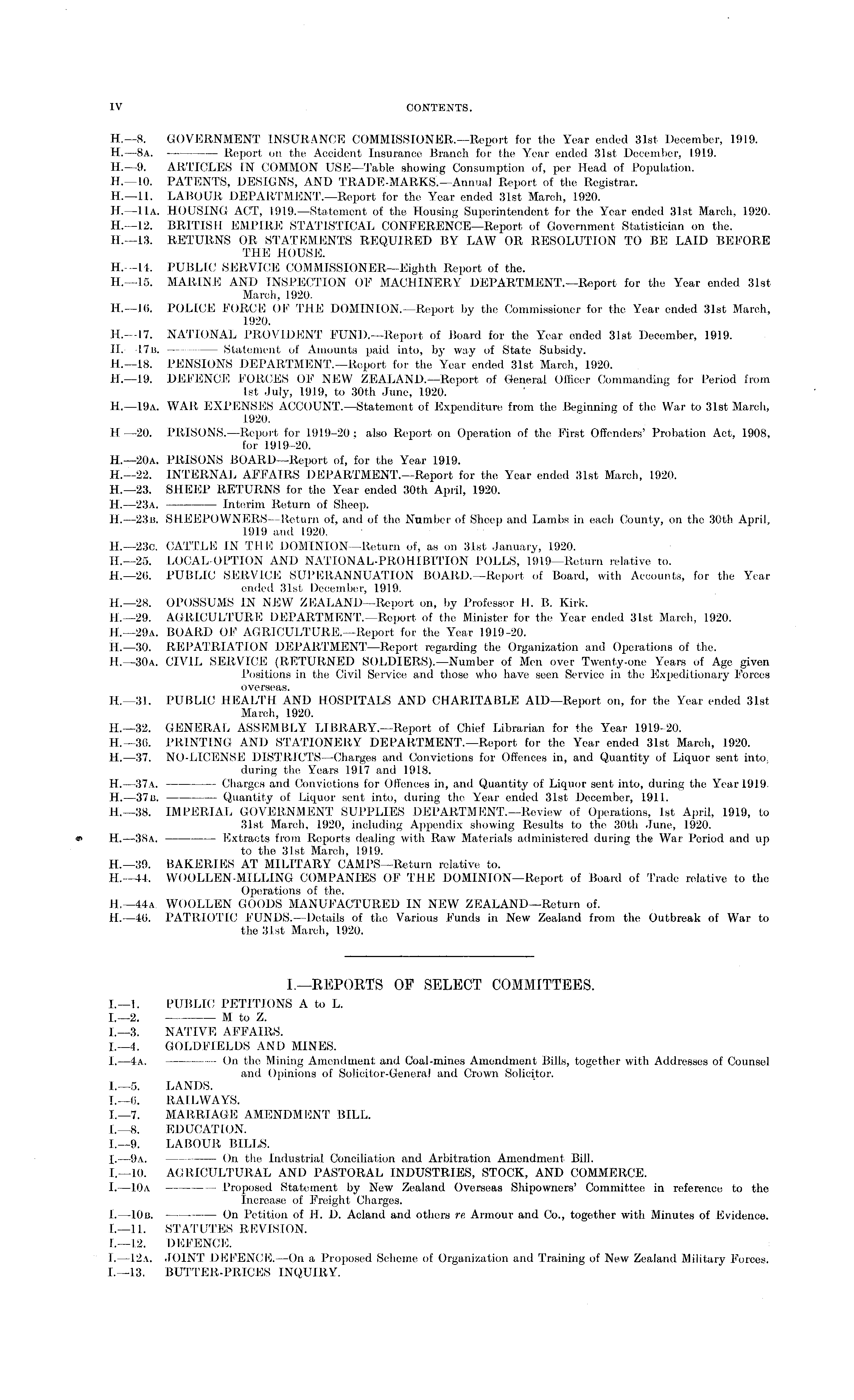 H,—B. GOVERNMENT INSURANCE COMMISSIONER.—Report for the Year ended 31st December, 1919. H. —Ba. Report on the Accident Insurance Branch for the Year ended 31st December, 1919. H.—9. ARTICLES IN COMMON USE—Table showing Consumption of, per Head of Population. H. —10. PATENTS, DESIGNS, AND TRADE-MARKS.—Annual Report of the Registrar. H. —11. LABOUR DEPARTMENT.—Report for the Year ended 31st March, 1920. H.—lla. HOUSING ACT, 1919. —Statement of the Housing Superintendent for the Year ended 31st March, 1920. H. —12. BRITISH EMPIRE STATISTICAL CONFERENCE—Report of Government Statistician on the. 11.—13. RETURNS OR STATEMENTS REQUIRED BY LAW OR RESOLUTION TO BE LAID BEFORE THE HOUSE. H.—l4. PUBLIC; SERVICE COMMISSIONER—Eighth Report of the. H.—ls. MARINE AND INSPECTION OF MACHINERY DEPARTMENT.—Report for the Year ended 31st March, 1920. H.—l6. POLICE FORCE OF THE DOMINION.—Report by the Commissioner for the Year ended 31st March, 1920. H. —17. NATIONAL PROVIDENT FUND.—Report of Board for the Year ended 31st December, 1919. H. —17b. Statement of Amounts paid into, by way of State Subsidy. H. —18. PENSIONS DEPARTMENT.—Report for the Year ended 31st March, 1920. H. —19. DEFENCE FORCES OF NEW ZEALAND. —Report of General Officer Commanding for Period from Ist July, 1919, to 30t.h June, 1920. H. —19a. WAR EXPENSES ACCOUNT.—Statement of Expenditure from the Beginning of the War to 31st March, 1920. H —20. PRISONS. —Report for 1919-20 : also Report on Operation of the First Offenders' Probation Act, 1908, for 1919-20. H.—2oa. PRISONS BOARD —Report of, for the Year 1919. H.—22. INTERNAL AFFAIRS DEPARTMENT.—Report for the Year ended 31st March, 1920. H.—23. SHEEP RETURNS for the Year ended 30th April, 1920. H. —23a. Interim Return of Sheep. H. —23b. SHEEPOWNERS—Return of, and of the Number of Sheep and Lambs in each County, on the 30th April, 1919 and 1920. H. —23c. CATTLE IN THE DOMINION —Return of, as on 31st January, 1920. H.—25. LOCAL-OPTION AND NATIONAL-PROHIBITION POLLS, 1919—Return relative to. H. —20. PUBLIC SERVICE SUPERANNUATION BOARD.—Report of Board, with Accounts, for the Year ended 31st December, 1919. H.—2B. OPOSSUMS IN NEW ZEALAND—Report on, by Professor H. B. Kirk. H. —29. AGRICULTURE DEPARTMENT. —Report of the Minister for the Year ended 31st March, 1920. H.—29a. BOARD OF AGRICULTURE.—Report for the Year 1919-20. H. —30. REPATRIATION DEPARTMENT —Report regarding the Organization and Operations of the. H.—3oa. CIVIL SERVICE (RETURNED SOLDIERS).—Number of Men over Twenty-one Years of Age given Positions in the Civil Service and those who have seen Service in the Expeditionary Forces overseas. H.—3l. PUBLIC HEALTH AND HOSPITALS AND CHARITABLE AlD—Report on, for the Year ended 31st March, 1920. H.—32. GENERAL ASSEMBLY LIBRARY.—Report of Chief Librarian for the Year 1919-20. H.—3o. PRINTING AND STATIONERY DEPARTMENT.—Report for the Year ended 31st March, 1920. H.—37. NO-LICENSE DISTRICTS—Charges and Convictions for Offences in, and Quantity of Liquor sent into, during the Years 1917 and 1918. H. —37a. Charges and Convictions for Offences in, and Quantity of Liquor sent into, during the Year 1919. H.—37 b. — Quantity of Liquor sent into, during the Year ended 31st December, 1911. H 38. IMPERIAL GOVERNMENT SUPPLIES DEPARTMENT.—Review of Operations, Ist April. 1919, to 31st March, 1920, including Appendix showing Results to the 30tli June, 1920. H.—3Ba. — Extracts from Reports dealing with Raw Materials administered during the War Period and up to the 31st March, 1.919. H.—39. BAKERIES AT MILITARY CAMPS—Return relative to. H.— 44. WOOLLEN-MILLING COMPANIES OF THE DOMINION—Report of Board of Trade relative to the Operations of the. H.—44a WOOLLEN GOODS MANUFACTURED IN NEW ZEALAND—Return of. H. —46. PATRIOTIC FUNDS. —Details of the Various Funds in New Zealand from the Outbreak of War to the 31st March, 1920.