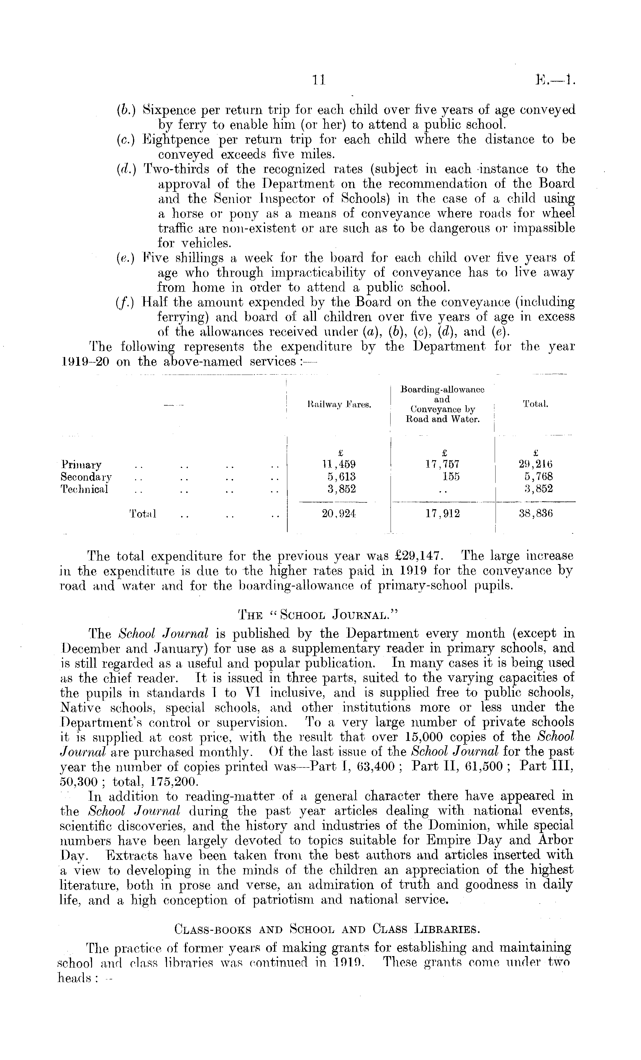 The total expenditure for the previous year was £29,147. The large increase in the expenditure is due to the higher rates paid in 1919 for the conveyance by road and water and for the boarding-allowance of primary-school pupils. The " School Journal." The School Journal is published by the Department every month (except in December and January) for use as a supplementary reader in primary schools, and is still regarded as a useful and popular publication. In many cases it is being used as the chief reader. It is issued in three parts, suited to the varying capacities of the pupils in standards 1 to VI inclusive, and is supplied free to public schools, Native schools, special schools, and other institutions more or less under the Department's control or supervision. To a very large number of private schools it is supplied at cost price, with the result that over 15,000 copies of the School Journal are purchased monthly. Of the last issue of the School Journal for the past year the number of copies printed was —Part 1, 63,400 ; Part 11, 61,500 ; Part 111, 50,300 ; total, 175,200. In addition to reading-matter of a general, character there have appeared in the School Journal during the past year articles dealing with national events, scientific discoveries, and the history and industries of the Dominion, while special numbers have been largely devoted to topics suitable for Empire Day and Arbor Day. Extracts have been taken from the best authors and articles inserted with a view to developing in the minds of the children an appreciation of the highest literature, both in prose and verse, an admiration of truth and goodness in daily life, and a high conception, of patriotism and national service. Class-books and School and Class Libraries. The practice of former years of making grants for establishing and maintaining school and class libraries was continued in 1919. These grants come under two heads:—
