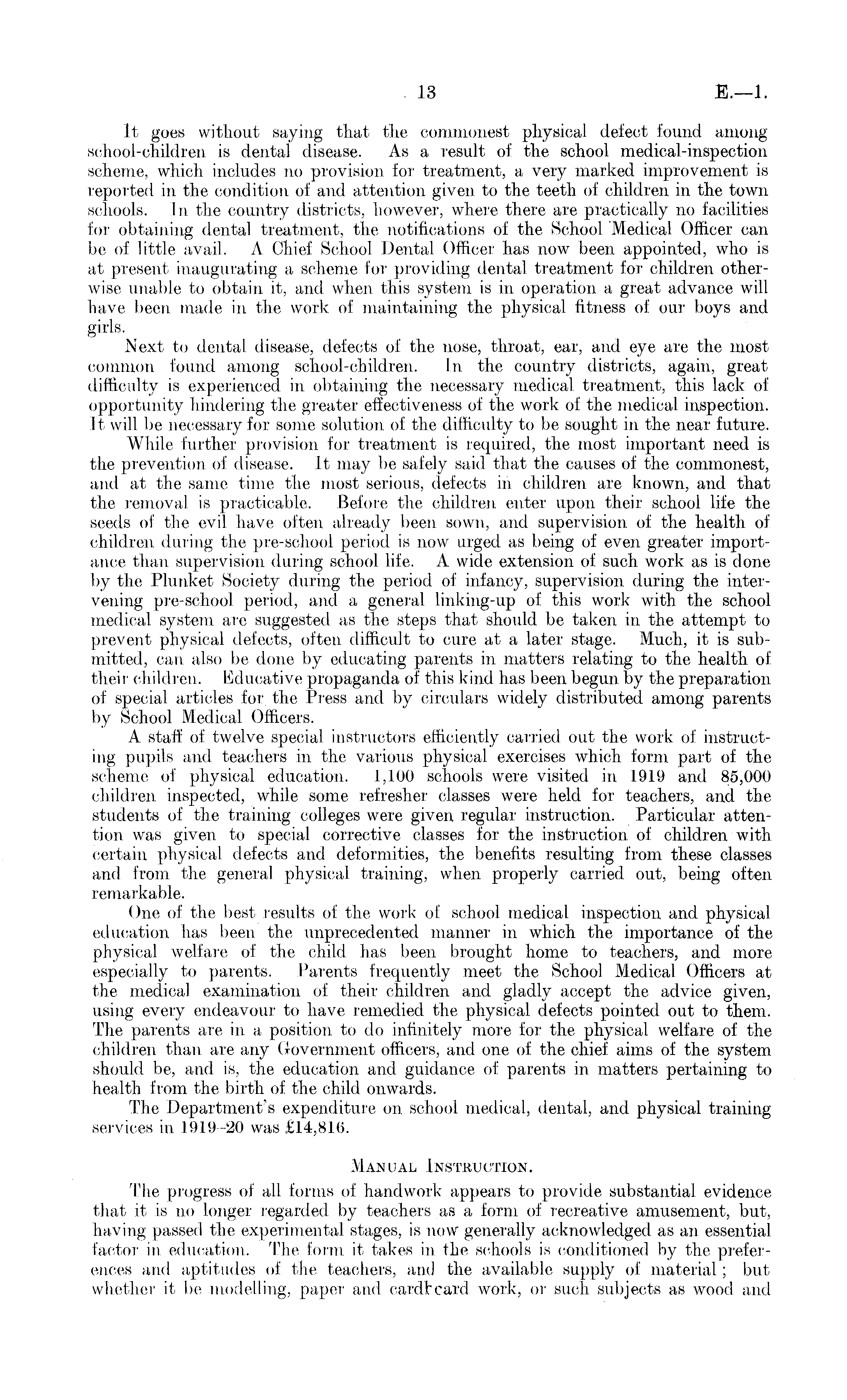 It goes without saying that the commonest physical defect found among school-children is dental disease. As a result of the school medical-inspection scheme, which includes no provision for treatment, a very marked improvement is reported in the condition of and attention given to the teeth of children in the town schools. In the country districts, however, where there are practically no facilities for obtaining dental treatment, the notifications of the School Medical Officer can be of little avail. A Chief School Dental Officer has now been appointed, who is at present inaugurating a scheme for providing dental treatment for children otherwise unable to obtain it, and when this system is in operation a great advance will have been made in the work- of maintaining the physical fitness of our boys and girls. Next to dental, disease, defects of the nose, throat, ear, and eye are the most common found among school-children. In. the country districts, again, great difficulty is experienced in obtaining the necessary medical treatment, this lack of opportunity hindering the greater effectiveness of the work of the medical inspection. It will be necessary for some solution, of the difficulty to be sought in the near future. While further provision for treatment is required, the most important need is the prevention, of disease. It may lie safely said that the causes of the commonest, and at the same time the most serious, defects in children are known, and that the removal is practicable. Before the children, enter upon their school life the seeds of the evil have often already been sown, and supervision of the health of children, during the pre-school period is now urged as being of even, greater importance than supervision during school life. A wide extension of such work as is done by the Plunket Society during the period of infancy, supervision during the intervening pre-school period, and a general linking-up of this work with the school medical system are suggested as the steps that should be taken in the attempt to prevent physical defects, often difficult to cure at a later stage. Much, it is submitted, can also be done by educating parents in matters relating to the health, of their children. Educative propaganda of this kind has been begun by the preparation of special articles for. the Press and by circulars widely distributed among parents by School Medical Officers. A. staff of twelve special instructors efficiently carried out the work of instructing pupils and teachers in the various physical exercises which form part of the scheme of physical education. 1,100 schools were visited in 1.919 and 85,000 children inspected, while some refresher classes were held for teachers, and the students of the training colleges were given regular instruction. Particular attention was given to special corrective classes for the instruction of children with certain physical defects and deformities, the benefits resulting from these classes and from the general physical training, when properly carried out, being often. remarkable. One of the best results of the work of school medical inspection and physical education has been the unprecedented manner in which the importance of the physical welfare of the child has been brought home to teachers, and more especially to parents. Parents frequently meet the School Medical Officers at the medical examination of their children and gladly accept the advice given, using every endeavour to have remedied the physical defects pointed out to them. The parents are in. a position to do infinitely more for the physical welfare of the children than are any Government officers, and one of the chief aims of the system should be, and is, the education and guidance of parents in matters pertaining to health from the birth of the child onwards. The Department's expenditure on. school medical, dental, and physical training services in 1919-20 was £14,816. Manual Instruction. The progress of all forms of handwork appears to provide substantial evidence that it is no longer regarded by teachers as a form of recreative amusement, but, having passed the experimental stages, is now generally acknowledged as an essential factor in education. The form it takes in the schools is conditioned by the preferences and aptitudes of the teachers, and the available supply of material ; but whether it be modelling, paper and cardrcard work, or such subjects as wood and