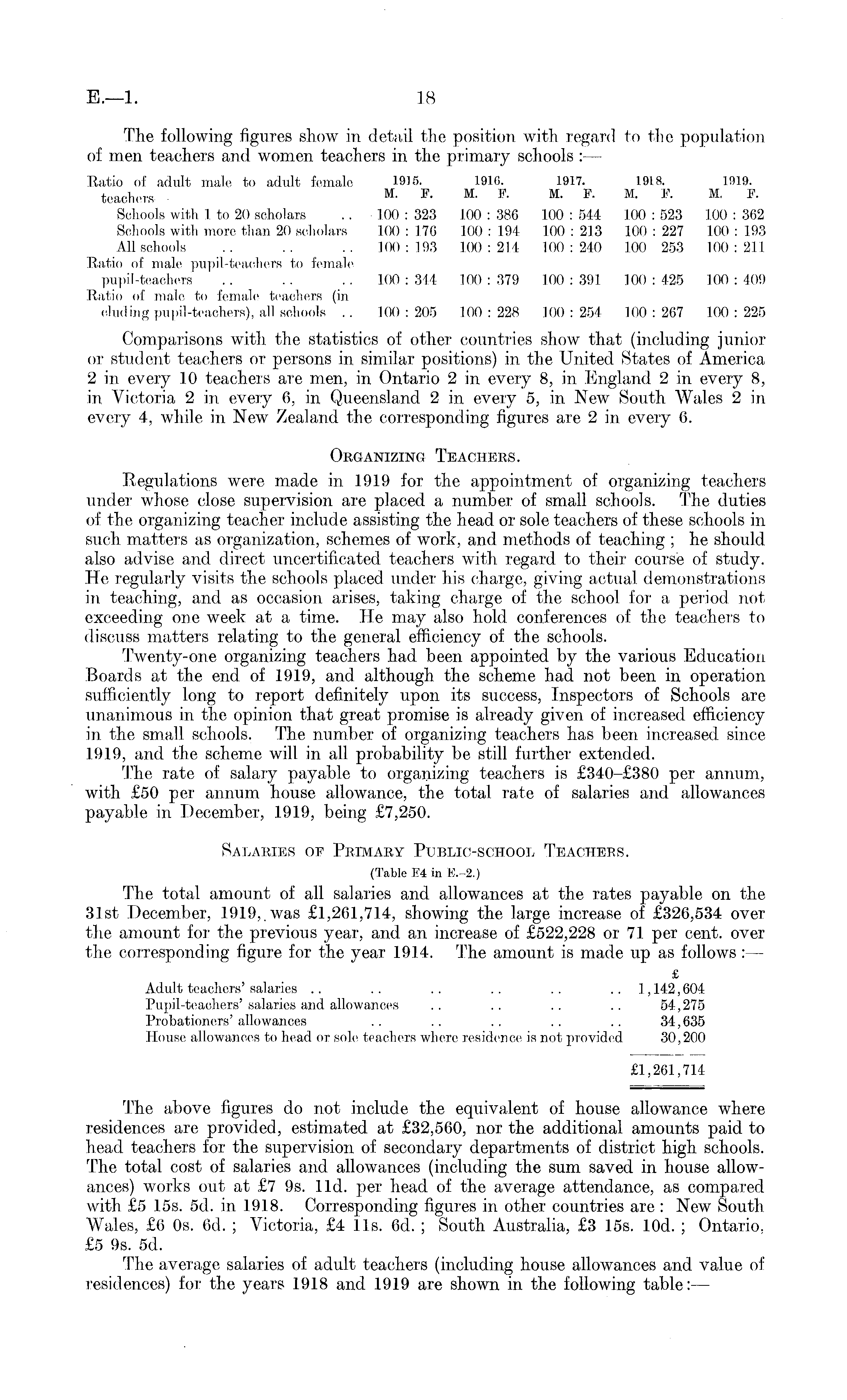The following figures show in detail the position with regard to the population of men teachers and women teachers in the primary schools : — Eatio of adult male to adult female 1915. 1916. 1917. 1918. 1919. teachers- - M - p - M - »• M - F - M - *■ M - F - Schools with Ito 20 scholars .. 100:323 100:386 100:544 100:523 100:362 Schools with more than 20 scholars 100:176 100:194 100:2.13 100:227 100:193 All schools .. .. .. 100:193 100:214 100:240 100 253 100:211 Ratio of male pupil-teachers to female pupil-teachers .. .. .. 100 : 344 100 : 379 100 : 391 100 : 425 100 : 409 Ratio of male to female teachers (iv eluding pupil-teachers), all schools .. 100 : 205 100 : 228 100 : 254 100 : 267 100 : 225 Comparisons with the statistics of other countries show that (including junior or student teachers or persons in similar positions) in the United States of America 2 in every 10 teachers are men, in Ontario 2 in every 8, in England 2 in every 8, in Victoria 2 in every 6, in Queensland 2 in every 5, in New South Wales 2 in every 4, while in New Zealand the corresponding figures are 2 in every 6. Organizing Teachers. Regulations were made in 1919 for the appointment of organizing teachers under whose close supervision are placed a number of small schools. The duties of the organizing teacher include assisting the head or sole teachers of these schools in such matters as organization, schemes of work, and methods of teaching ; he should also advise and direct uncertificated teachers with regard to their course of study. He regularly visits the schools placed under his charge, giving actual demonstrations in teaching, and as occasion arises, taking charge of the school for a period, not exceeding one week at a time. He may also hold conferences of the teachers to discuss matters relating to the general efficiency of the schools. Twenty-one organizing teachers had been appointed by the various Education Boards at the end of 1919, and although the scheme had not been in operation sufficiently long to report definitely upon its success, Inspectors of Schools arc unanimous in the opinion that great promise is already given of increased efficiency in the small schools. The number of organizing teachers has been increased since 1919, and the scheme will in all probability be still further extended. The rate of salary payable to organizing teachers is £340-£3 BO per annum, with £50 per annum house allowance, the total rate of salaries and allowances payable in December, 1919, being £7,250. Salaries oe Primary Public-schooe Teachers. (Table E4 in E.-2.) The total amount of all salaries and allowances at the rates payable on the 31st December, 1919, was £1,261,714, showing the large increase of £326,534 over the amount for the previous year, and an increase of £522,228 or 71 per cent, over the corresponding figure for the year 1914. The amount is made up as follows :— £ Adult teachers'salaries .. .. .. .. .. .. 1,142,604 Pupil-teachers'salaries and allowances .. .. .. .. 54,275 Probationers' allowances . . .. .. . . .. 34,635 House allowances to head or sole teachers where residence is not provided 30,200 £1,261,714 The above figures do not include the equivalent of house allowance where residences are provided, estimated at £32,560, nor the additional amounts paid to head teachers for the supervision of secondary departments of district high schools. The total cost of salaries and allowances (including the sum saved in house allowances) works out at £7 9s. fid. per head of the average attendance, as compared with £5 15s. sd. in 1918. Corresponding figures in other countries are : New South Wales, £6 os. 6d. ; Victoria, £4 lis. 6d. ; South Australia, £3 15s. lOd. ; Ontario. £5 9s. sd. The average salaries of adult teachers (including house allowances and value of residences) for the years 1918 and 1919 are shown in the following table:—