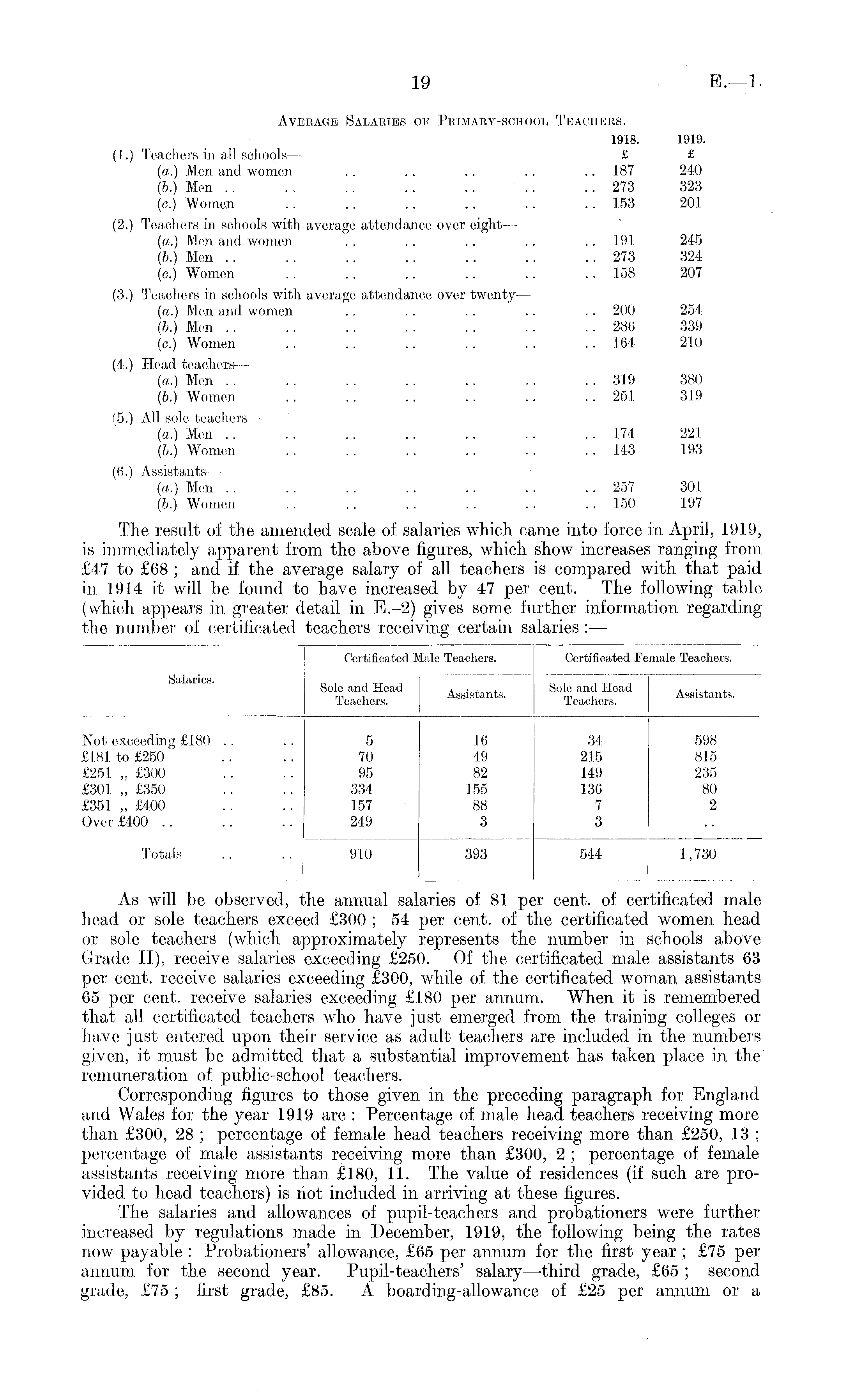 Average Salaries of Primary-school Teachers. 1918. 1919. (I.) Teachers in all schools— £ £ («.) Men and women . . .. .. . . .. 187 240 (6.) Men .. ~. .. .. .. ' .. ..273 323 (c.) Women .. .. .. .. .. ..153 201 (2.) Teachers in schools with, average attendance over eight— (a.) Men and women .. .. .. .. ..191 245 (b.) Men .. .. .. .. .. .. ..273 324 (c.) Women .. .. .. .. .. ..158 207 (3.) Teachers in schools with average attendance over twenty — (a.) Men and women .. . . .. . . .. 200 254 (6.) Men . . . . .. .. .. .. .. 286 339 (c.) Women .. .. .. .. .. ..164 210 (4.) Head teachers— (a.) Men . . .. . . .. .. . . .. 319 380 (b.) Women .. .. .. .. .. ..251 319 (5.) All sole teachers — (a.) Men .. .. .. .. .. .. .. 174 221 (6.) Women .. .. .. .. .. ..143 193 (6.) Assistants— (a.) Men . . .. . . . . .. .. .. 257 301 (6.) Women .. .. .. .. .. ..150 197 The result of the amended scale of salaries which came into force in April, 1919, is immediately apparent from the above figures, which show increases ranging from £47 to £68 ; and if the average salary of all teachers is compared with that paid in 1914 it will be found to have increased by 47 per cent. The following table (which appears in greater detail in E.-2) gives some further information regarding the number of certificated teachers receiving certain salaries : —