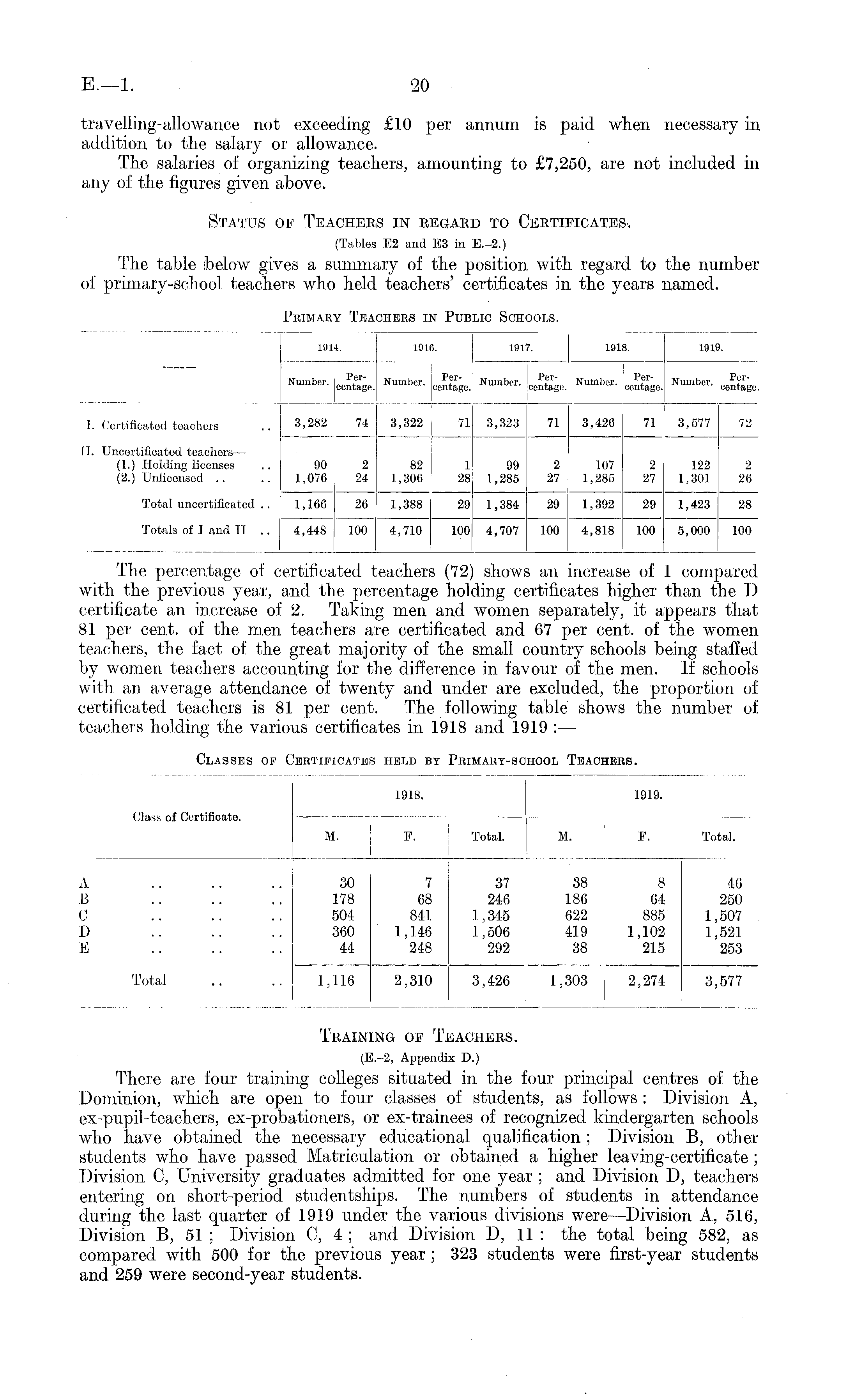 travelling-allowance not exceeding £10 per annum is paid when necessary in addition to the salary or allowance. The salaries of organizing teachers, amounting to £7,250, are not included in any of the figures given above. Status of Teachers in regard to Certificates. (Tables E2 and E3 in E.-2.) The table below gives a summary of the position with regard to the number of primary-school teachers who held teachers' certificates in the years named.