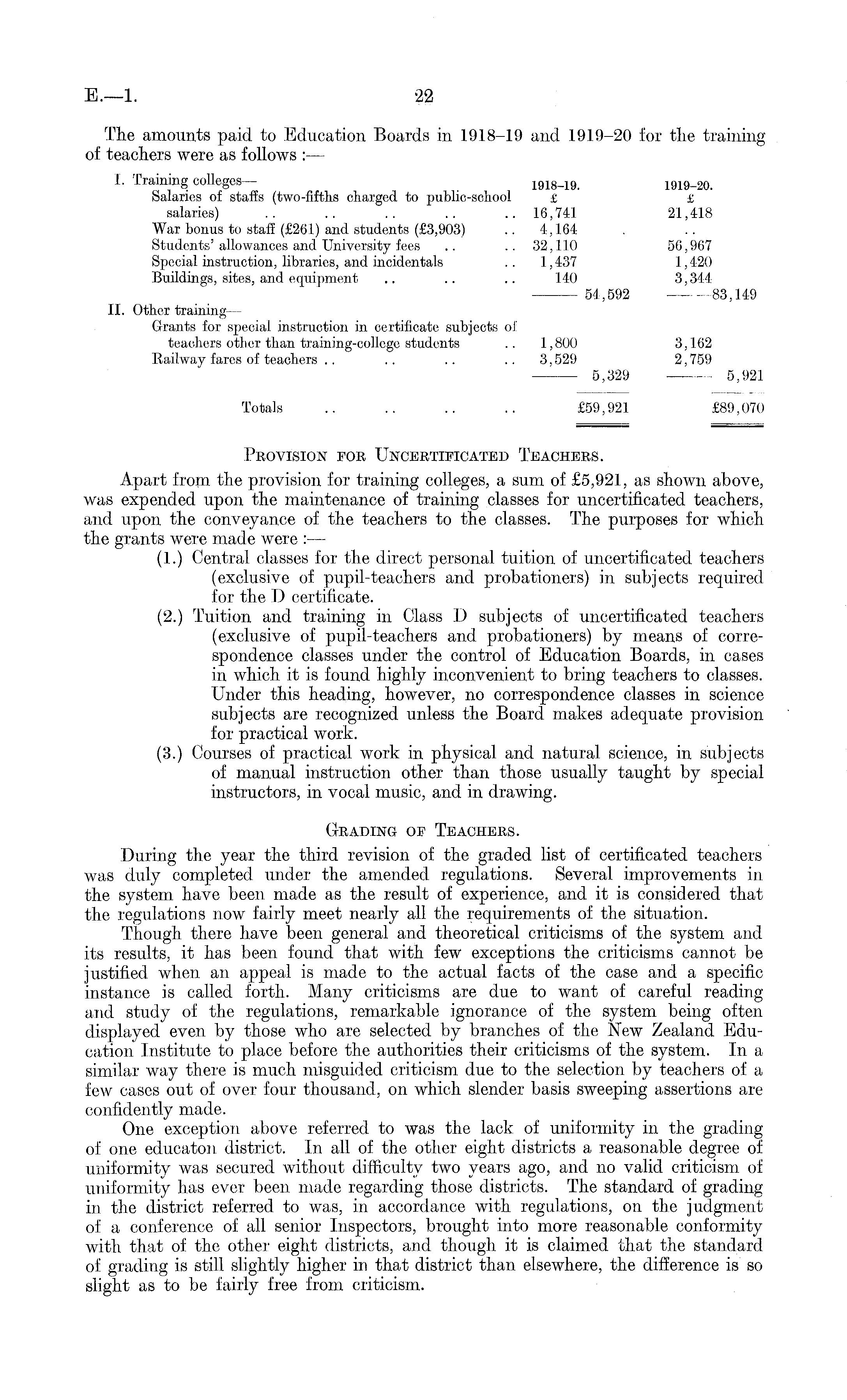 The amounts paid to Education Boards in 1918-19 and 1919-20 for the training of teachers were as follows :— I. Training colleges— 1918-19. 1919-20. Salaries of staffs (two-fifths charged to public-school £ £ salaries) .. .. .. .. .. 16,741 21,418 War bonus to staff (£261) and students (£3,903) ..4,164 Students' allowances and University fees .. .. 32,110 56,967 Special instruction, libraries, and incidentals .. 1,437 1,420 Buildings, sites, and equipment .. .. .. 140 3,344 54,592 83,149 11. Other training— Grants for special instruction in certificate subjects of teachers other than training-college students .. 1,800 3,162 Railway fares of teachers .. .. .. .. 3,529 2,759 5,329 5,921 Totals .. .. .. .. £59,921 £89,070 Provision for Uncertificated Teachers. Apart from the provision for training colleges, a sum of £5,921, as shown above, was expended upon the maintenance of training classes for uncertificated teachers, and upon, the conveyance of the teachers to the classes. The purposes for which the grants were made were :— (I.) Central classes for the direct personal tuition, of uncertificated teachers (exclusive of pupil-teachers and probationers) in subjects required for the D certificate. (2.) Tuition and training in Class I) subjects of uncertificated teachers (exclusive of pupil-teachers and probationers) by means of correspondence classes under the control of Education Boards, in cases in which it is found highly inconvenient to bring teachers to classes. Under this heading, however, no correspondence classes in science subjects are recognized unless the Board makes adequate provision for practical work. (3.) Courses of practical work in physical and natural science, in. subjects of manual instruction other than those usually taught by special instructors, in vocal music, and in drawing. Grading of Teachers. During the year the third revision of the graded list of certificated teachers was duly completed under the amended regulations. Several improvements in the system have been made as the result of experience, and it is considered that the regulations now fairly meet nearly all the requirements of the situation. Though there have been general and theoretical criticisms of the system and its results, it has been found that with few exceptions the criticisms cannot be justified when, an appeal, is made to the actual facts of the case and a specific instance is called forth. Many criticisms are due to want of careful reading and study of the regulations, remarkable ignorance of the system being often displayed even by those who are selected by branches of the New Zealand Education Institute to place before the authorities their criticisms of the system. In a similar way there is much misguided criticism, due to the selection by teachers of a few cases out of over four thousand, on which slender basis sweeping assertions are confidently made. One exception above referred to was the lack of uniformity in the grading of one educaton district. In all of the other eight districts a reasonable degree of uniformity was secured without difficulty two years ago, and no valid criticism of uniformity has ever been made regarding those districts. The standard of grading in the district referred to was, in accordance with, regulations, on the judgment of a conference of all senior Inspectors, brought into more reasonable conformity with that of the other eight districts, and though it is claimed that the standard of grading is still slightly higher in that district than elsewhere, the difference is so slight as to be fairly free from criticism.