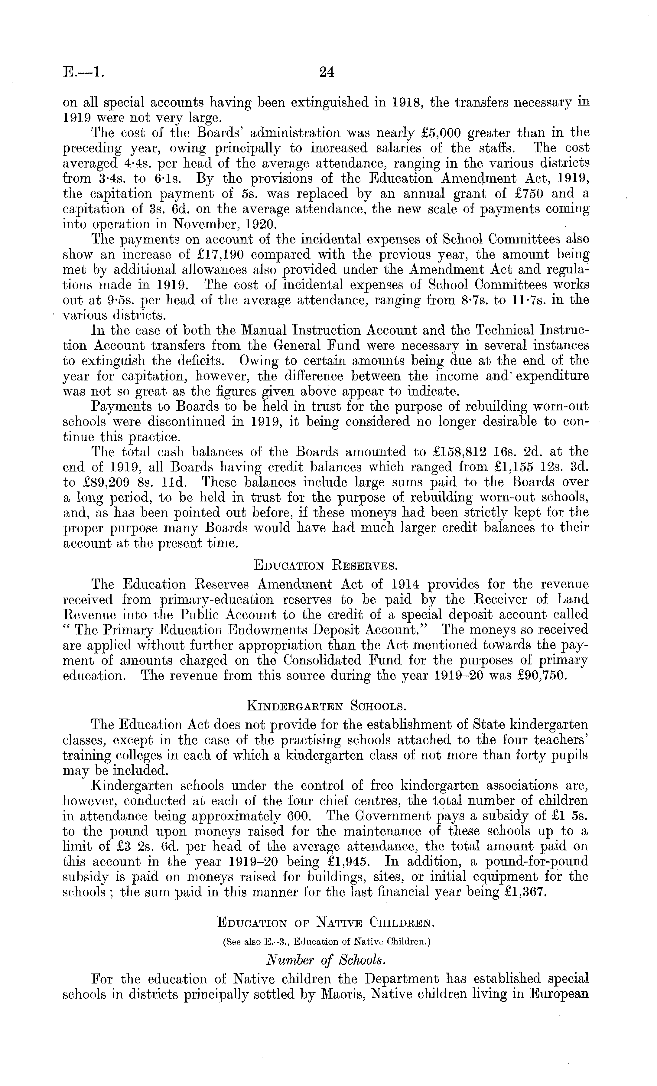 on all special accounts having been extinguished in 1918, the transfers necessary in 1919 were not very large. The cost of the Boards' administration was nearly £5,000 greater than in the preceding year, owing principally to increased salaries of the staffs. The cost averaged 4-4s. per head of the average attendance, ranging in the various districts from 3-4s. to 6-ls. By the provisions of the Education Amendment Act, 1919, the capitation payment of 5s. was replaced by an annual grant of £750 and a capitation of 3s. 6d. on the average attendance, the new scale of payments coming into operation in November, 1920. The payments on account of the incidental expenses of School Committees also show an increase of £17,190 compared with the previous year, the amount being met by additional allowances also provided under the Amendment Act and regulations made in 1919. The cost of incidental expenses of School Committees works out at 9-5s. per head of the average attendance, ranging from 8-7s. to 11-7s. in the various districts. In the case of both the Manual Instruction Account and the Technical Instruction Account transfers from the General Fund were necessary in several instances to extinguish the deficits. Owing to certain, amounts being due at the end of the year for capitation, however, the difference between the income and' expenditure was not so great as the figures given above appear to indicate. Payments to Boards to be held in trust for the purpose of rebuilding worn-out schools were discontinued in 1919, it being considered no longer desirable to continue this practice. The total cash balances of the Boards amounted to £158,812 16s. 2d. at the end of 1919, all Boards having credit balances which ranged from £1,155 12s. 3d. to £89,209 8s. lid. These balances include large sums paid to the Boards over a long period, to be held in trust for the purpose of rebuilding worn-out schools, and, as has been pointed out before, if these moneys had been strictly kept for the proper purpose many Boards would have had much larger credit balances to their account at the present time. Education Reserves. The Education Reserves Amendment Act of 1914 provides for the revenue received from primary-education reserves to be paid by the Receiver of Land Revenue into the Public Account to the credit of a special deposit account called " The Primary Education Endowments Deposit Account." The moneys so received are applied without further appropriation than the Act mentioned towards the payment of amounts charged on the Consolidated Fund for the purposes of primary education. The revenue from this source during the year 1919-20 was £90,750. Kindergarten Schools. The Education Act does not provide for the establishment of State kindergarten classes, except in the case of the practising schools attached to the four teachers' training colleges in each of which a kindergarten class of not more than forty pupils may be included. Kindergarten schools under the control of free kindergarten associations are, however, conducted at each of the four chief centres, the total number of children in attendance being approximately 600. The Government pays a subsidy of £l 5s. to the pound upon moneys raised for the maintenance of these schools up to a limit of £3 2s. 6d. per head of the average attendance, the total amount paid on this account in the year 1919-20 being £1,945. In addition, a pound-for-pound subsidy is paid on moneys raised for buildings, sites, or initial equipment for the schools ; the sum paid in this manner for the last financial year being £1,367. Education op Native Children. (See also E.-3., Education of Native Children.) Number of Schools. For the education of Native children the Department has established special schools in districts principally settled by Maoris, Native children living in European
