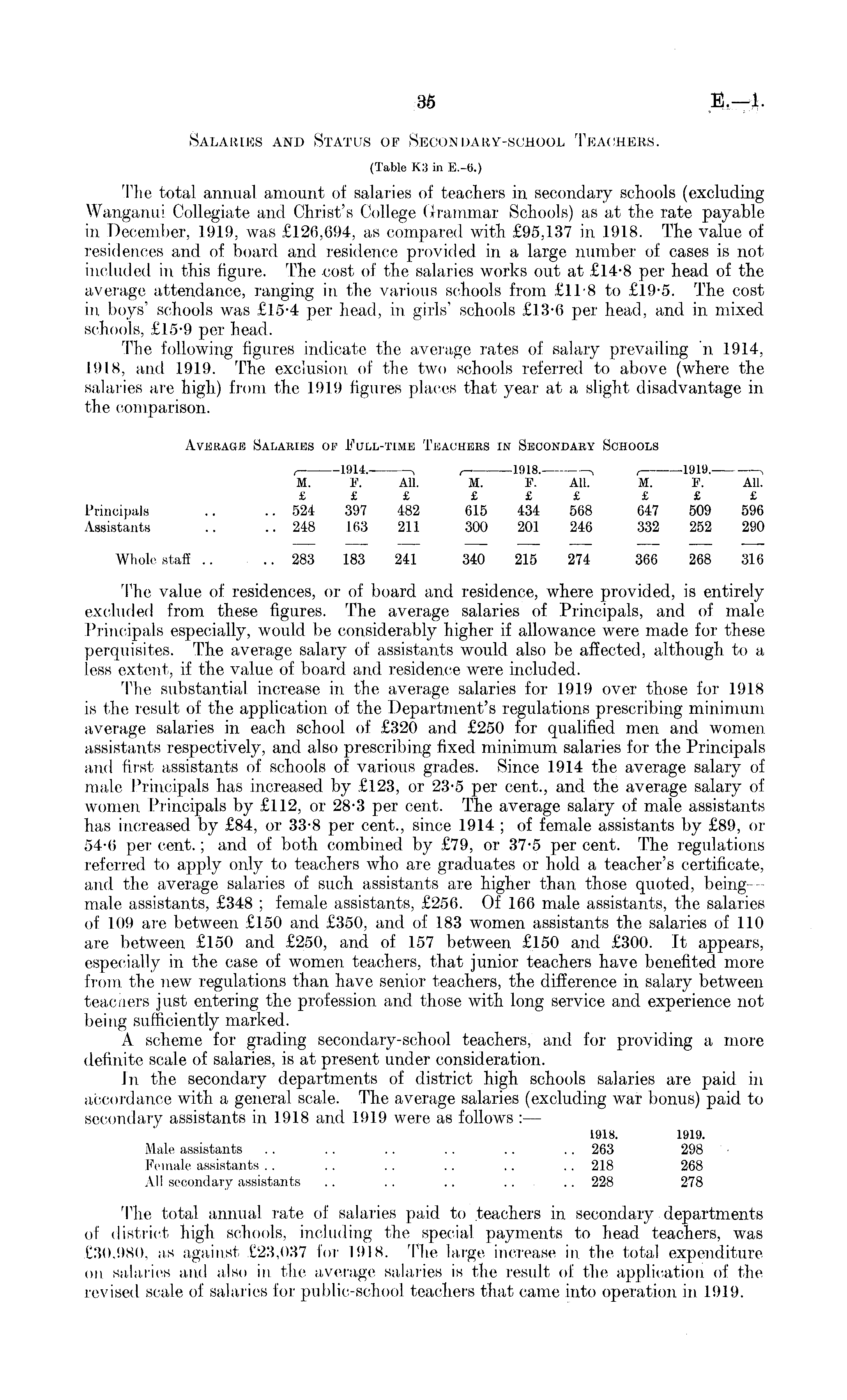 Salaries and Status of Secondary-school Teachers. (Table K3 in E.-6.) The total annual amount of salaries of teachers in secondary schools (excluding Wanganui Collegiate and Christ's College Grammar Schools) as at the rate payable in December, 1919, was £.12(5,694, as compared with £95,137 in. 1918. The value of residences and of board and residence provided in a large number of cases is not included in this figure. The cost of the salaries works out at £14-8 per head of the average attendance, ranging in the various schools from £11-8 to £19-5. The cost in boys' schools was £15-4 per head, in girls' schools £13-6 per head, and in mixed schools, £15-9 per head. The following figures indicate the average rates of salary prevailing ii 1914, 1918, and 1919. The exclusion of the two schools referred to above (where the salaries are high) from the 1919 figures places that year at a slight disadvantage in the comparison. Average Salaries op Full-time Teachers in Secondary Schools , 1914.- , , 1918. , , 1919. , M. F. All. M. F. All. M. F. All. £ £ £ £££ £££ Principals .. ..524 397 482 615 434 568 647 509 596 Assistants .. ..248 163 211 300 201 246 332 252 290 Whole staff .. .. 283 183 241 340 215 274 366 268 316 The value of residences, or of board and residence, where provided, is entirely excluded from these figures. The average salaries of Principals, and of male Principals especially, would be considerably higher if allowance were made for these perquisites. The average salary of assistants would also be affected, although to a less extent, if the value of board and residence were included. The) substantial increase in the average salaries for 1919 over those for 1918 is the result of the application of the Department's regulations prescribing minimum average salaries in each school of £320 and £250 for qualified men and women assistants respectively, and also prescribing fixed minimum salaries for the Principals and first assistants of schools of various grades. Since 1914 the average salary of male Principals has increased by £123, or 23-5 per cent., and the average salary of women Principals by £112, or 28-3 per cent. The average salary of male assistants has increased by £84, or 33-8 per cent., since 1914 ; of female assistants by £89, or 54-6 per cent.; and of both combined by £79, or 37-5 per cent. The regulations referred to apply only to teachers who are graduates or hold a teacher's certificate, and the average salaries of such assistants are higher than those quoted, being--male assistants, £348 ; female assistants, £256. Of 166 male assistants, the salaries of 109 are between £150 and £350, and of 183 women assistants the salaries of 110 are between £150 and £250, and of 157 between £150 and £300. It appears, especially in the case of women teachers, that junior teachers have benefited more from the new regulations than have senior teachers, the difference in salary between teacners just entering the profession and those with long service and experience not being sufficiently marked. A scheme for grading secondary-school teachers, and for providing a more definite scale of salaries, is at present under consideration. In the secondary departments of district high schools salaries are paid in accordance with a general scale. The average salaries (excluding war bonus) paid to secondary assistants in 1918 and 1919 were as follows :— 1918. 1919. Male assistants . . . . .. .. .. . . 263 298 ■ Female assistants .. .. .. .. .. .. 218 268 All secondary assistants .. .. .. .. .. 228 278 The total annual rate of salaries paid to teachers in secondary departments of district high schools, including the special payments to head teachers, was £30,980, as against £23,037 for 1918. The large increase in the total expenditure on salaries and also in the average salaries is the result of the application of the revised scale of salaries for public-school teachers that came into operation in 1919.