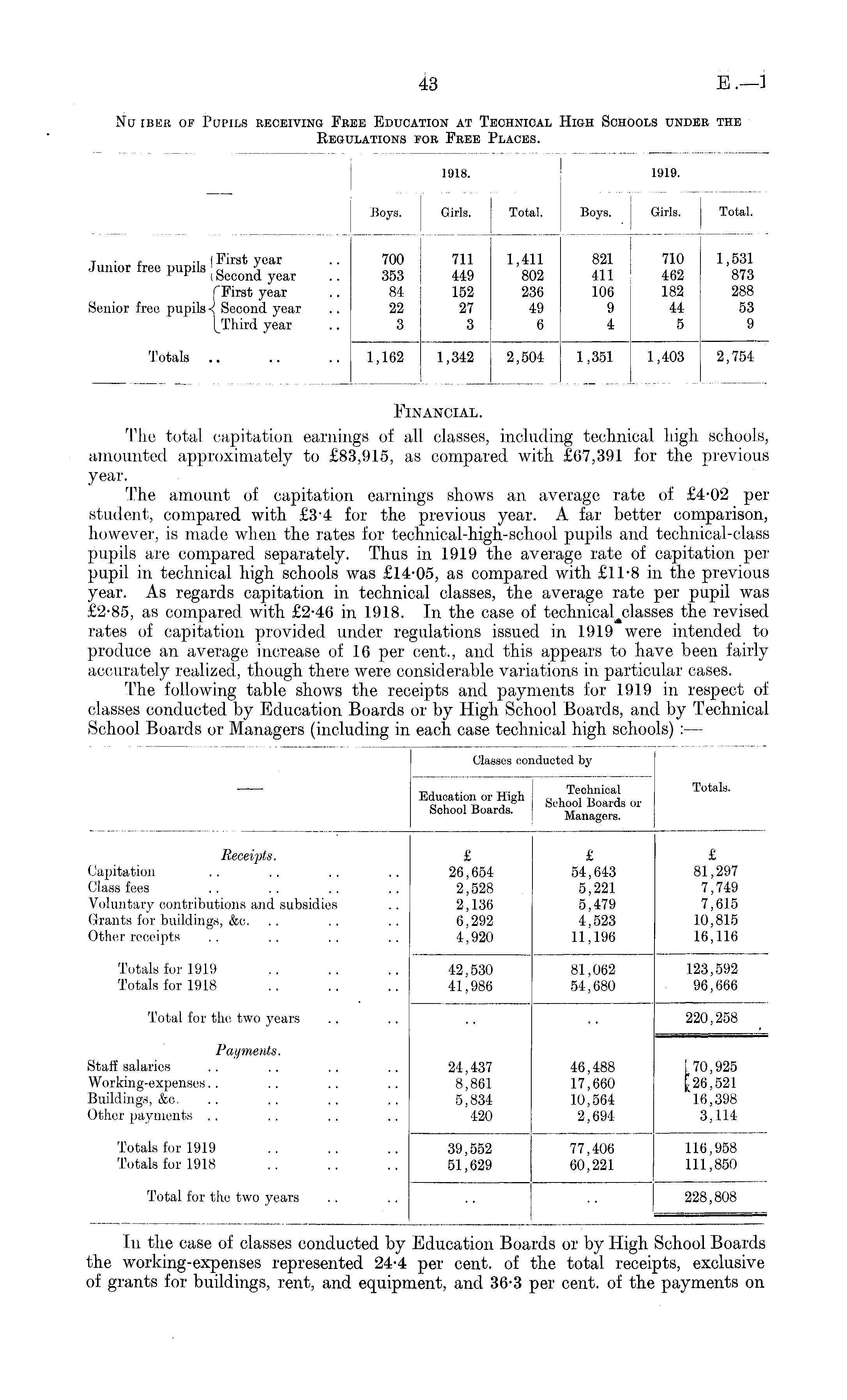 Financial. The total capitation earnings of all classes, including technical high schools, amounted approximately to £83,915, as compared with £67,391 for the previous year. The amount of capitation earnings shows an average rate of £4-02 per student, compared with £34 for the previous year. A far better comparison, however, is made when the rates for technical-high-school pupils and technical-class pupils are compared separately. Thus in 1919 the average rate of capitation per pupil in technical high schools was £14-05, as compared with £11-8 in the previous year. As regards capitation in technical classes, the average rate per pupil was £2-85, as compared with £2-46 in 1918. Tn the case of the revised rates of capitation provided under regulations issued in 1919 were intended to produce an average increase of 16 per cent., and this appears to have been fairly accurately realized, though there were considerable variations in particular cases. The following table shows the receipts and payments for 1919 in respect of classes conducted by Education Boards or by High School Boards, and by Technical School Boards or Managers (including in each case technical high schools) :—