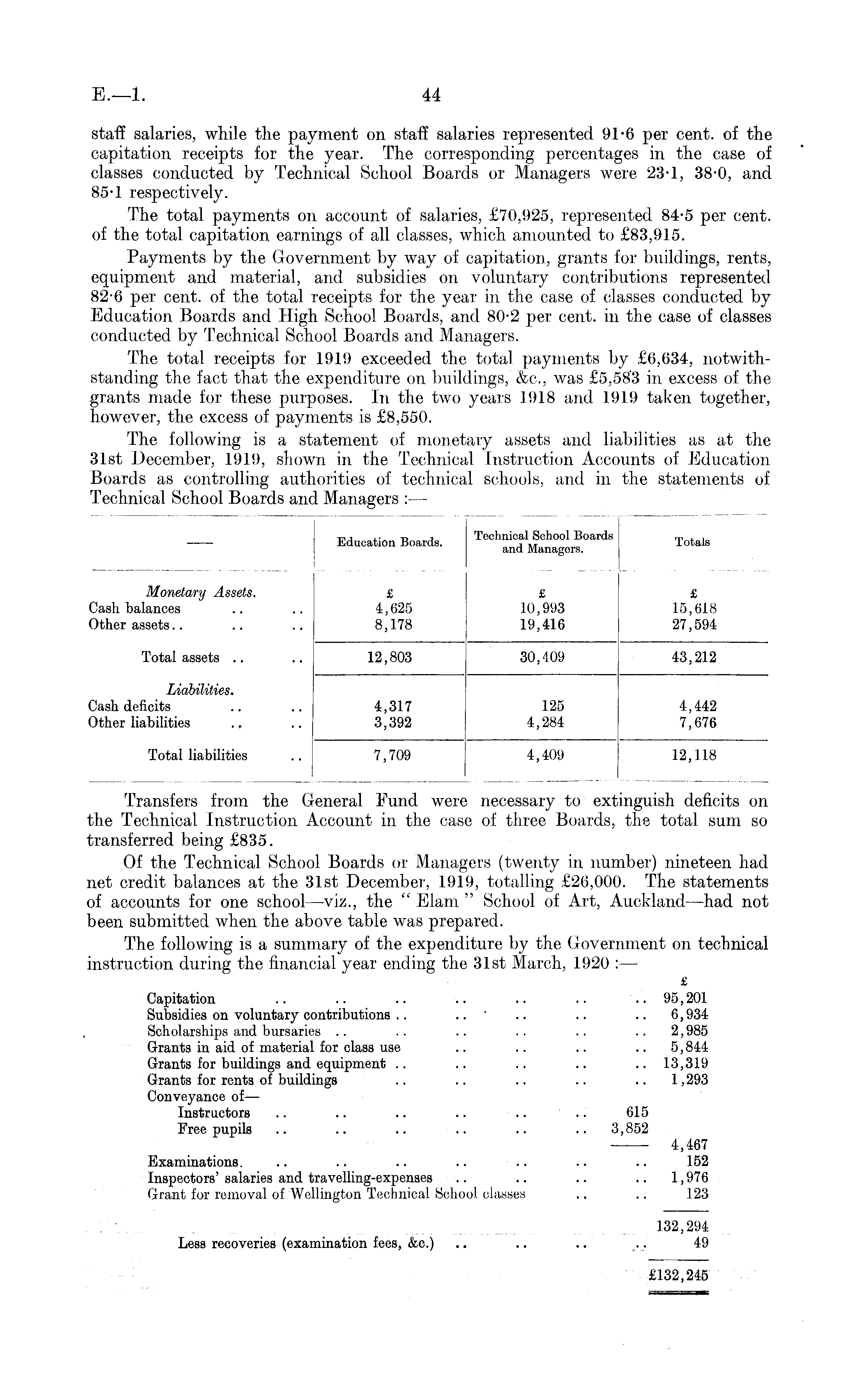 Education Boards. Technical School Boards and Managors. Totals Monetary Assets. Jash balances )ther assets £ 4,625 8,178 £ 10,993 19,416 £ 15,618 27,594 Total assets .. 12,803 30,409 43,212 Liabilities. Jash deficits Ither liabilities 4,31.7 3,392 125 4,284 4,442 7,676 Total liabilities 7,709 4,409 12,118