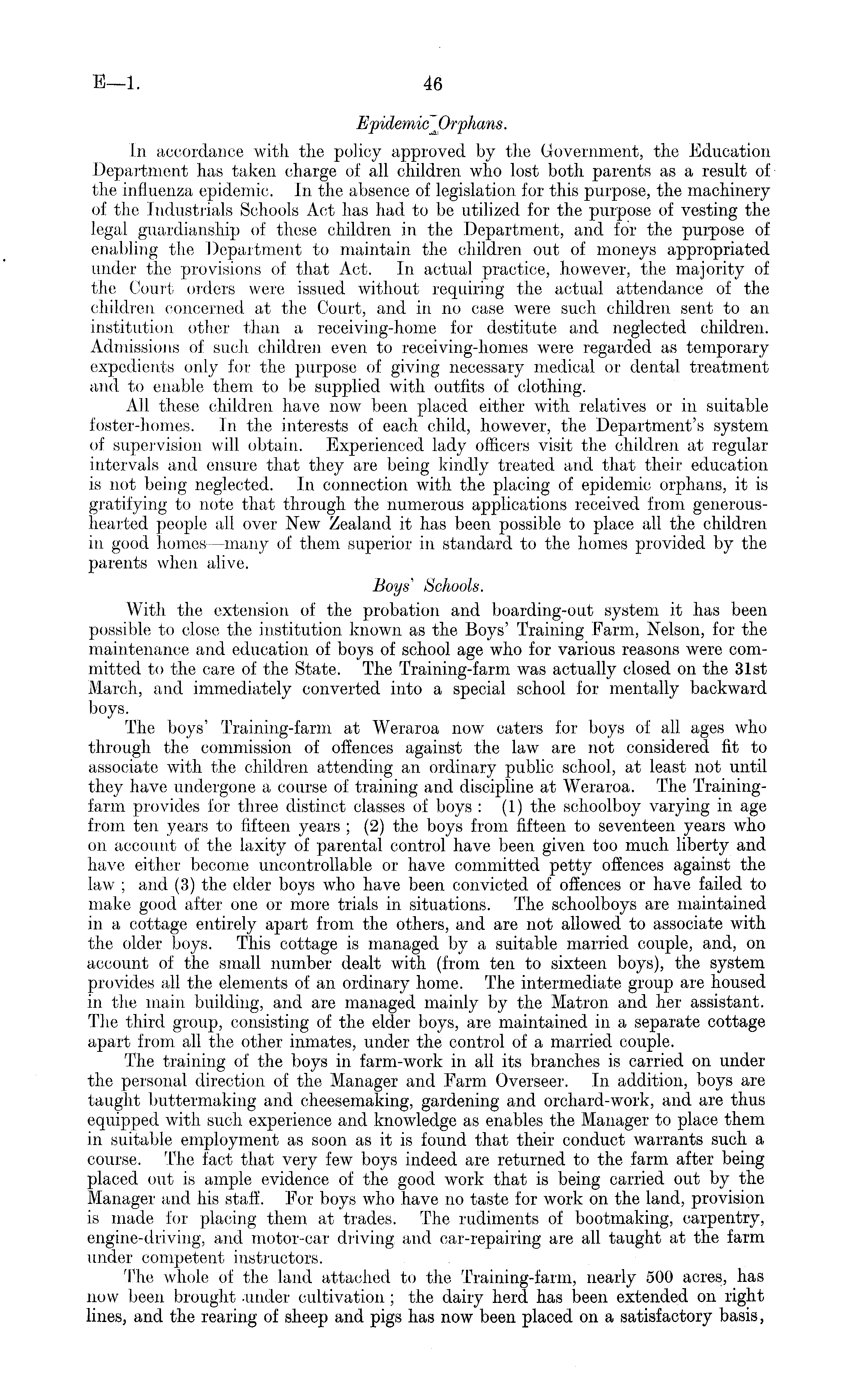 Epidemic~J)rphans. In accordance with the policy approved by the Government, the Education Department has taken charge of all children who lost both parents as a result of the influenza epidemic. In the absence of legislation for this purpose, the machinery of the Industrials Schools Act has had to be utilized for the purpose of vesting the legal guardianship of these children in the Department, and for the purpose of enabling the Department to maintain the children out of moneys appropriated under the provisions of that Act. In actual practice, however, the majority of the Court orders were issued without requiring the actual attendance of the children concerned at the Court, and in no case were such children sent to an institution other than a receiving-home for destitute and neglected children. Admissions of such children even to receiving-homes were regarded as temporary expedients only for the purpose of giving necessary medical or dental treatment and to enable them to be supplied with outfits of clothing. AH these children have now been placed either with relatives or in suitable foster-homes. In the interests of each child, however, the Department's system of supervision will obtain. Experienced lady officers visit the children at regular intervals and ensure that they are being kindly treated and that their education is not being neglected. In connection with the placing of epidemic orphans, it is gratifying to note that through the numerous applications received from generoushearted people all over New Zealand it has been possible to place all the children in good homes—many of them superior in standard to the homes provided by the parents when alive. Boys' Schools. With the extension of the probation and boarding-out system it has been possible to close the institution known as the Boys' Training Farm, Nelson, for the maintenance and education of boys of school age who for various reasons were committed to the care of the State. The Training-farm was actually closed on the 31st March, and immediately converted into a special school for mentally backward boys. The boys' Training-farm at Weraroa now caters for boys of all ages who through the commission of offences against the law are not considered fit to associate with the children attending an ordinary public school, at least not until they have undergone a course of training and discipline at Weraroa. The Trainingfarm provides for three distinct classes of boys : (1) the schoolboy varying in age from ten years to fifteen years ; (2) the boys from fifteen to seventeen years who on account of the laxity of parental control have been given too much liberty and have either become uncontrollable or have committed petty offences against the law ; and (3) the elder boys who have been convicted of offences or have failed to make good after one or more trials in situations. The schoolboys are maintained in a cottage entirely apart from the others, and are not allowed to associate with the older boys. This cottage is managed by a suitable married couple, and, on account of the small number dealt with (from ten to sixteen boys), the system provides all the elements of an ordinary home. The intermediate group are housed in the main building, and are managed mainly by the Matron and her assistant. The third group, consisting of the elder boys, are maintained in a separate cottage apart from all the other inmates, under the control of a married couple. The training of the boys in farm-work in all its branches is carried on under the personal direction of the M.anager and Farm Overseer. In addition, boys are taught buttermaking and cheesemaking, gardening and orchard-work, and are thus equipped with such experience and knowledge as enables the Manager to place them in suitable employment as soon as it is found that their conduct warrants such a course. The fact that very few boys indeed are returned to the farm after being placed out is ample evidence of the good work that is being carried out by the Manager and his staff. For boys who have no taste for work on the land, provision is made for placing them at trades. The rudiments of bootmaking, carpentry, engine-driving, and motor-car driving and car-repairing are all taught at the farm under competent instructors. The whole of the land attached to the Training-farm, nearly 500 acres, has now been brought .under cultivation ; the dairy herd has been extended on right lines, and the rearing of sheep and pigs has now been placed on a satisfactory basis,