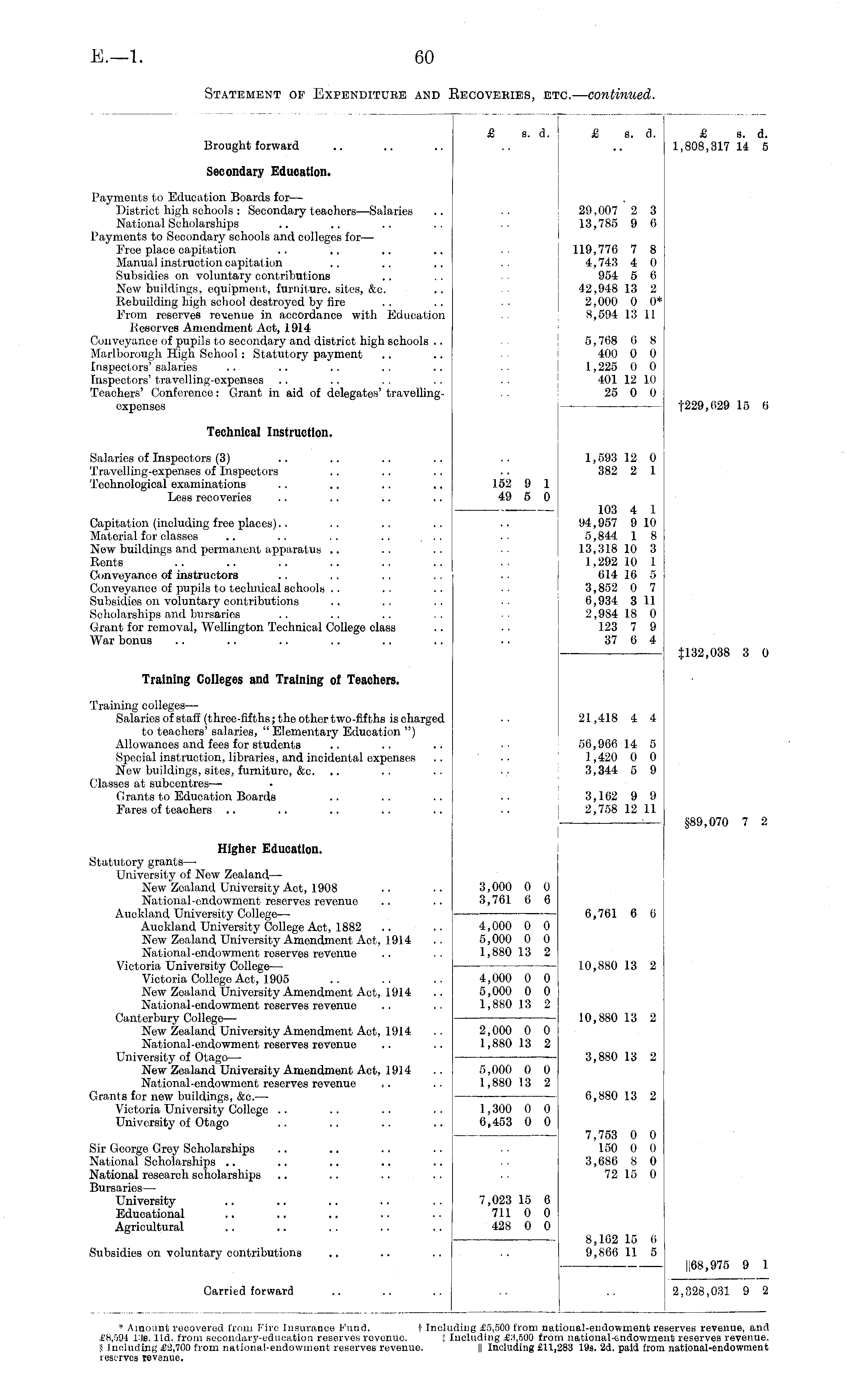 £ s. d. £ s. d. £ s. d. 1,808,317 14 5 Brought forward Secondary Education. Payments to Education Boards for— District high schools : Secondary teachers—Salaries National Scholarships Payments to Secondary sohools and colleges for— Free place capitation Manual instruction capitation Subsidies on voluntary contributions Now buildings, equipment, furniture, sites, &c. Rebuilding high school destroyed by fire From reserves revenue in accordance with Education Beservcs Amendment Act, 1914 Conveyance of pupils to secondary and district high schools .. Marlborough High School: Statutory payment Inspectors' salaries Inspectors' travelling-oxpenses Teachers' Conference: Grant in aid of delegates' travellingexpenses 29,007 2 3 1.3,785 9 6 119,776 7 8 4,743 4 0 954 5 6 42,948 13 2 2,000 0 0* 8,594 13 11 f229,629 15 6 5,768 6 8 400 0 0 1,225 0 0 401 12 10 25 0 0 Technical Instruction. Salaries of Inspectors (3) Travelling-expenses of Inspectors Technological examinations Less recoveries 152 9 1 49 5 0 1,593 12 0 382 2 1 Capitation (including free places) Material for classes .. .. .. .. ... New buildings and permanent apparatus Rents Conveyance of instructors Conveyance of pupils to technical schools Subsidies on voluntary contributions Scholarships and bursaries Grant for removal, Wellington Technical College class War bonus 103 4 1 94,957 9 10 5,844 1 8 13,318 10 3 1,292 10 1 614 16 5 3,852 0 7 0,934 3 11 2,984 18 0 123 7 9 37 6 4 $132,038 8 0 Training Colleges and Training of Teachers. Training colleges—■ Salaries of staff (three-fifths; the other two-fifths is charged to teachers' salaries, " Elementary Education ") Allowances and fees for students Special instruction, libraries, and incidental expenses New buildings, sites, furniture, &c. Classes at subcentres— Grants to Education Boards Fares of teachers 21,418 4 4 50,966 14 5 1,420 0 0 3,344 5 9 §89,070 7 2 3,162 9 9 2,758 12 11 Higher Education. Statutory grants — University of Now Zealand — New Zealand University Act, 1908 National-endowment reserves revenue Auckland University College— Auckland University College Act, 1882 New Zealand University Amendment Act, 1914 National-endowment reserves revenue Victoria University College— Victoria College Act, 1905 Now Zealand University Amendment Act, 1914 National-endowment reserves revenue Canterbury College— New Zealand University Amendment Act, 1914 National-endowment reserves revenue University of Otago— New Zealand University Amendment Act, 1914 National-endowment reserves revenue Grants for new buildings, &c.— Victoria University College University of Otago 3,000 0 0 3,761 6 6 4,000 0 0 5,000 0 0 1,880 13 2 4,000 0 0 5,000 0 0 1,880 13 2 6,761 6 6 10,880 13 2 10,880 13 2 2,000 0 0 1,880 1.3 2 3,880 13 2 5,000 0 0 1,880 13 2 0,880 13 2 1,300 0 0 6,453 0 0 7,753 0 0 150 0 0 3,686 8 0 72 15 0 Sir George Crey Scholarships National Scholarships National research scholarships Bursaries — University Educational Agricultural 7,023 15 6 711 0 0 428 0 0 8,102 15 6 9,866 11 5 Subsidies on voluntary contributions ||68,975 9 1 Carried forward 2,328,031 9 2 * Amount recovered from Fire Insurance Fund. I Inel £8,504 13s. lid. from secondary-education reserves revenue. S Including £-J,700 from national-endowment reserves revenue, reserves revenue. iding £5,500 from nat: Including £3,500 fron || Including £11,5 ional-endowment rei l national-endowmei »83 19s. 2d. paid from serves revenue, and nt reserves revenue. national-endowment