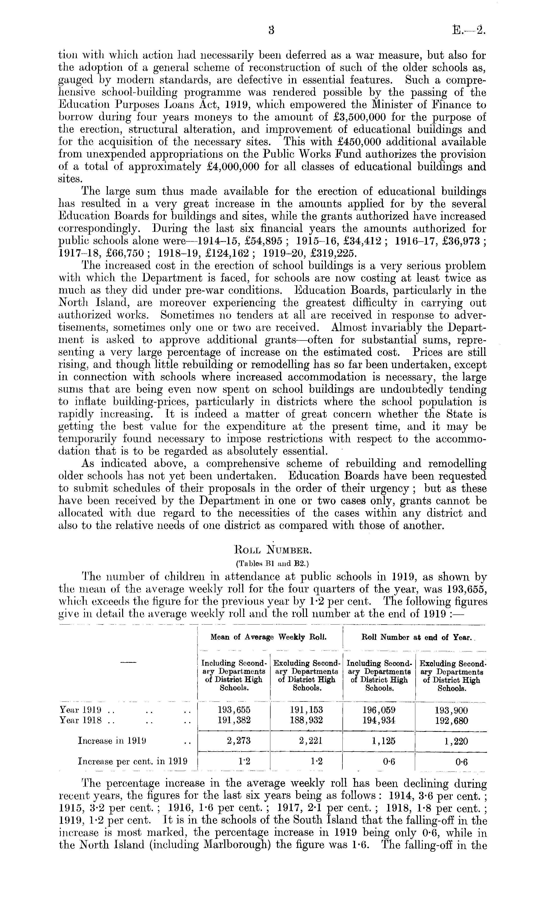 tion with which action had necessarily been deferred as a war measure, but also for the adoption of a general scheme of reconstruction of such of the older schools as, gauged by modern standards, are defective in essential features. Such a comprehensive school-building programme was rendered possible by the passing of the Education Purposes Loans Act, 1919, which empowered the Minister of Finance to borrow during four years moneys to the amount of £3,500,000 for the purpose of the erection, structural alteration, and improvement of educational buildings and for the acquisition of the necessary sites. This with £450,000 additional available from unexpended appropriations on the Public Works Fund authorizes the provision of a total of approximately £4,000,000 for all classes of educational buildings and sites. The large sum thus made available for the erection of educational buildings has resulted in a very great increase in the amounts applied for by the several Education Boards for buildings and sites, while the grants authorized have increased correspondingly. During the last six financial years the amounts authorized for public schools alone were—l9l4-15, £54,895 ; 1915-16, £34,412 ; 1916-17, £36,973 ; 1917-18, £66,750 ; 1918-19, £124,162 ; 1919-20, £319,225. The increased cost in the erection of school buildings is a very serious problem with which the Department is faced, for schools are now costing at least twice as much as they did under pre-war conditions. Education Boards, particularly in the North Island, are moreover experiencing the greatest difficulty in carrying out authorized works. Sometimes no tenders at all are received in response to advertisements, sometimes only one or two are received. Almost invariably the Department is asked to approve additional grants —often for substantial sums, representing a very large percentage of increase on the estimated cost. Prices are still rising, and though little rebuilding or remodelling has so far been undertaken, except in connection with schools where increased accommodation is necessary, the large sums that are being even now spent on school buildings are undoubtedly tending to inflate building-prices, particularly in districts where the school population is rapidly increasing. It is indeed a matter of great concern whether the State is getting the best value for the expenditure at the present time, and it may be temporarily found necessary to impose restrictions with respect to the accommodation that is to be regarded as absolutely essential. As indicated above, a comprehensive scheme of rebuilding and remodelling older schools has not yet been undertaken. Education Boards have been requested to submit schedules of their proposals in the order of their urgency ; but as these have been received by the Department in one or two cases only, grants cannot be allocated with due regard to the necessities of the cases within any district and also to the relative needs of one district as compared with those of another. Roll Number. (Tables Bl and 82.) The number of children in attendance at public schools in 1919, as shown by the mean of the average weekly roll for the four quarters of the year, was 193,655, which exceeds the figure for the previous year by 1-2 per cent. The following figures give in detail the average weekly roll and the roll number at the end of 1919 : —