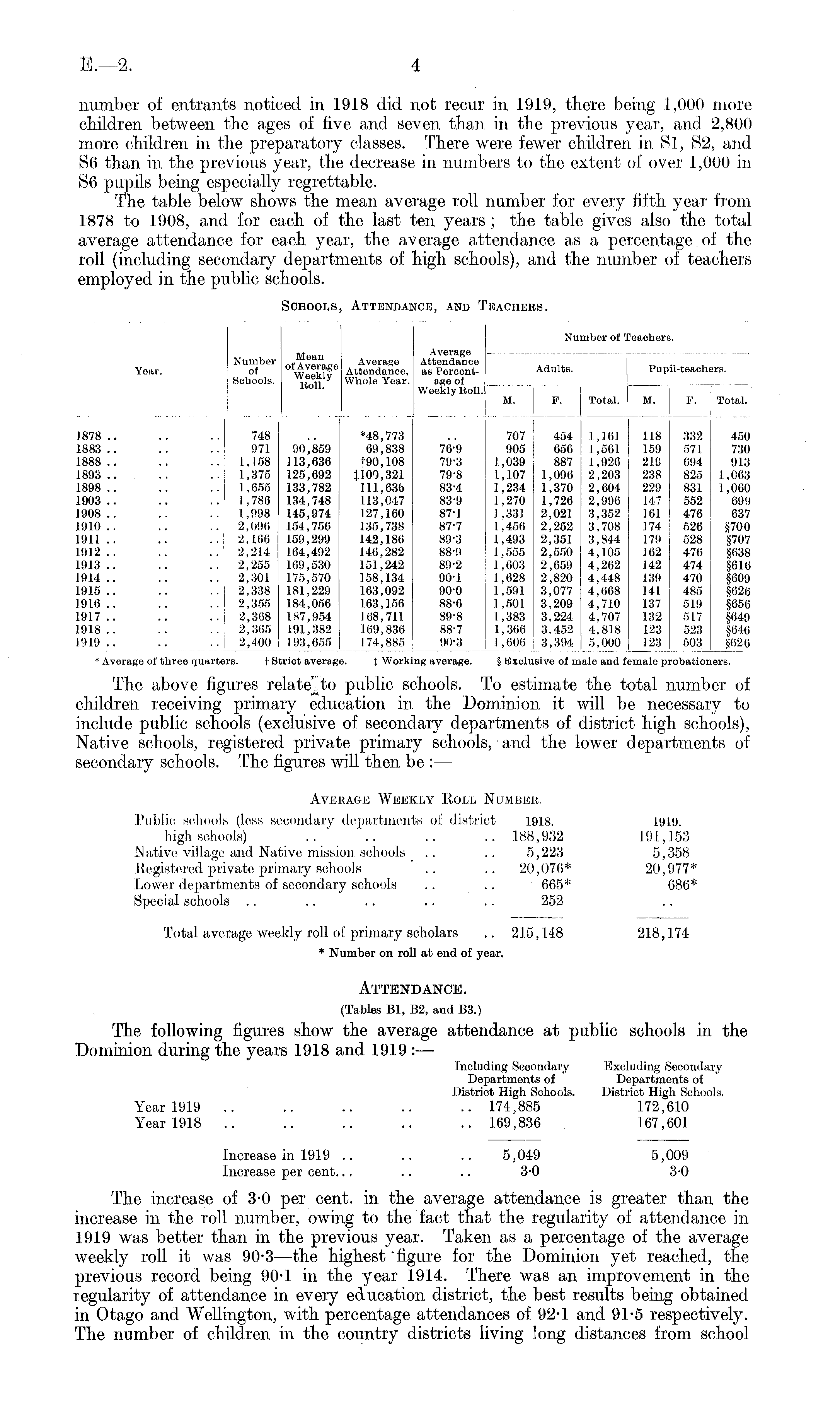 Number rf ¥.!?° Average Year. of wlfEif Attendance, Schools. ifoli y Whole Year. 1878 .. .. .. 748 .. *48,773 1883 .. .. .. 971 90,859 69,838 1888.. .. ..I 1,158 113,636 +90,108 1893.. .. .. 1,375 125,692 i.100,321 1898.. .. .. 1,655 133,782 111,636 1903.. .. .. 1,786 134,748 113,047 1908.. .. .. 1,998 145,974 127,160 1910.. .. .. 2,096 154,756 135,738 1911 .. .. .. 2,166 159,299 142,186 1912.. .. .. 2,214 164,492 146,282 1913.. .. .. 2,255 169,530 151,242 1914.. .. .. 2,301 175,570 158,134 1915.. .. .. 2,338 181,229 163,092 1916.. .. .. 2,355 184,056 163,156 1917.. .. .. 2,368 187,954 168,711 1918.. .. ..j 2,365 191,382 169,836 1919 .. ■■ .. 2,400 193,655 174,885 * Average of three quarters. t Strict average. t Worki Average Attendance as Percentage of Weekly Moll. 76-9 79-3 79-8 83-4 83-9 87-1 87-7 89-3 88-9 89-2 90-1 90-0 88-6 89-8 88-7 90-3 M. I 707 905 ; 1,039 1.107 1,234 1,270 1.331 1.456 1,493 1.555 1,603 1,628 1,591 1,501 1,383 1,366 1,606 § H.xclu: Number ol '1 Adults. F. Total. I 454 1,161 656 1,561 887 1,926 1,096 2,203 1,370 2,604 1,726 2,996 2,021 3,352 2,252 3,708 2,351 3,844 2,550 4,105 2,659 4,262 2,820 4,448 3,077 4,068 3,209 4,710 3,224 4,707 3,452 4,818 3,394 5,000 rsive of male and fi Poachers Pup: M. .118 159 219 238 229 147 161 174 179 162 142 139 141 137 132 123 123 o-nralo pi il-teachi P. 332 571 094 825 831 552 476 526 528 476 474 470 485 519 517 523 503 -obatior ors. Total. 450 730 913 1.063 1,060 699 637 §700 .707 §038 §616 §609 §026 §656 §649 §646 §626 ing average. lers.