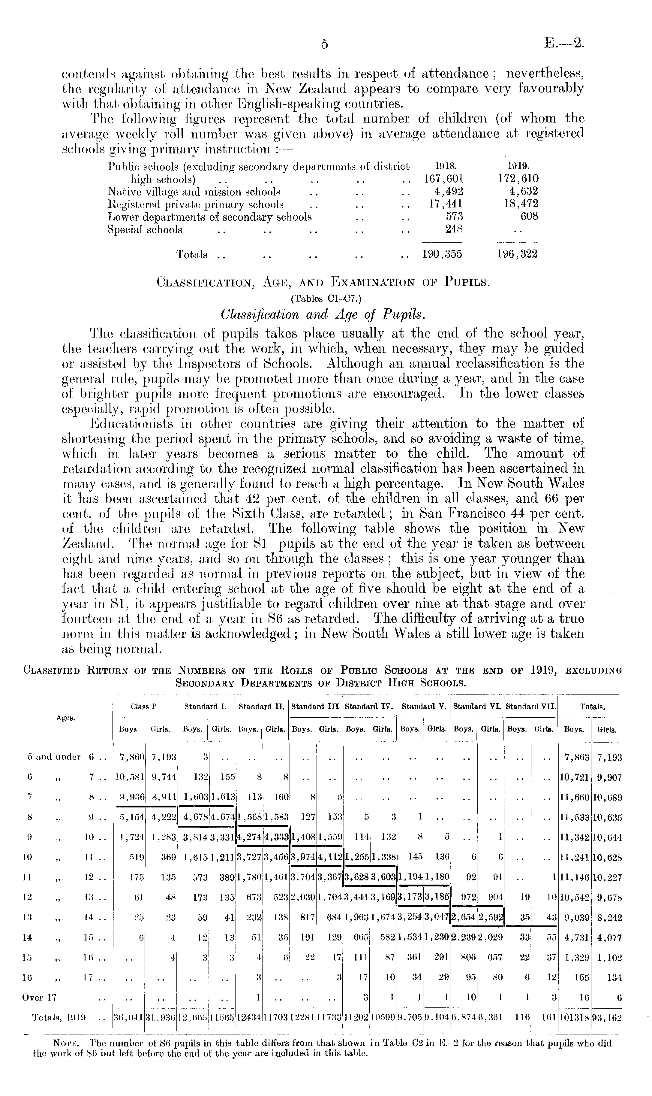 contends against obtaining the best results in respect of attendance ; nevertheless, the regularity of attendance in New Zealand appears to compare very favourably with that obtaining in other English-speaking countries. The following figures represent the total number of children (of whom the average weekly roll number was given above) in average attendance at registered schools giving primary instruction : — Public schools (excluding secondary departments of district 1918. 1919. high schools) .. .. .. .. .. 167,601 '172,610 Native village and mission schools .. .. .. 4,492 4,632 Registered private primary schools .. .. .. 17,441 18,472 Lower departments of secondary schools .. .. 573 608 Special schools .. .. .. .. .. 248 Totals .. .. .. .. .. 190,355 196,322 Classification, Age, and Examination oe Pupils. (Tables Cl-07.) Classification and Age of Pupils. The classification of pupils takes place usually at the end of the school year, the teachers carrying out the work, in which, when necessary, they may be guided or assisted by the Inspectors of Schools. Although, an annual reclassification is the general rule, pupils may be promoted more than once during a year, and in the case of brighter pupils more frequent promotions are encouraged. In the lower classes especially, rapid promotion is often possible. Educationists in other countries are giving their attention to the matter of shortening the period spent in the primary schools, and so avoiding a waste of time, which in later years becomes a serious matter to the child. The amount of retardation, according to the recognized normal classification, has been ascertained in many cases, and is generally found to reach, a high percentage. \n New South Wales it has been ascertained that 42 per cent, of the children in all classes, and 66 per cent, of the pupils of the Sixth Class, are retarded ; in San Francisco 44 per cent. of the children are retarded. The following table shows the position in New Zealand. The normal age for Si pupils at the end of the year is taken as between eight and nine years, and so on through the classes ; this is one year younger than has been regarded as normal in previous reports on the subject, but in view of the fact that a child entering school at the age of five should be eight at the end of a year in Si, it appears justifiable to regard children over nine at that stage and over fourteen at the end of a year in S6 as retarded. The difficulty of arriving at a true norm in this matter is acknowledged; in New South Wales a still lower age is taken as being normal.