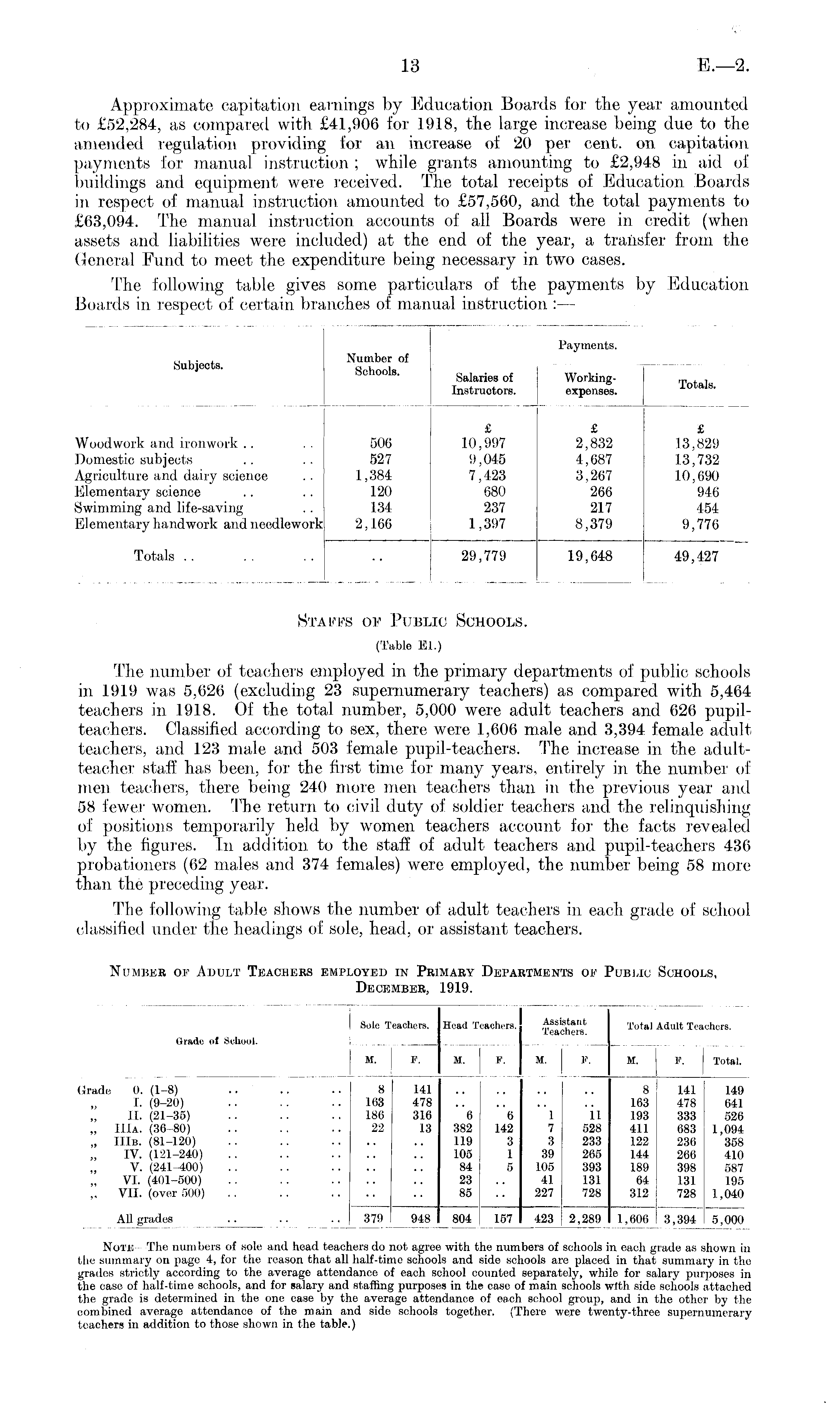 Stapfs op Public Schools. (Table El.) The number of teachers employed in the primary departments of public schools in 1919 was 5,626 (excluding 23 supernumerary teachers) as compared with 5,464 teachers in 1918. Of the total number, 5,000 were adult teachers and 626 pupilteachers. Classified according to sex, there were 1,606 male and 3,394 female adultteachers, and 123 male and 503 female pupil-teachers. The increase in the adultteacher staff has been, for the first time for many years, entirely in the number of men teachers, there being 240 more men teachers than in the previous year and 58 fewer women. The return to civil duty of soldier teachers and the relinquishing of positions temporarily held by women teachers account for the facts revealed by the figures. In addition to the staff of adult teachers and pupil-teachers 436 probationers (62 males and 374 females) were employed, the number being 58 more than the preceding year. The following table shows the number of adult teachers in each grade of school, classified under the headings of sole, head, or assistant teachers.