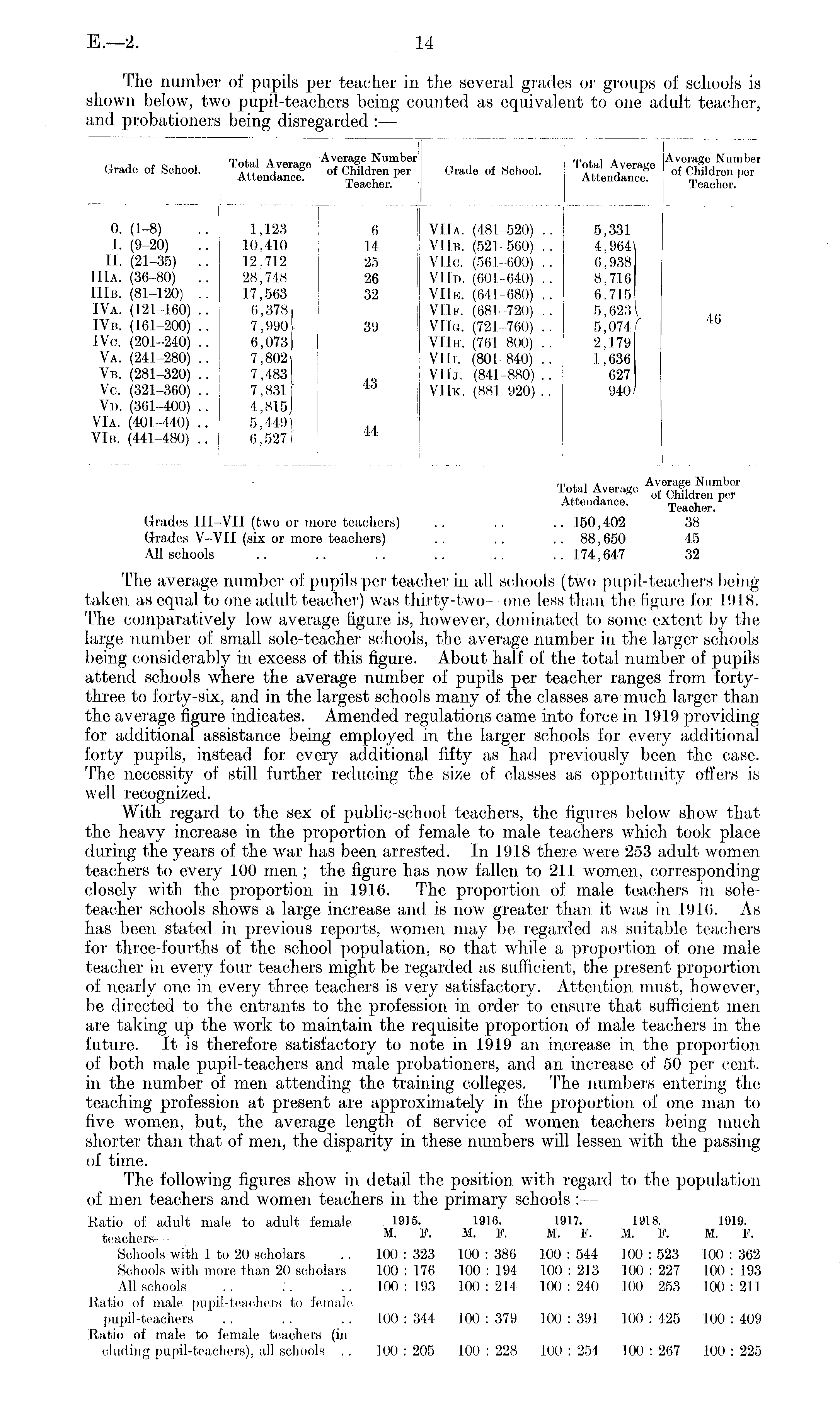 „, , , . Average Number iotal Average , ,-._°._ ■, ... , fe ot Children per Attendance. m v Teacher. Grades 111-VII (two or more teachers) .. .. .. 150,402 38 Grades V-VII (six or more teachers) . . .. . . 88,650 45 All schools .. .. .. .. .. .. 174,647 32 The average number of pupils per teacher in all schools (two pupil-teachers being taken as equal to one adult teacher) was thirty-two—one less than the figure for 1918. The comparatively low average figure is, however, dominated to some extent by the large number of small sole-teacher schools, the average number in the larger schools being considerably in excess of this figure. About half of the total number of pupils attend schools where the average number of pupils per teacher ranges from fortythree to forty-six, and in the largest schools many of the classes are much larger than the average figure indicates. Amended regulations came into force in 1919 providing for additional assistance being employed in the larger schools for every additional forty pupils, instead for every additional fifty as had previously been the case. The necessity of still further reducing the size of classes as opportunity offers is well recognized. With regard to the sex of public-school teachers, the figures below show that the heavy increase in the proportion of female to male teachers which took place during the years of the war has been, arrested. In 1918 there were 253 adult women teachers to every 100 men ; the figure has now fallen to 211 women, corresponding closely with the proportion in 1916. The proportion of male teachers in soleteacher schools shows a large increase and is now greater than it was in 1916. As has been stated in previous reports, women may be regarded as suitable teachers for three-fourths of the school population, so that while a proportion of one male teacher in every four teachers might be regarded as sufficient, the present proportion of nearly one in every three teachers is very satisfactory. Attention must, however, be directed to the entrants to the profession in order to ensure that sufficient men are taking up the work to maintain the requisite proportion of male teachers in the future. It is therefore satisfactory to note in 1919 an increase in the proportion of both male pupil-teachers and male probationers, and an increase of 50 per cent. in the number of men attending the training colleges. The numbers entering the teaching profession at present are approximately in the proportion of one man to five women, but, the average length of service of women teachers being much shorter than that of men, the disparity in these numbers will lessen with the passing of time. The following figures show in detail the position with regard to the population of men teachers and women teachers in the primary schools : — Ratio of adult male to adult female . 1915. 1910. 1917. 1918. 1919. teachers- M - V - M> F ' M> F ' M ' Fl M ' ¥ - Schools with 1 to 20 scholars .. 100:323 100:386 100:544 100:523 100:362 Schools with more than 20 scholars 100 : 176 100 : 194 100 : 213 100 : 227 100 : 193 All schools .. ;. .. 100:193 100:214 100:240 100 253 100:211 Ratio of male pupil-teachers to female pupil-teachers " . . . . . . 100 : 344 100 : 379 100 : 391 100 : 425 100 : 409 Ratio of male to female teachers (in eluding pupil-teachers), all schools . . 100 : 205 100 : 228 100 : 251 100 : 267 100 : 225