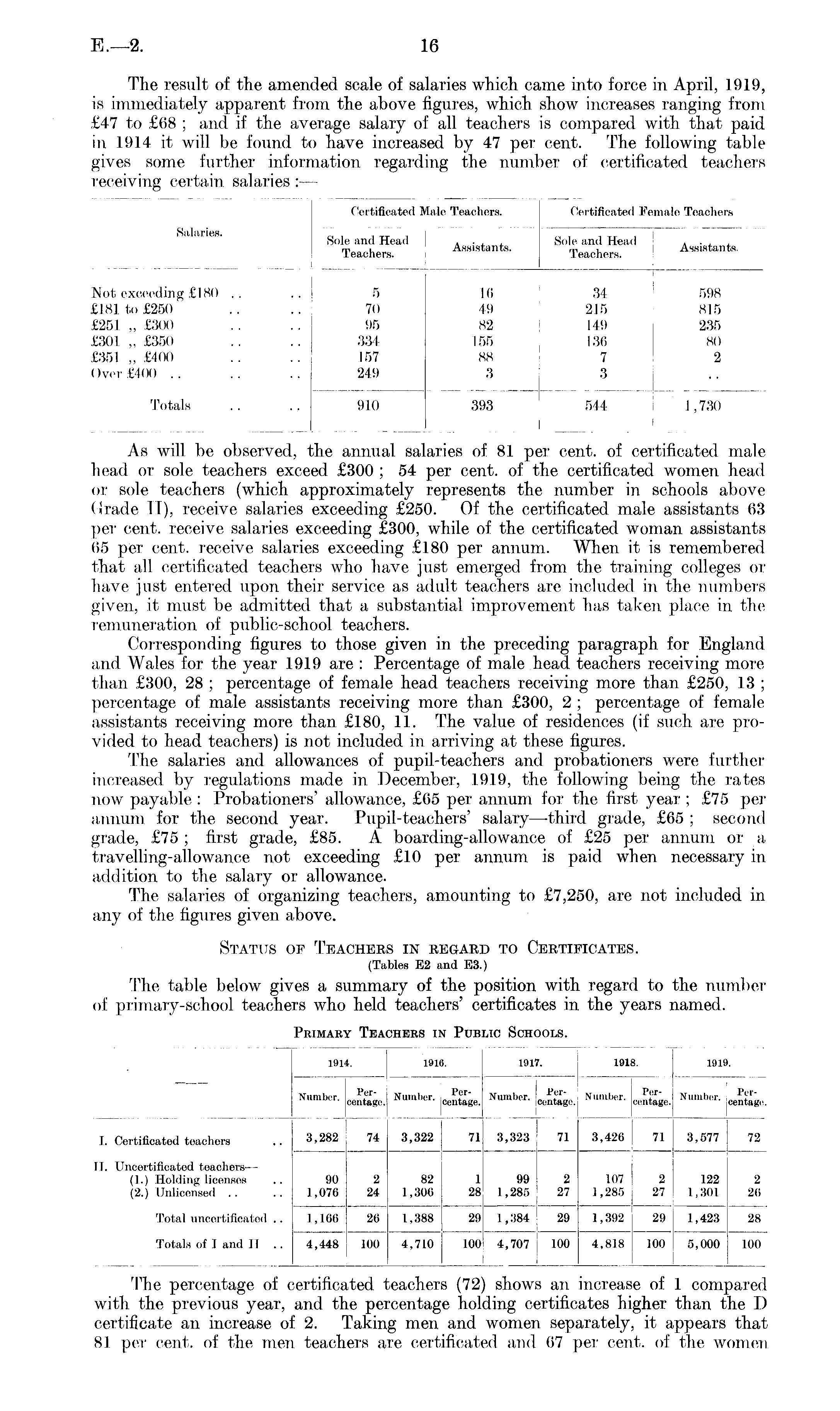 As will be observed, the annual salaries of 81 per cent, of certificated male head or sole teachers exceed £300 ; 54 per cent, of the certificated women head or sole teachers (which approximately represents the number in schools above Grade TI), receive salaries exceeding £250. Of the certificated male assistants 63 per cent, receive salaries exceeding £300, while of the certificated woman assistants 65 per cent, receive salaries exceeding £180 per annum. When it is remembered that all certificated teachers who have just emerged from the training colleges or have just entered upon their service as adult teachers are included in the numbers given, it must be admitted that a substantial improvement has taken place in the remuneration of public-school teachers. Corresponding figures to those given in the preceding paragraph for England and Wales for the year 1919 are : Percentage of male head teachers receiving more than £300, 28 ; percentage of female head teachers receiving more than £250, 13 ; percentage of male assistants receiving more than £300, 2 ; percentage of female assistants receiving more than £180, 11. The value of residences (if such, are provided to head teachers) is not included in arriving at these figures. The salaries and allowances of pupil-teachers and probationers were further increased by regulations made in December, 1919, the following being the rates now payable : Probationers' allowance, £65 per annum for the first year ; £75 per annum for the second year. Pupil-teachers' salary—-third grade, £65 ; second grade, £75 ; first grade, £85. A boarding-allowance of £25 per annum or a, travelling-allowance not exceeding £10 per annum is paid when necessary in addition to the salary or allowance. The salaries of organizing teachers, amounting to £7,250, are not included in any of the figures given above. Status or Teachers in regard to Certificates. (Tables E2 and E3.) The table below gives a summary of the position, with regard to the number of primary-school teachers who held teachers' certificates in the years named.