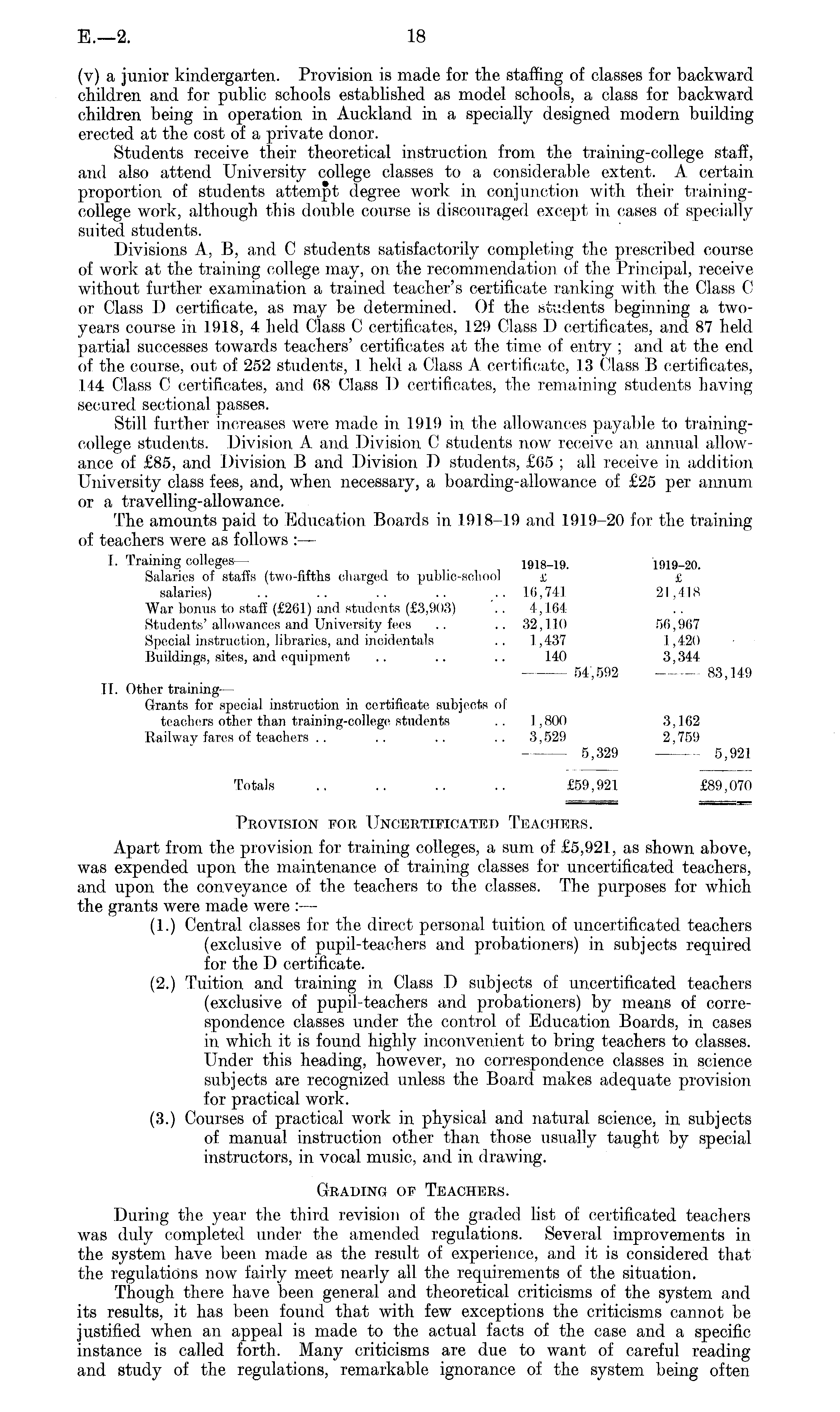(v) a junior kindergarten. Provision is made for the staffing of classes for backward children and for public schools established as model schools, a class for backward children being in operation in Auckland in a specially designed modern building erected at the cost of a private donor. Students receive their theoretical instruction from the training-college staff, and also attend University college classes to a considerable extent. A certain proportion of students attempt degree work in conjunction with their trainingcollege work, although this double course is discouraged except in cases of specially suited students. Divisions A, B, and C students satisfactorily completing the prescribed course of work at the training college may, on the recommendation of the Principal, receive without further examination a trained teacher's certificate ranking with, the Class C or Class D certificate, as may be determined. Of the students beginning a twoyears course in 1918, 4 held Class C certificates, 129 Class D certificates, and 87 held partial successes towards teachers' certificates at the time of entry ; and at the end of the course, out of 252 students, 1 held a Class A certificate, 13 Class B certificates, 144 Class C certificates, and 68 Class D certificates, the remaining students having secured sectional passes. Still further increases were made in 1919 in, the allowances payable to trainingcollege students. Division. A and Division C students now receive an, annual allowance of £85, and Division B and Division D students, £65 ; all receive in addition University class fees, and, when necessary, a boarding-allowance of £25 per annum or a travelling-allowance. The amounts paid to Education Boards in 1918-19 and 1919-20 for the training of teachers were as follows : — I. Training colleges— 1918-19. 1919-20. Salaries of staffs (two-fifths charged to public-Bohool £ a salaries) .. .. .. .. .. 16,741 21,418 War bonus to stafi (£261) and students (£8,903) '.. 4,164 Students'allowances and University fees .. .. 32,110 56,967 Special instruction, libraries, and incidentals .. 1,437 1,420 Buildings, sites, and equipment .. .. .. 140 3,344 54,592 83,149 IT. Other training — Grants for special instruction in certificate subjects of teachers other than training-college students .. 1,800 3,162 Railway fares of teachers . . .'. .. .. 3,529 2,759 5,329 5,921 Totals .. .. .. .. £59,921 £89,070 Provision for Uncertificated Teachers. Apart from the provision for training colleges, a sum of £5,921, as shown above, was expended upon the maintenance of training classes for uncertificated teachers, and upon the conveyance of the teachers to the classes. The purposes for which the grants were made were : — (1.) Central classes for the direct personal tuition of uncertificated teachers (exclusive of pupil-teachers and probationers) in subjects required for the D certificate. (2.) Tuition and training in. Class D subjects of uncertificated teachers (exclusive of pupil-teachers and probationers) by means of correspondence classes under the control of Education Boards, in cases in which it is found highly inconvenient to bring teachers to classes. Under this heading, however, no correspondence classes in science subjects are recognized unless the Board makes adequate provision for practical work. (3.) Courses of practical work in physical and natural science, in subjects of manual instruction other than those usually taught by special instructors, in vocal music, and in drawing. Grading of Teachers. During the year the third revision of the graded list of certificated teachers was duly completed under the amended regulations. Several improvements in the system have been made as the result of experience, and it is considered that the regulations now fairly meet nearly all the requirements of the situation. Though there have been general and theoretical criticisms of the system and its results, it has been found that with few exceptions the criticisms cannot be justified when an appeal is made to the actual facts of the case and a specific instance is called forth. Many criticisms are due to want of careful reading and study of the regulations, remarkable ignorance of the system being often