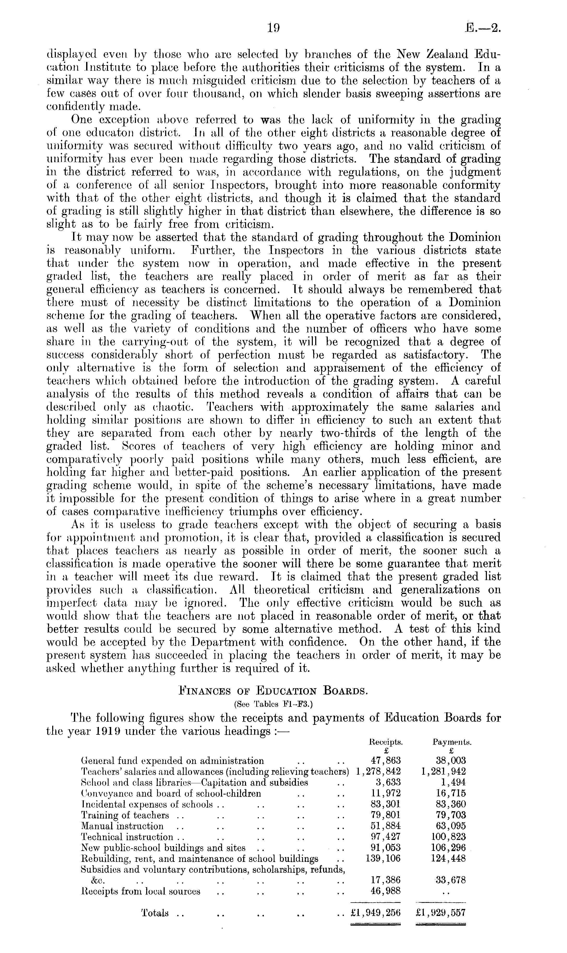 displayed even by those who are selected by branches of the New Zealand Education Institute to place before the authorities their criticisms of the system. In a similar way there is much misguided criticism due to the selection by teachers of a few cases out of over four thousand, on which slender basis sweeping assertions are confidentfy made. One exception above referred to was the lack of uniformity in the grading of one educaton district. In all of the other eight districts a reasonable degree of uniformity was secured without difficulty two years ago, and no vaiid criticism of uniformity has ever been made regarding those districts. The standard of grading in the district referred to was, in accordance with regulations, on the judgment of a conference of all senior inspectors, brought into more reasonable conformity with that of the otter eight districts, and though it is claimed that the standard of grading is still slightly higher in that district than elsewhere, the difference is so slight as to be fairly free from criticism. It may now be asserted that the standard of grading throughout the Dominion is reasonably uniform. Further, the Inspectors in the various districts state that under the system now in operation, and made effective in the present graded list, the teachers are really placed, in order of merit as far as their general efficiency as teachers is concerned. It should always be remembered that there must of necessity be distinct limitations to the operation of a Dominion scheme for the grading of teachers. When all the operative factors are considered, as well as the variety of conditions and the number of officers who have some share in the carrying-out of the system, it will be recognized that a degree of success considerably short of perfection must be regarded as satisfactory. The only alternative is the form of selection and appraisement of the efficiency of teachers which obtained before the introduction of the grading system. A careful analysis of the results of this method reveals a condition of affairs that can be described only as chaotic. Teachers with approximately the same salaries and holding similar positions are shown to differ in efficiency to such an extent that they are separated from each other by nearly two-thirds of the fength of the graded list. Scores of teachers of very high efficiency are holding minor and comparatively poorly paid positions while many others, much less efficient, are holding far higher and better-paid positions. An earlier application of the present grading scheme would, in spite of the scheme's necessary limitations, have made it impossible for the present condition of things to arise where in a great number of cases comparative inefficiency triumphs over efficiency. As it is useless to grade teachers except with the object of securing a basis for appointment and promotion, it is clear that, provided a classification is secured that places teachers as nearly as possible in order of merit, the sooner such a classification is made operative the sooner will there be some guarantee that merit in a teacher will meet its due reward. It is claimed that the present graded list provides such a classification. All theoretical criticism and generalizations on imperfect data may be ignored. The only effective criticism would be such as would show that the teachers are not placed in reasonable order of merit, or that better results could be secured by some alternative method. A test of this kind would be accepted by the Department with confidence. On the other hand, if the present system has succeeded in placing the teachers in order of merit, it may be asked whether anything further is required of it. Finances of Education Boards. (See Tables Fl-F3.) The following figures show the receipts and payments of Education Boards for the year 1919 under the various headings : — Receipts. Payments. £ ' £ General fund expended on administration .. .. 47,863 38,003 Teachers' salaries and allowances (including relieving teachers) .1,278,842 1,281,942 School and class libraries —Capitation and subsidies .. 3,633 1,494 Conveyance and board of school-children .. .. 1.1,972 16,715 Incidental expenses of schools . . .. .. .. 83,301 83,360 Training of teachers .. .. .. .. .. 79,801 79,703 Manual instruction .. .. .. .. .. 51,884 63,095 Technical instruction . . .. .. .. .. 97,427 100,823 New public-school buildings and sites .. .. .. 91,053 106,296 Kebuilding, rent, and maintenance of school buildings .. 139,106 124,448 Subsidies and voluntary contributions, scholarships, refunds, &c. .. .. .. .. .. .. 17,386 33,678 lteceipts from local sources .. .. .. .. 46,988 Totals .. .. .. .. .. £1,949,256 £1,929,557