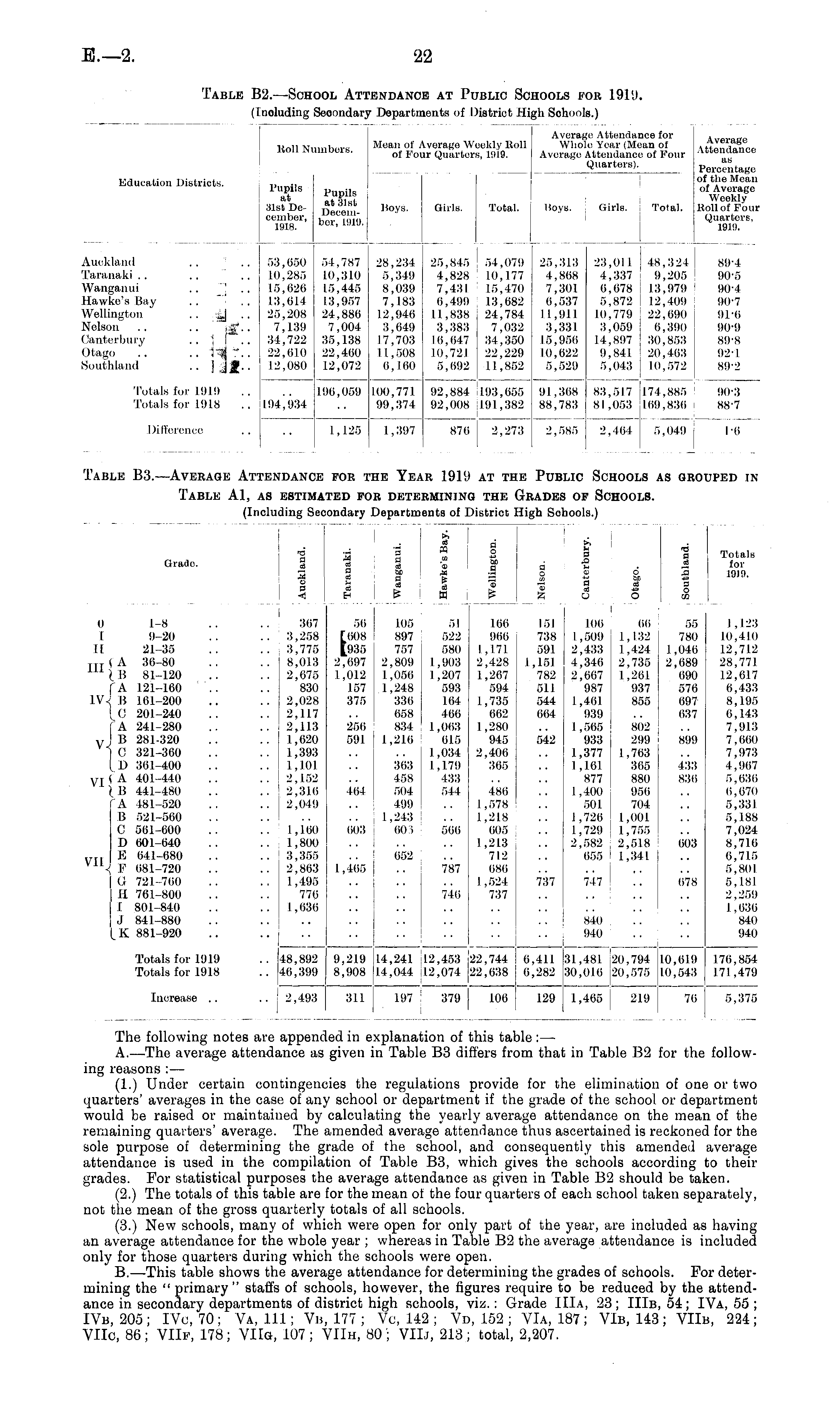 The following notes are appended in explanation of this table : — A.—The average attendance as given in Table B3 differs from that in Table B2 for the following reasons : — (1.) Under certain contingencies the regulations provide for the elimination of one or two quarters' averages in the case of any school or department if the grade of the school or department would be raised or maintained by calculating the yearly average attendance on the mean of the remaining quarters' average. The amended average attendance thus ascertained is reckoned for the sole purpose of determining the grade of the school, and consequently this amended average attendance is used in the compilation of Table 83, which gives the schools according to their grades. For statistical purposes the average attendance as given in Table B2 should be taken. (2.) The totals of this table are for the mean of the four quarters of each school taken separately, not the mean of the gross quarterly totals of all schools. (3.) New schools, many of which were open for only part of the year, are included as having an average attendance for the whole year ; whereas in Table B2 the average attendance is included only for those quarters during which the schools were open. B.—This table shows the average attendance for determining the grades of schools. For determining the " primary " staffs of schools, however, the figures require to be reduced by the attendance in secondary departments of district high schools, viz.: Grade lIIa, 23; lIIb, 54; IVa, 55 ; IVb, 205; IVc, 70; Va, 111; Vu, 177 ; Vc, 142 ; Yd, 152 ; Vla, 187 ; Vlb, 143 ; VIIb, 224; Vile, 86; VIIf, 178; VIIg, 107; VIIh, 80; VIIj, 213; total, 2,207.
