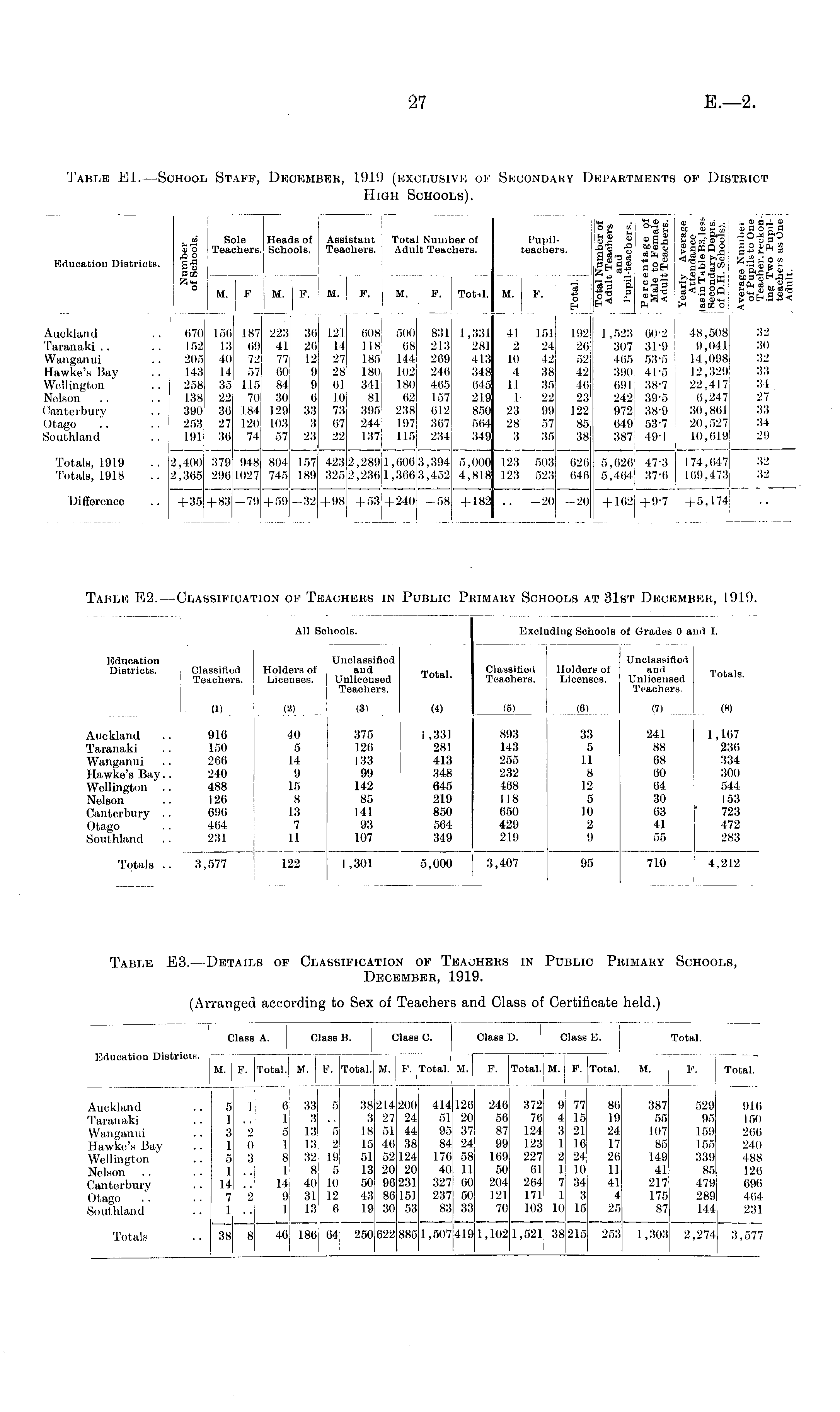 Table E1.—School Staff, December, 1919 (exclusive of Secondary Departments of District High Schools).