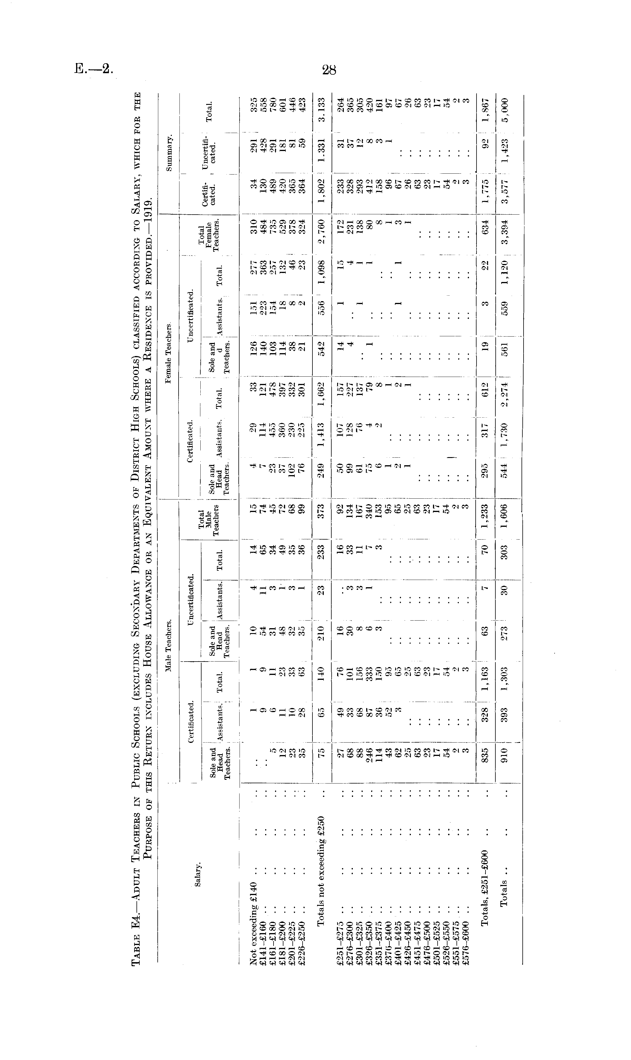 Table E4.—Adult Teachers in Public Schools (excluding Secondary Departments of District High Schools) classified according to Salary, which for the Purpose of this Return includes House Allowance or an Equivalent Amount where a Residence is provided.— 1919.
