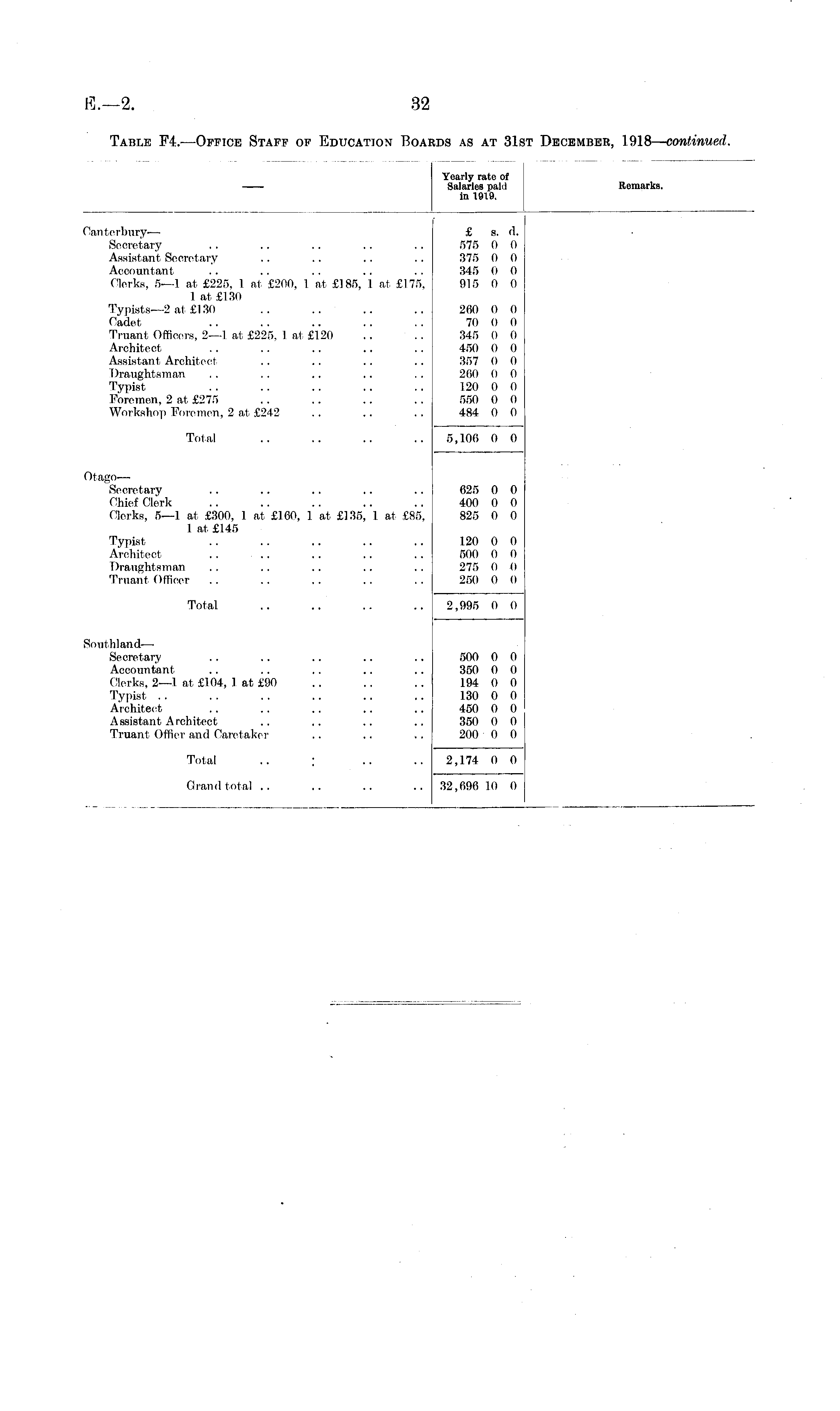 Yearly rate of Salaries paid in 1919. Remarks. Canterbury— Secretary . . Assistant Secretary Accountant Clerks, 5—1 at £225, 1 at £200, 1 at £185, 1 at £175, 1 at £130 Typists—2 at, £130 . . Cadet Truant Officers, 2—1 at £225, 1 at £120 Architect Assistant Architecl Draughtsman Typist Foremen, 2 at £275 Workshop Foremen, 2 at £242 £ s. d. 575 0 0 375 (I 0 345 0 (I 915 0 0 260 (I (I 70 0 0 345 0 0 450 0 0 357 (I 0 200 0 0 120 0 0 550 0 0 484 0 0 Total 5,100 0 0 Itago— Secretary Chief Clerk Clerks, 5—1 at £300, 1 at £160, 1 at £135, 1 at £85. 1 at £145 025 0 0 400 0 (I 825 0 (I Typist Architect .. Draughtsman Truant Officer 120 0 0 500 0 0 275 0 0 250 0 0 Total 2,995 0 (1 Southland— Secretary Accountant Clerks, 2—1 at £104, 1 at £90 Typist Architect Assistant Architect Truant Offier and Caretaker 500 0 0 350 0 0 194 0 0 130 0 0 450 0 0 350 0 0 200 0 0 Total 2,174 0 0 Grand total 32,696 10 0