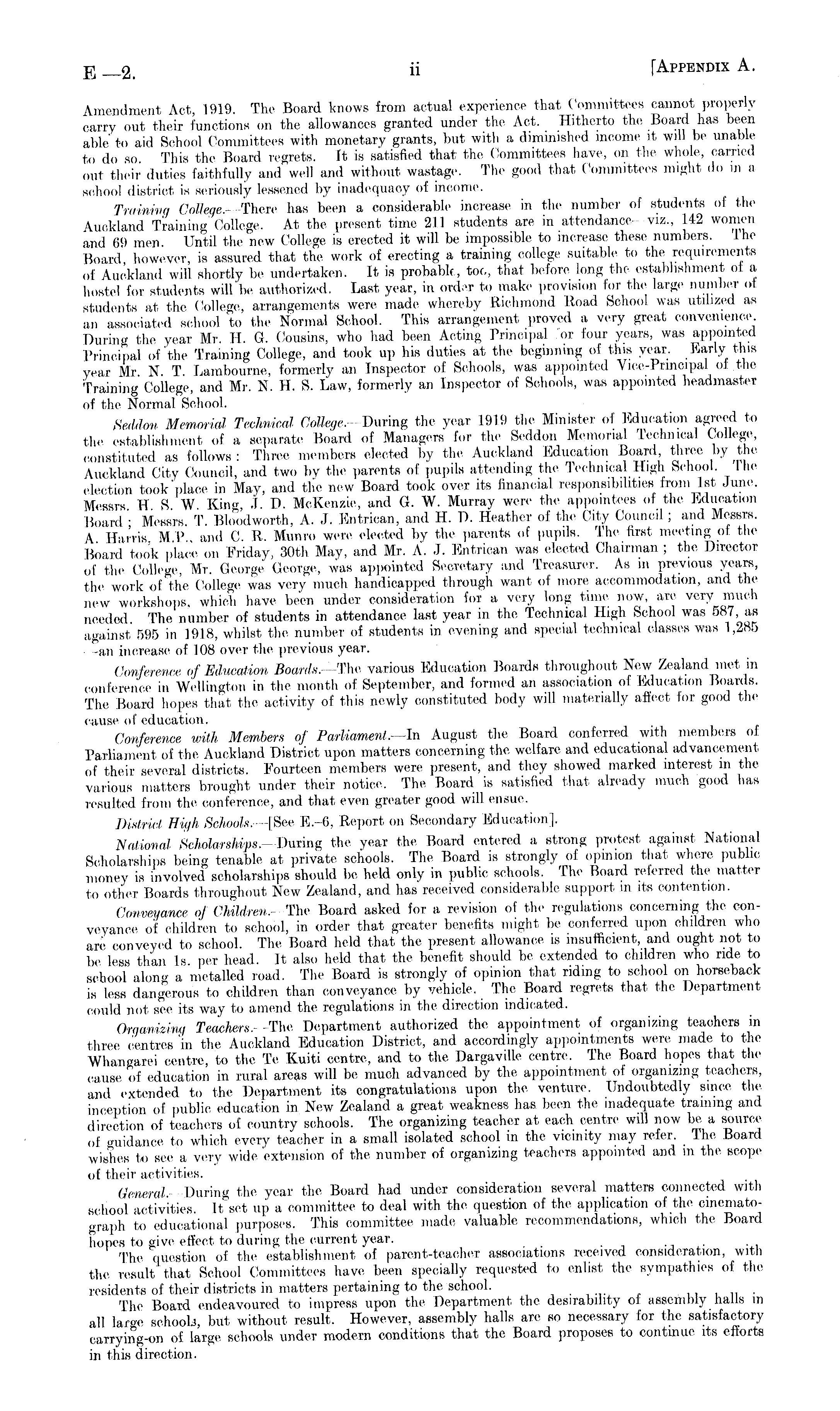 Amendment Act 1919. The Board knows from actual experience that Committees cannot properly carry out their functions on the allowances granted under the Act. Hitherto the Board has been able to aid School Committees with monetary grants, but with a diminished income it will be unable to do so This the Board regrets. It is satisfied that the Committees have, on the whole, carried out their duties faithfully and well and without wastage. The good that Committees might do m a school district is seriously lessened by inadequacy of income. Training College.- There has been a considerable increase in the number of students of the Auckland Training College. At the present time 211 students are in attendance- viz., 142 women and 69 men Until the new College is erected it will be impossible to increase these numbers. Ihe Board, however, is assured that the work of erecting a training college suitable to the requirements of Auckland will shortly be undertaken. It is probable, too, that before long the establishment of a hostel for students will be authorized. Last year, in order to make provision lor the large number ol students at the College, arrangements were made whereby Richmond Road School was utilized as an associated school to the Normal School. This arrangement proved a very great convenience During the year Mr. H. C. Cousins, who had been Acting Principal or four years, was appointed Principal of'the Training College, and took up his duties at the beginning ol this year. Early this year Mr N T. Lambourne, formerly an Inspector of Schools, was appointed Vice-Principal ol the Training College, and Mr. N. H. S. Law, formerly an Inspector of Schools, was appointed headmaster of the Normal School. Seddou Memorial Technical College.- -During the year 1919 the Minister of Education agreed to the establishment of a separate Board of Managers for the Seddon Memorial technical College, constituted as follows: Three members elected by the Auckland Education Board three by the Auckland City Council, and two by the parents of pupils attending the Technical High School. Ihe election took place in May, and the new Board took over its financial responsibilities from Ist June. Messrs H S W King J D. McKenzie, and G. W. Murray were the appointees ol the Education Board"- Messrs. T. Bloodworth, A. J. Bntrican, and 11. I). Heather of the City Council; and Messrs. A Harris MP and C. R. Munro were elected by the parents ol pupils. The first meeting ol the Board took place on Friday, 30th May, and Mr. A. J. Entrican was elected Chairman ; the Director of the College, Mr. George George, was appointed Secretary and Treasurer. As in previous years, the work of the College' was very much handicapped through want of more accommodation, and the new workshops, which have been under consideration for a very long time now, arc very much needed The number of students in attendance last year in the Technical High School was 587, as against 595 in 1918, whilst the number of students in evening and special technical classes was 1,285 - -an increase, of 108 over the previous year. Conference of Education Boards. Tin- various Education Boards throughout New Zealand met in conference in Wellington in the month of September, and formed an association ol Education Hoards. The Board hopes that the activity of this newly constituted body will materially affect lor good the cause of education. Conference with Members of Parliament.—ln August the Board conferred with members of Parliament of the Auckland District upon matters concerning the welfare and educational advancenienl of their several districts. Fourteen members were present, and they showed marked interest in the various matters brought under their notice. The Board is satisfied that already much good has resulted from the conference, and that even greater good will ensue. District High Schools. -[See 8.-6, Report on Secondary Education]. National Scholarships.- During the year the Board entered a strong protest against National Scholarships being tenable at private schools. The Board is strongly of opinion that where public money is involved scholarships should be held only in public schools. The Board referred the matter to other Boards throughout New Zealand, and has received considerable support in its contention. Conveyance of Children- The Board asked for a revision of the regulations concerning the conveyance of children to school, in order that greater benefits might be conferred upon children who are conveyed to school. The Board held that the present allowance is insufficient, and ought not to be less than Is per head. It also held that the benefit should be extended to children who ride to school along a metalled road. The Board is strongly of opinion that riding to school on horseback is less dangerous to children than conveyance by vehicle. The Board regrets that the Department could not see its way to amend the regulations in the direction indicated. Organizing Teachers, The Department authorized the appointment of organizing teachers in three centres'in the Auckland Education District, and accordingly appointments were made to the Whainvarei centre, to the Te Kuiti centre, and to the Dargaville centre. The Board hopes that the cause of education in rural areas will be much advanced by the appointment ol organizing teachers, and extended to the Department its congratulations upon the venture. Undoubtedly since the inception of public education in New Zealand a great weakness has been the inadequate training and direction of teachers of country schools. The organizing teacher at each centre will now be a source of guidance to which every teacher in a small isolated school in the vicinity may refer. Ihe Board wishes to see a very wide extension of the number of organizing teachers appointed and in the scope of their activities. General— During the year the. Board had under consideration several matters connected with school activities. It set up a committe