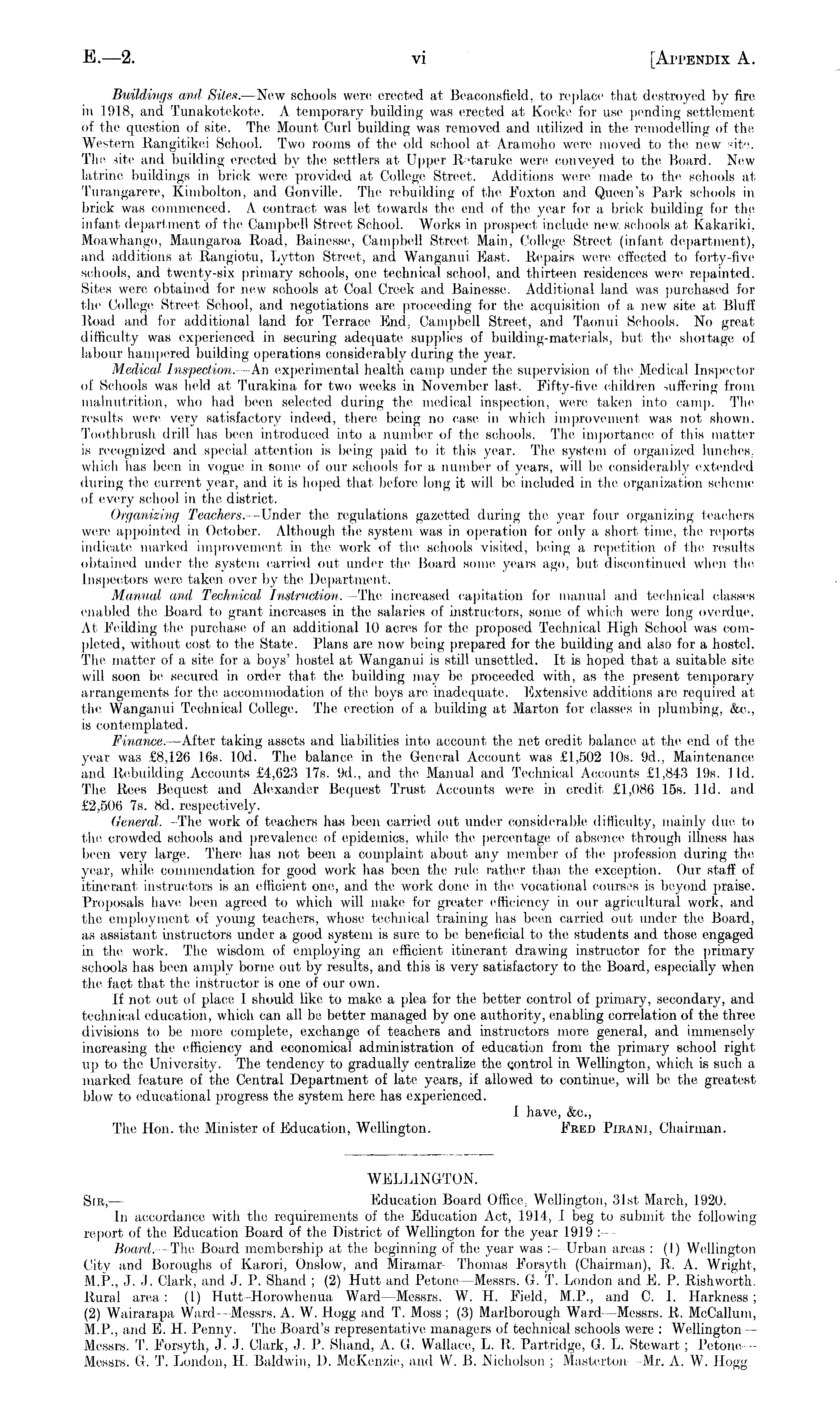 Buildings and Sites. —New schools were erected at Beaconsfield, to replace that destroyed by fire in 1918, and Tunakotekote. A temporary building was erected at Koeke for use pending settlement of the question of site. The Mount Curl building was removed and utilized in the remodelling of the Western Rangitikei School. Two rooms of the old school at Aramobo were moved to the new site. The, site and building erected by the settlers at Upper Retaruke were conveyed to the Board. New latrine, buildings in brick wore provided at College Street. Additions were, made to the schools at Turangarere, Kimbolton, and Gonville. The rebuilding of the Foxton and Queen's Park schools in brick was commenced, A contract was let towards the, end of the, year for a brick building for the infant department of the Campbell Street School. Works in prospect include new schools at Kakariki. Moawhango, Maungaroa Road, Bainesse, Campbell Street Main, College Street (infant department), and additions at Rangiotu, Lytton Street, and Wanganui East. Repairs were effected to forty-five schools, and twenty-six primary schools, one technical school, and thirteen residences were repainted. Sites were obtained for new sohools at Coal Creek and Bainesse. Additional land was purchased for the College Street School, and negotiations are proceeding for the acquisition of a new site at Bluff Road and for additional land for Terrace End, Campbell Street, and Taonui Sohools. No great difficulty was experienced in securing adequate supplies of building-materials, but fix' shortage of labour hampered building operations considerably during the year. Medical Inspection.—An experimental health camp under the supervision of the Medical Inspector of Schools was held at Turakina for two weeks in November last. Fifty-five children suffering from malnutrition, who had been selected during the medical inspection, were taken into camp. The results were very satisfactory indeed, there being no case in which improvement was not shown. Toothbrush drill has been introduced into a number of the, schools. The importance of this matter is recognized and special attention is being paid to it this year. The system of organized lunches, which has been in vogue in some of our schools for a number of years, will be. considerably extended during the current year, and it is hoped that before long it will be included in the organization scheme of every school in the, district. Organizing Teachers.--Under the, regulations gazetted during the year four organizing teachers were appointed in October. Although the system was in operation for only a short time, the reports indicate marked improvement in the work of the schools visited, being a repetition of the results obtained under the system carried out under the Board some years ago, but discontinued when the Inspectors were, taken over by the Department. Manual and Technical Instruction. -The increased capitation for manual and technical classes enabled the Board to grant increases in the salaries of instructors, some of which were long overdue. At Eeilding the purchase of an additional 10 acres for the proposed Technical High School was completed, without cost to the State. Plans are now being prepared for the building and also for a hostel. The matter of a site for a boys' hostel at Wanganui is still unsettled. It is hoped that a suitable site will soon be secured in order that the building may be proceeded with, as the present temporary arrangements for the accommodation of the boys are inadequate. Extensive additions are required at the Wanganui Technical College. The erection of a building at Marton for classes in plumbing, &c., is contemplated. Finance. —After taking assets and liabilities into account the net credit balance at the end of the year was £8,126 16s. lOd. The balance in the General Account was £1,502 10s. 9d., Maintenance and Rebuilding Accounts £4,623 17s. 9d., and the. Manual and Technical Accounts £1,843 19s. I Id. The Rees Bequest and Alexander Bequest Trust Accounts were in credit £1,086 15s. lid. and £2,506 7s. Bd. respectively. General. -The work of teachers has been carried out under considerable difficulty, mainly due to the, crowded schools and prevalence of epidemics, while the percentage of absence through illness has been very large. There, has not been a complaint about any member of the profession during the year, while commendation for good work has been the rule, rather than the, exception. Our staff of itinerant instructors is an efficient one, and the work done in the vocational courses is beyond praise. Proposals have been agreed to which will make for greater efficiency in our agricultural work, and the employment of young teachers, whose technical training has been carried out under the Board, as assistant instructors under a good system is sure to be beneficial to the students and those engaged in the work. The wisdom of employing an efficient itinerant drawing instructor for the primary schools has been amply borne, out by results, and this is very satisfactory to the Board, especially when the fact that the instructor is one of our own. If not out of place, I should like to make a plea for the better control of primary, secondary, and technical education, which can all be better managed by one authority, enabling correlation of the three, divisions to be more complete, exchange of teachers and instructors more general, and immensely increasing the efficiency and economical administration of education from the primary school right up to the University. The tendency to gradually centralize the control in Wellington, which is such a marked feature of the Central Department of late years, if allowed to continue, will be the greatest blow to educational progress the system here has experienced. 1 have, &c, The Hon. the Minister of Education, Wellington. Fred Pirani, Chairman. WELLINGTON. Sir,— Education Board Office, Wellington, 31st March, 1920. In acco
