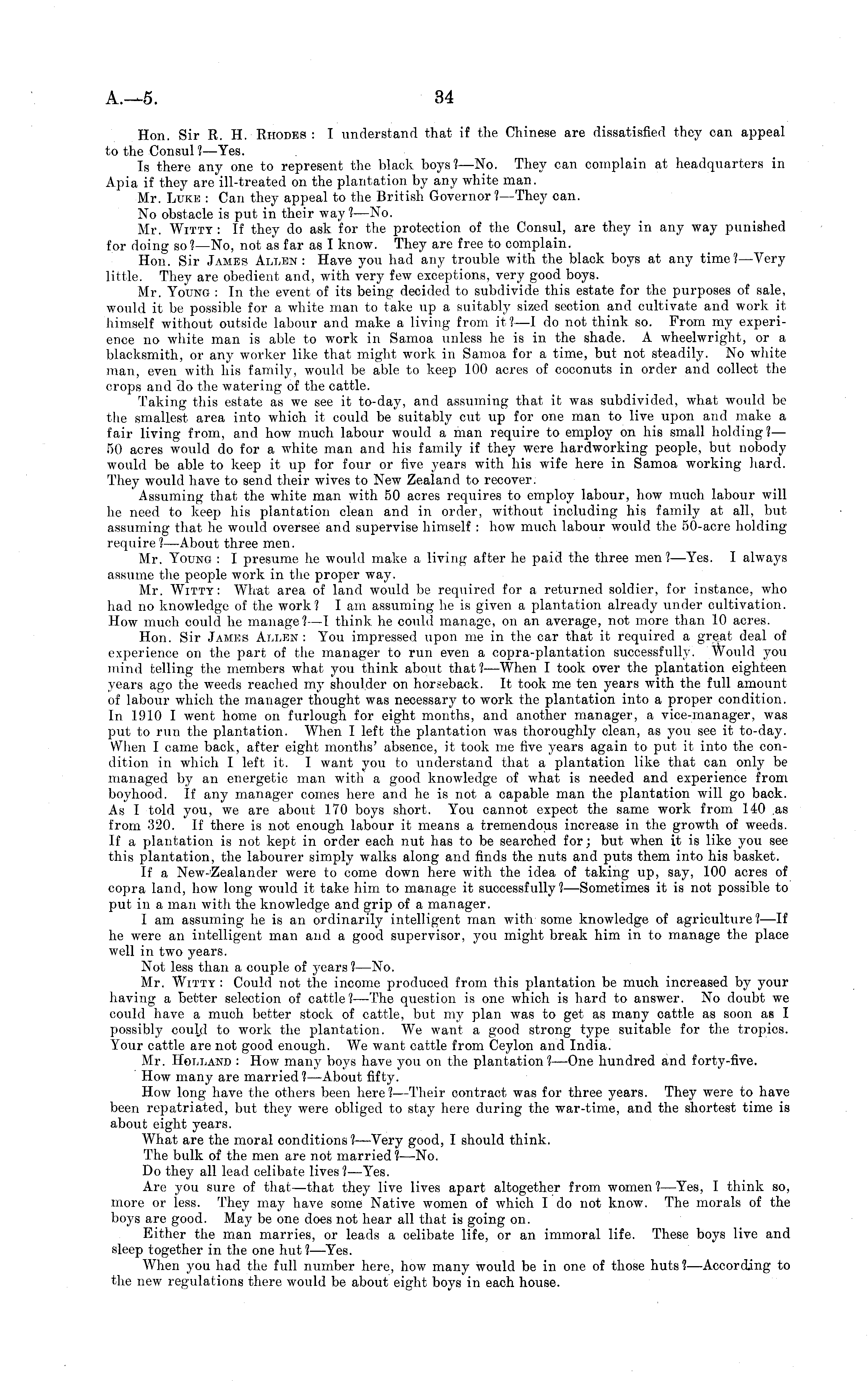 Hon. Sir R. H. Rhodes : I understand that if the Chinese are dissatisfied they can appeal to the Consul ?—Yes. Is there any one to represent the black boys?— No. They can complain at headquarters in Apia if they are ill-treated on the plantation, by any white man. Mr. Luke : Can they appeal to the British Governor ?—They can. No obstacle is put in their way?— No. Mr. Witty : If they do ask for the protection, of the Consul, are they in any way punished for doing so?—No, not as far as I know. They are free to complain. Hon. Sir James Allen: Have you had any trouble with the black boys at any time?— Very little. They are obedient and, with very few exceptions, very good boys. Mr. Young : In the event of its being decided to subdivide this estate for the purposes of sale, would it be possible for a white man to take up a suitably sized section and cultivate and work it himself without outside labour and make a living from it? —I do not think so. From my experience no white man is able to work in Samoa unless he is in the shade. A wheelwright, or a blacksmith, or any worker like that might work in Samoa for a time, but not steadily. No white man, even with his family, would be able to keep 100 acres of coconuts in order and collect the crops and do the watering of the cattle. Taking this estate as we see it to-day, and assuming that it was subdivided, what would be the smallest area into which it could be suitably cut up for one man to live upon and make a fair living from, and how much labour would a man require to employ on his small holding?— 50 acres would do for a white man and his family if they were hardworking people, but nobody would be able to keep it up for four or five years with his wife here in Samoa working hard. They would have to send their wives to New Zealand to recover. Assuming that the white man with 50 acres requires to employ labour, how much labour will he need to keep his plantation clean and in order, without including his family at all, but assuming that he would oversee and supervise himself : how much labour would the 50-acre holding require?— About three men. Mr. Young : I presume he would make a living after he paid the three men?— Yes. I always assume the people work in the proper way. Mr. Witty: What area of land would be required for a returned soldier, for instance, who had no knowledge of the work? lam assuming he is given a plantation already under cultivation. How much could he manage?—l think, he could manage, on an average, not more than 10 acres. Hon. Sir James Allen: You impressed upon me in the car that it required a great deal of experience on the part of the manager to run even a copra-plantation successfully. Would you mind telling the members what you think about that?— When I took over the plantation eighteen years ago the weeds reached my shoulder on horseback. It took me ten years with the full amount of labour which the manager thought was necessary to work the plantation into a proper condition. In 1910 I went home on furlough for eight months, and another manager, a vice-manager, was put to run the plantation. When I left the plantation, was thoroughly clean, as you see it to-day. When I came back, after eight months' absence, it took me five years again to put it into the condition in which I left it. I want you to understand that a plantation like that can only be managed by an energetic man with a good knowledge of what is needed and experience from boyhood. If any manager comes here and he is not a capable man the plantation will go back. As I told you, we are about 170 boys short. You cannot expect the same work from 140 .as from 320. If there is not enough labour it means a tremendous increase in the growth of weeds. If a plantation is not kept in order each nut has to be searched for; but when it is like you see this plantation, the labourer simply walks along and finds the nuts and puts them into his basket. If a New-Zealander were to come down here with the idea of taking up, say, 100 acres of copra land, how long would it take him to manage it successfully ?—Sometimes it is not possible to put in a man with the knowledge and grip of a manager. I am assuming he is an ordinarily intelligent man with some knowledge of agriculture?—lf he were an intelligent man and a good supervisor, you might break him in to manage the place well in two years. Not less than a couple of years ?—No. Mr. Witty : Could not the income produced from this plantation be much increased by your having a better selection of cattle? —The question is one which is hard to answer. No doubt we could have a much better stock of cattle, but my plan was to get as many cattle as soon as I possibly could to work the plantation. We want a good strong type suitable for the tropics. Your cattle are not good enough. We want cattle from Ceylon and India. Mr. Holland : How many boys have you on the plantation?— One hundred and forty-five. How many are married ?—About fifty. How long have the others been here? —Their contract was for three years. They were to have been repatriated, but they were obliged to stay here during the war-time, and the shortest time is about eight years. What are the moral conditions? —Very good, I should think. The bulk of the men are not married? —No. Do they all lead celibate lives?— Yes. Are you sure of that —that they live lives apart altogether from women ?—Yes, I think so, more or less. They may have some Native women of which I do not know. The morals of the boys are good. May be one does not hear all that is going on. Either the man marries, or leads a celibate life, or an immoral life. These boys live and sleep together in the one hut ?—Yes. When you had the full number here, how many would be in one of those huts ?—According to the new regulations there would be about eight boys in each house.
