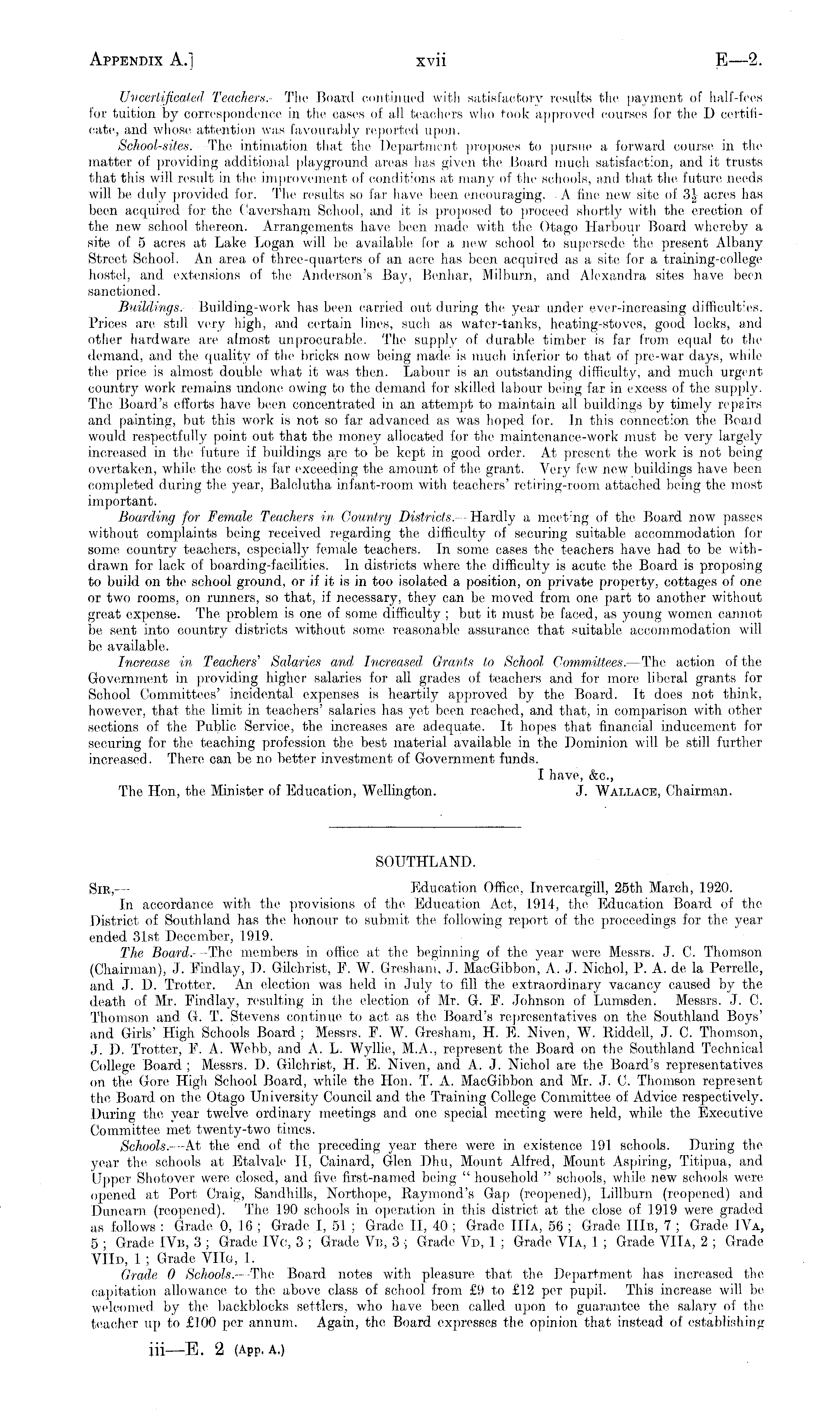 SOUTHLAND. Sir,— Education Office, Invercargill, 25th March, 1920. In accordance with the provisions of the Education Act, 1914, the Education Board of the District of Southland has the honour to submit the following report of the proceedings for the year ended 31st December, 1919. The Board.--The members in office at the beginning of the year were, Messrs. J. C. Thomson (Chairman), ,1. Pindlay, I). Gilchrist, F. W. Gresham, J. Mac Gibbon, A. J. Nichol, P. A. de la Perrelle, and J. D. Trotter. An election was held in July to fill the extraordinary vacancy caused by the death of Mr. Findlay, resulting in the election of Mr. G. F. Johnson of Lumsden. Messrs. .1. 0. Thomson and. G. T. Stevens continue to act as the Board's representatives on the Southland Boys' and Girls' High Schools Board; Messrs. F. W. Gresham, li. E. Niven, W. Riddell, J. C. Thomson, .1. I). Trotter, F. A. Webb, and A. L. Wyllie, M.A., represent the Board on the Southland Technical College Board ; Messrs. D. Gilchrist, H. E. Niven, and A. ,J. Nichol are the Board's representatives on the Gore High School Board, while the Hon. T. A. Mac Gibbon and Mr. J. C. Thomson represent the Board on the Otago University Council and the Training College Committee of Advice respectively. During the, year twelve, ordinary meetings and one special meeting were held, while the Executive Committee met twenty-two times. Schools. —At the end of the preceding year there, were in existence, 191 schools. During the year the schools at Etalvale 11, Cainard, Glen Dhu, Mount Alfred, Mount Aspiring, Titipua, and Upper Shotover were closed, and five first-named being " household " schools, while new schools were opened at Port Craig, Sandhills, Northope, Raymond's Gap (reopened), Lillburn (reopened) and Dunearn (reopened). The, 190 schools in operation in this district at the close of 1919 were graded as follows : Grade 0, 16 ; Grade I, 51 ; Grade 11, 40 ; Grade ITIa, 56 ; Grade lllis, 7 ; Grade IVa, 5 ; Grade IVb, 3 ; Grade IVc, 3 ; Grade Vis, 3 ; Grade Vt>, 1 ; Grade VIA, I ; Grade VHa, 2 ; Grade VIId, 1 ; Grade VIIo, 1. Grade 0 Schools. —The Board notes with pleasure that the Department has increased the capitation allowance to the above, class of school from £9 to £12 per pupil. This increase will be welcomed by the backblocks settlers, who have been called upon to guarantee the salary of the teacher up to £100 per annum. Again, the Board expresses the opinion that instead of establishing