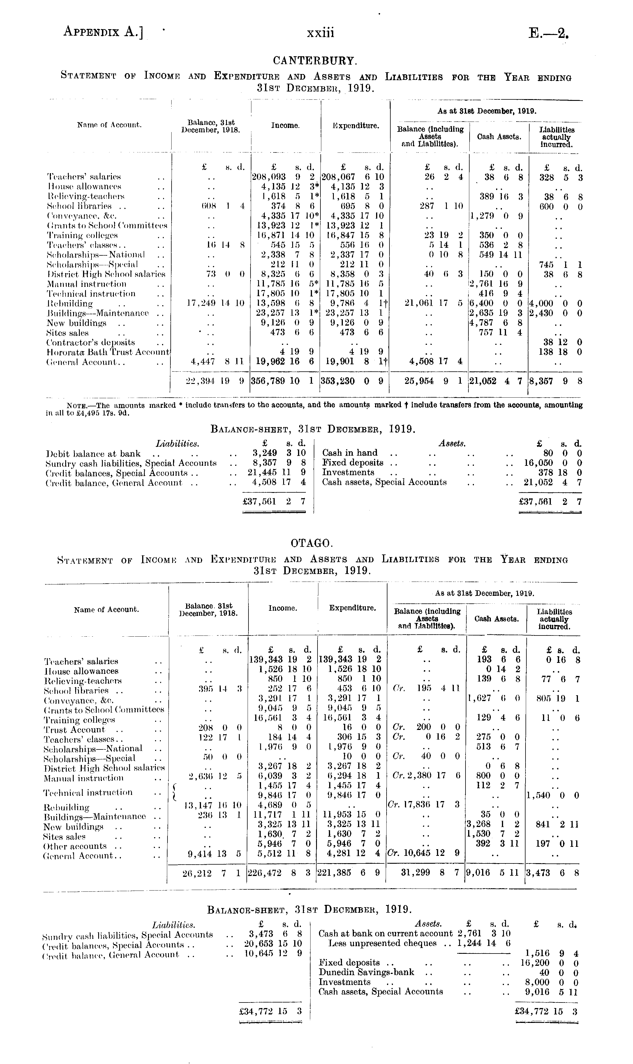 As at 81s st December, 191 19. Name of Account. Balance, 31st December, 1.918. Income. Expenditure. Balance (including Assets und Liabilities). Cash Assets. Liabilities actually incurred. [ Teachers' salaries House allowances Relieving-teachers School libraries . . ('imveyanee, &0. (Irants to School Committees Training colleges Teachers' classes.. Scholarships—National Scholarships—Special District High School salaries .Manual instruction Technical instruction Rebuilding Buildings—Maintenance . . Now buildings Sites sales Contractor's deposits Hororata Bath Trust Account General Account.. £ s. d. £ s. d. 208,093 9 2 4,135 12 3* 1,618 5 I* 374 8 6 4,335 17 10* 13,923 12 1* 16,871 14 10 545 15 5 2,338 7 8 212 II 0 8,325 6 0 11,785 10 5* 17,805 10 1* 13,598 0 8 23,257 13 1* 9,126 0 9 473 0 6 £ s. d. 208,067 6 10 4,135 12 3 1,618 5 1 695 8 0 1.335 17 10 13,923 12 I 10,847 15 8 550 10 (I 2,337 17 0 212 11 0 S. 358 0 3 11,785 10 5 17,805 10 1 9,780 4 It 23,257 13 1 !) ,126 0 9 473 0 0 £ s. rl. 26 2 4 £ s. d. 38 0 8 £ s. d. 328 5 3 008 I 4 287 I 10 389 Hi 3 38 0 8 (iOO (I 0 1,279 0 9 10 I I 8 23 19 2 5 14 1 0 10 8 350 0 0 530 2 8 549 14 II 73 0 0 40 0 3 150 0 0 2,761 10 9 410 9 4 6,400 (I 0 2,635 19 3 4,787 6 8 757 11 4 745 1 1 38 0 8 17,249 I I II) 21,06. 17 5 4,000 (I 0 2,430 0 0 4 19 9 19,902 16 6 4 19 9 19,901 8 li38 12 0 138 18 (I 4,447 8 II 4,508 17 4 Note. —The amounts lnarkr in all to £4,495 17s. 9d. 22,391 19 9 356,789 10 1 353,230 0 9 356,789 10 1 363,230 0 9 25,954 9 1 21,052 4 7 ;8,357 9 8 id * include transfers to the accounts, and the amounts marl :ed t include transfers from the accounts, amounting