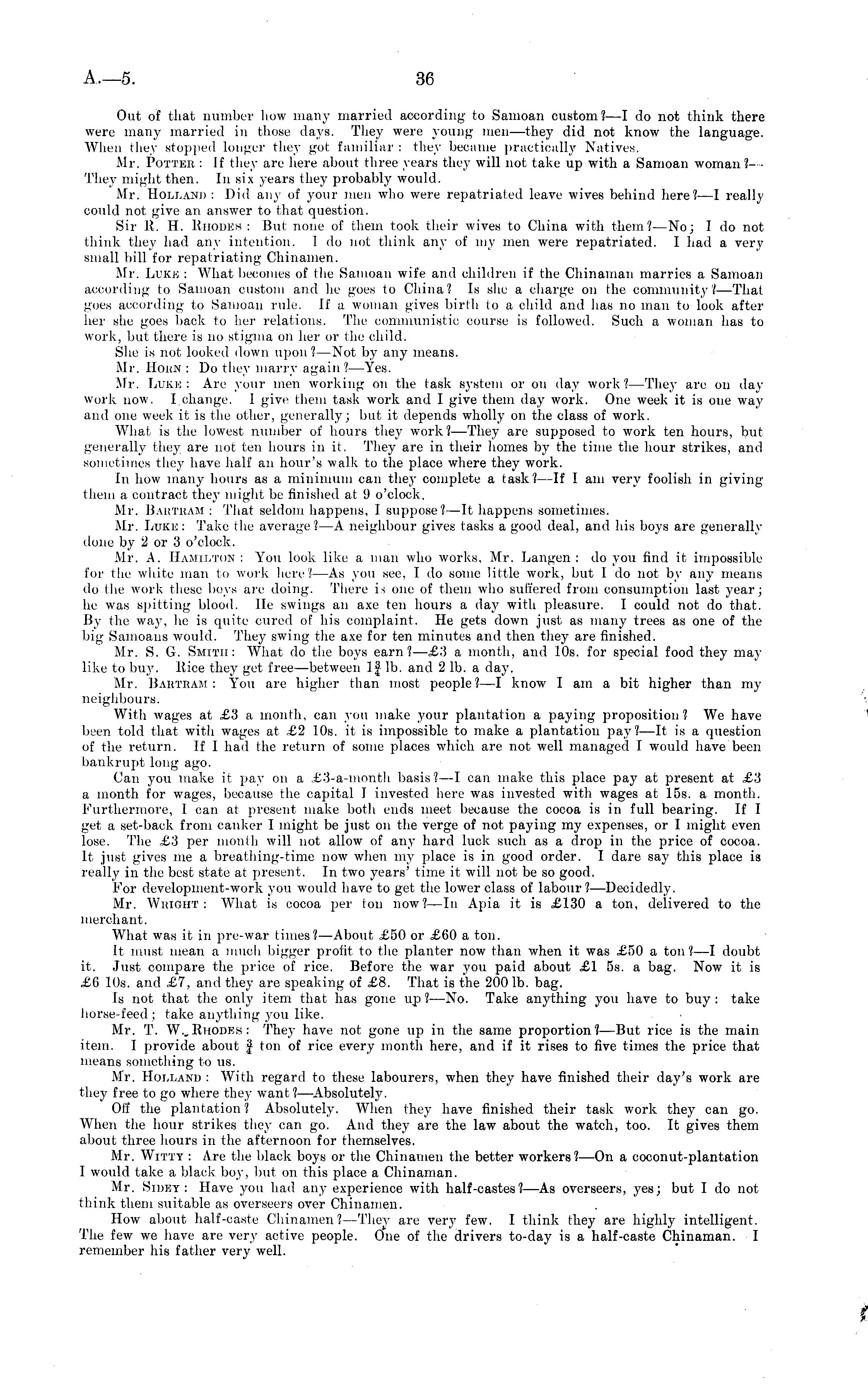 Out of that number how many married according to Samoan custom?—I do not think there were many married in those days. They were young men—they did not know the language. When they stopped longer they got familiar : they became practically Natives. Mr. Potter : If they are here about three years they will not take up with a Samoan woman?- • They might then. In six years they probably would. Mr. Holland: Did any of your men who were repatriated leave wives behind here?—l really could not give an answer to that question. Sir R. H. Rhodes : But none of them took their wives to China with them?—No; I do not think they had any intention. 1 do not think any of my men were repatriated. I had a very small bill for repatriating Chinamen. Mr. Luke : What becomes of the Samoan wife and children if the Chinaman marries a Samoan according to Samoan custom and he goes to China? Is she a charge on the community?— That goes according to Samoan rule. If a woman gives birlh to a child and has no man to look after her she goes back to her relations. The communistic course is followed. Such a woman has to work, but there is no stigma on her or the child. She is not looked down upon ?—Not by any means. Mr. Horn : Do they marry again ?—Yes. Mr. Luke: Are your men working on the task system or on day work?— They are on daywork now. I change. I give them task work and I give them day work. One week it is one way and one week it is the other, generally; but it depends wholly on the class of work. What is the lowest number of hours the)- work?— They are supposed to work ten hours, but generally they are not ten hours in it. They are in their homes by the time the hour strikes, and sometimes they have half an hour's walk to the place where they work. In how many hours as a minimum can they complete a task? —If I am very foolish in giving them a contract they might be finished at 9 o'clock. Mr. Bartram : That seldom happens, I suppose?—lt happens sometimes. Mr. Luke: Take the average?—A neighbour gives tasks a good deal, and his boys are generally done by 2 or 3 o'clock. Mr. A. Hamilton : You look like a man who works, Mr. Langen : do you find it impossible for the white man to work here? —As you see, I do some little work, but I do not by any means do the work these boys are doing. There is one of them who suffered from consumption last year; he was spitting blood, lie swings an axe ten hours a day with pleasure. I could not do that. By the way, he is quite cured of his complaint. He gets down just as many trees as one of the big Samoans would. They swing the axe for ten minutes and then they are finished. Mr. S. G. Smith: What do the boys earn?—£3 a month, and 10s. for special food they may like to bnj. Rice they get free—between 1J lb. and 2 lb. a day. Mr. Bartram: You are higher than most people?—l know I am a bit higher than my neighbours. With wages at £3 a month, can you make your plantation a paying proposition? We have been told that with wages at £2 10s. it is impossible to make a plantation pay?—lt is a question of the return. If I had the return of some places which are not well managed I would have been bankrupt long ago. Can you make it pay on a £3-a-month basis? —I can make this place pay at present at £3 a month for wages, because the capital I invested here was invested with wages at 15s. a month. Furthermore, I can at present make both ends meet because the cocoa is in full bearing. If I get a set-back from canker I might be just on the verge of not paying my expenses, or I might even lose. The £3 per month will not allow of any hard luck such as a drop in the price of cocoa. It just gives me a breathing-time now when my place is in good order. I dare say this place is really in the best state at present. In two years' time it will not be so good. For development-work you would have to get the lower class of labour?— Decidedly. Mr. Wright: What is cocoa per ton now?—ln Apia it is £130 a ton, delivered to the merchant. What was it in pre-war times? —About £50 or £60 a ton. It must mean a much bigger profit to the planter now than when it was £50 a ton '! —I doubt it. Just compare the price of rice. Before the war you paid about £1 ss. a bag. Now it is £6 10s. and £7, and they are speaking of £8. That is the 200 lb. bag. Is not that the only item that has gone up ?—No. Take anything you have to buy : take horse-feed; take anything you like. Mr. T. W..Rhodes: They have not gone up in the same proportion?— But rice is the main item. I provide about f ton of rice every month here, and if it rises to five times the price that means something to us. Mr. Holland : With regard to these labourers, when they have finished their day's work are they free to go where they want? —Absolutely. Off the plantation ? Absolutely. When they have finished their task work they can go. When the hour strikes they can go. And they are the law about the watch, too. It gives them about three hours in the afternoon for themselves. Mr. Witty : Are the black boys or the Chinamen the better workers?—On a coconut-plantation I would take a black boy, but on this place a Chinaman. Mr. Sidey : Have you had any experience with half-castes?—As overseers, yes; but I do not think them suitable as overseers over Chinamen. How about half-caste Chinamen?— They are very few. I think, they are highly intelligent. The few we have are very active people. One of the drivers to-day is a half-caste Chinaman. I remember his father very well.