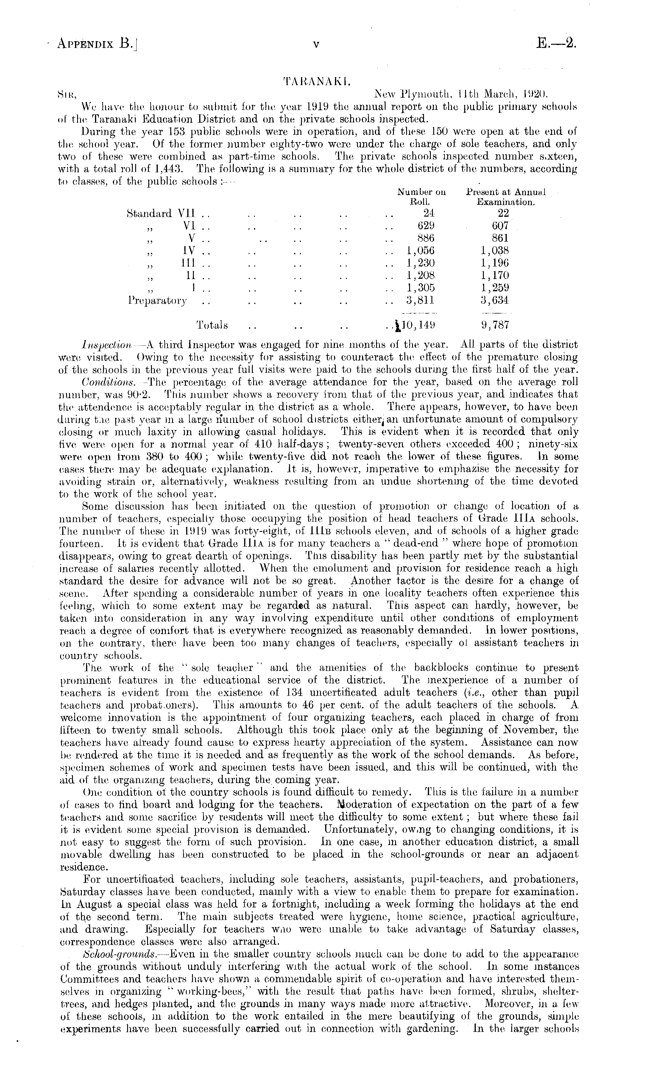 TARANAKI. Sir, New Plymouth, I lth March, 1920. We have the honour to submit for the year 1919 the annual report on the public primary schools of the Taranaki Education District and on the private schools inspected. During the year 153 public, schools were in operation, and of these 150 were open at the, end of the school year. Of the former number eighty-two were under the. charge of sole teachers, and only two of these were combined as part-time schools. The private schools inspected number s.xtcen, with a total roll of 1,4-43. The following is a, summary for the whole district of the numbers, according to classes, of the public schools: — Number on Present at Annual Roll. Examination. Standard VII . . . . .. . . .. 24 22 VI . . . . . . . . .. 629 607 V . . . . . . . . .. 886 861 IV .. .. .. .. .. 1,056 .1,038 111 .. .. .. .. .. .1,230 1,196 11 .. .. .. .. .. .1,208 1,170 I . . .. .. .. .. 1,305 1,259 Preparatory •• •• •• •• •■ 3,811 3,634 Totals .. .. .. .410,149 9,787 Inspection -A third Inspector was engaged for nine months of the year. All parts of the district were, visited. Owing to the necessity for assisting to counteract the effect of the premature closing of the schools in the previous year full visits were paid to the schools during the first half of the year. Conditions. -The percentage of the average attendance lor the year, based on the average roll number, was 90-2. This number shows a recovery irom that of the previous year, and indicates that the attendence is acceptably regular in the district as a whole. There appears, however, to have been during t.ie past year m a largo number of school districts eitherjan unfortunate, amount of compulsory closing or much laxity in allowing casual holidays. This is evident when it is recorded that only five, were open for a normal year of 410 half-days ; twenty-seven others exceeded 400; ninety-six were open from 380 to 400 ; while twenty-five did not reach the lower of these figures. In some cases there may be adequate explanation. It is, however, imperative to emphazise the necessity for avoiding strain or, alternatively, weakness resulting from an undue shortening of the time devoted to the work of the school year. Some discussion has been initiated on the question of promotion or change of location of a, number of teachers, especially those occupying the position of head teachers of Grade lIIa schools. The, number of these in 1919 was forty-eight, of 111b schools eleven, and of schools of a higher grade; fourteen. It is evident that Grade 11.1.A is for many teachers a " dead-end " where hope of promotion disappears, owing to great dearth of openings. This disability has been partly met by the substantial increase of salaries recently allotted. When the, emolument and provision for residence reach a high standard the desire for advance will not be, so great. Another factor is the desire for a change of scene. After spending a considerable number of years in one locality teachers often experience this feeling, which to some extent may be regarded as natural. This aspect can hardly, however, be taken into consideration in any way involving expenditure until other conditions of employment, reach a degree of comfort that is everywhere recognized as reasonably demanded. In lower positions, on the, contrary, there have been too many changes of teachers, especially ol assistant teachers in country schools. The work of the " sole teacher and the amenities of the backblocks continue to present prominent features in the educational service, of the district. The inexperience of a number of teachers, is evident from the existence of 134 uncertificated adult teachers (i.e., other than pupil teachers and probat.oners). This amounts to 46 per cent, of the, adult teachers of the schools. A. welcome innovation is the appointment of four organizing teachers, each placed in charge of from fifteen to twenty small schools. Although this took place, only at the beginning of November, the teachers have already found cause, to express hearty appreciation of the system. Assistance can now be, rendered at the time it is needed and as frequently as the work of the school demands. As before, specimen schemes of work and specimen tests have been issued, and this will be continued, with the aid of the organizing teachers, during the coming year. One condition of the country schools is found difficult to remedy. This is the failure in a number of cases to find board and lodgmg for the teachers. Moderation of expectation on the part of a few teachers and some sacrifice by residents will meet the difficulty to some extent; but where these fail it is evident some special provision is demanded. Unfortunately, ow.ng to changing conditions, it is not easy to suggest the form of such provision. In one case, in another education district, a small movable dwelling has been constructed to be placed in the school-grounds or near an adjacent residence. For uncertificated teachers, including sole teachers, assistants, pupil-teachers, and probationers, Saturday classes have been conducted, mainly with a view to enable, them to prepare for examination. in August a special class was held for a fortnight, including a week forming the holidays at the end of the second term. The main subjects treated were hygiene, home science, practical agriculture, <md drawing. Especially for teachers wno were unable to take advantage of Saturday classes, correspondence classes were also arranged. School-grounds. —Even in the smaller country schools much can be, done to add to the appearance of the grounds without unduly interfering with the actual work of the school. In some instances Committees and teachers have shown a commendable spirit of co-operation and have interested themselves in organizing '" working-bees," with, the result that paths have been formed, shrubs, sheltertrees, and hedges planted, and the grounds in many ways made more attractive. Moreover, in a