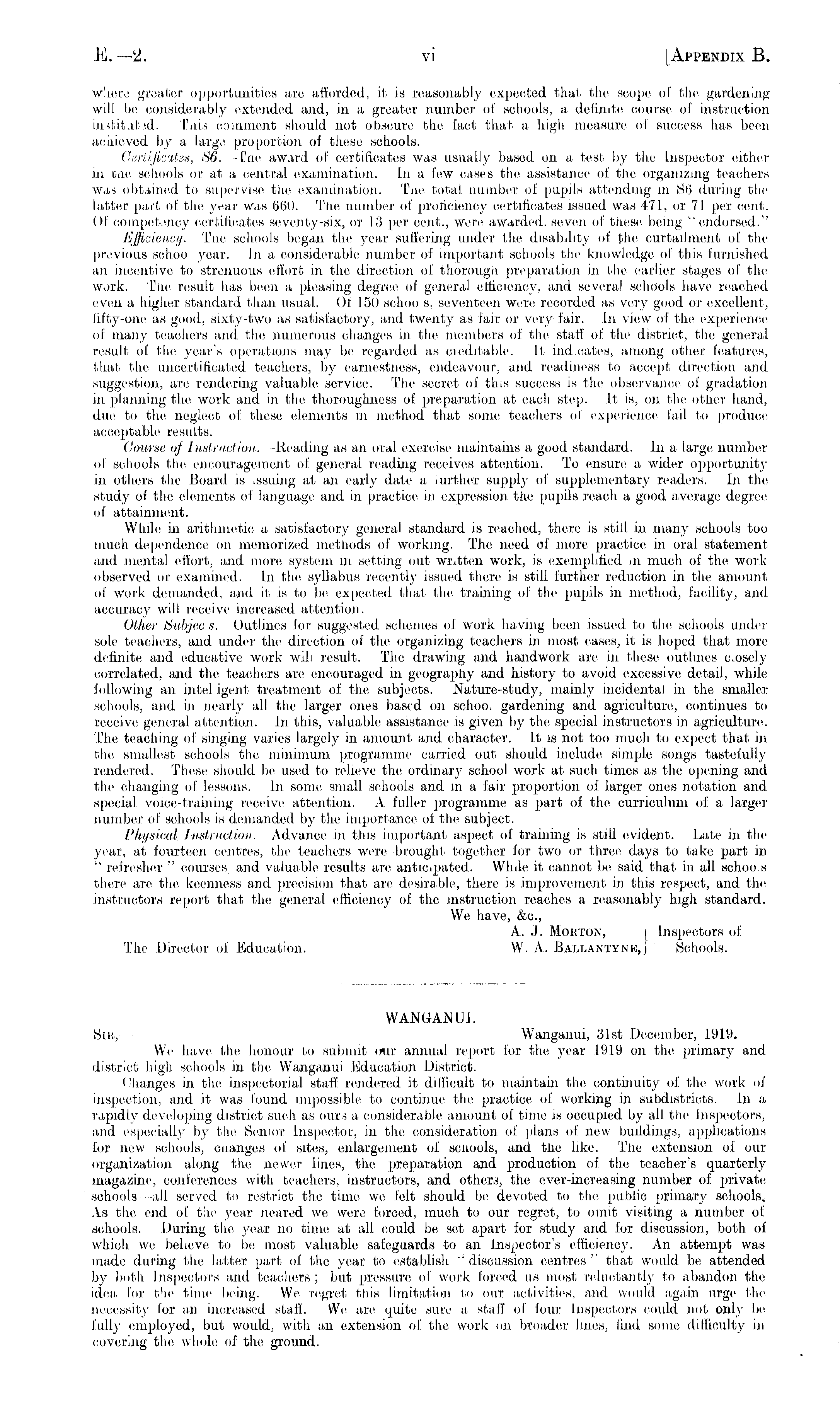 WANGANUI. Sir, Wanganui, 31st December, 1919. We have the honour to submit imr annual report for the year 1919 on the primary and district high schools in the Wanganui Eduoation District. Changes in the inspectorial staff rendered it difficult to maintain the continuity of the work of inspection, and it was found impossible to continue the practice of working in subdistricts. In a rapidly developing district such as ours a considerable amount of time is occupied by all the Inspectors, and especially by the Senior Inspector, in the consideration of plans of new buildings, applications for new schools, ciianges of sites, enlargement of schools, and the like. Tiio extension of our organization along the newer lines, the preparation and production of the teacher's quarterly magazine, conferences with teachers, instructors, and others, the ever-increasing number of private schools -all served to restrict the time we felt should be devoted to the. public primary sohools. As the end of the year neared we were forced, much to our regret, to omit visiting a number of schools. During the year no time at all could lie set apart for study and for discussion, both of which we believe to be most valuable safeguards to an Inspector's efficiency. An attempt was made during the latter part of the year to establish " discussion centres " that would be attended by both Inspectors and teachers; but pressure of work forced us most reluctantly to abandon the idea for the time being. We regret this limitation to our activities, and would again urge the necessity for an increased staff. We are quite sure a staff of four Inspectors could not only be fully employed, but would, with an extension of the work on broader hues, find some difficulty in covering the whole of the ground.