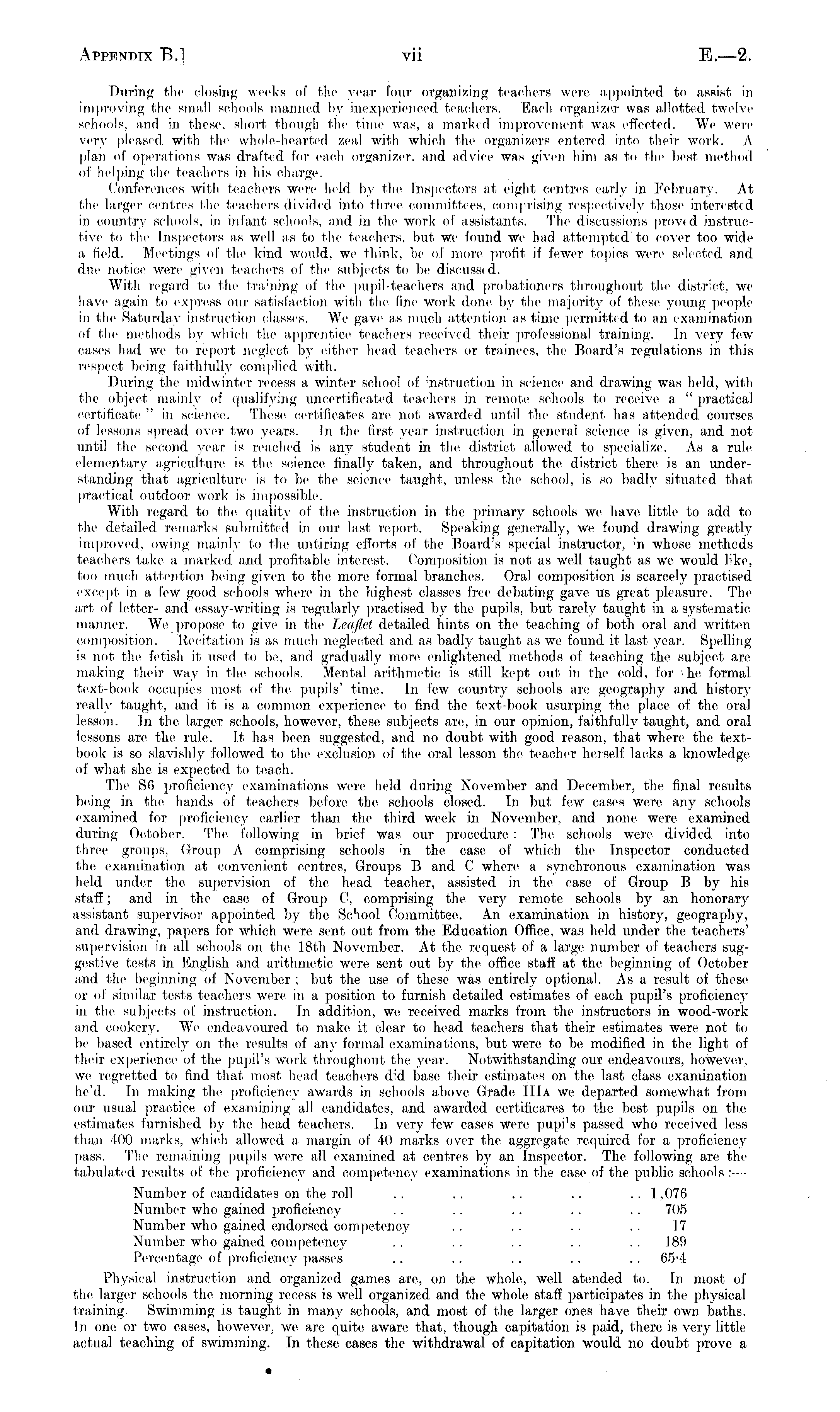 During the closing weeks of the year four organizing teachers were appointed to assist in improving the small schools manned by inexperienced teachers. Each organizer was allotted twelve schools, and in these, short though the lime was. a marked improvement was effected. We were very pleased, with the whole-hearted zeal with which the organizers entered into their work. A plan of operations was drafted for each organizer, and advice was given him as to the best method of helping the teachers in his charge. Conferences with teachers were held by the Inspectors at eight centres early in February. At the larger centres the teachers divided into three committees, comprising respectively those interested in country schools, in infant schools, and in the work of assistants. The discussions proved instructive to the Inspectors as well as to the teachers, but we found we had attempted to cover too wide a field. Meetings of the kind would, we think, lie of more profit if fewer topics were selected and due notice were given teachers of the subjects to be discussed. With regard to the training of the pupil-teachers and probationers throughout the district, we have again to express our satisfaction with the fine work done by the majority of these young people in the Saturday instruction classes. We gave as much attention as time permitted to an examination of tin- methods by which the apprentice teachers received their professional training. In very few cases had we to report neglect by either head teachers or trainees, the Board's regulations in this respect being faithfully complied with. During the midwinter recess a winter school of instruction in science and drawing was held, with the object mainly of qualifying uncertificated teachers in remote schools to receive a " practical certificate "in science. These certificates are not awarded until the student has attended courses of lessons spread over two years. In the first year instruction in general science is given, and not until the second year is reached is any student in the district allowed to specialize. As a rule elementary agriculture is the science finally taken, and throughout the district there is an understanding that agriculture is to be the science taught, unless the school, is so badly situated that practical, outdoor work is impossible. With regard to the quality of the instruction in the primary schools we have little to add to the detailed remarks submitted in our last report. Speaking generally, we found drawing greatly improved, owing mainly to the untiring efforts of the Board's special instructor, 'n whose methods teachers take a marked and profitable interest. Composition is not as well taught as we, would like, too much attention being given to the more formal branches. Oral composition is scarcely practised except in a lew good schools where in the highest classes free debating gave us great pleasure. The art of letter- and essay-writing is regularly practised by the pupils, but rarely taught in a systematic manner. We propose to give in the Leaflet, detailed hints on the teaching of both oral and written composition. Recitation is as much neglected and as badly taught as we found it last year. Spelling is not the fetish it used to be, and gradually more enlightened methods of teaching the subject are making their way in the schools. Mental arithmetic is still kept out in the cold, for he formal text-book occupies most of the pupils' time. In few country schools are geography and history really taught, and it is a common experience to find the text-book usurping the place of the oral lesson. In the larger schools, however, these subjects are, in our opinion, faithfully taught, and oral lessons are the rule. It has been suggested, and no doubt with good reason, that where the textbook is so slavishly followed to the exclusion of the oral lesson the teacher herself lacks a knowledge of what she is expected to teach. The S6 proficiency examinations were held during November and December, the final results being in the hands of teachers before the schools closed. In but few cases were any schools examined for proficiency earlier than the third week in November, and none were examined during October. The following in brief was our procedure : The schools were divided into three groups, Group A comprising schools in the case of which the Inspector conducted the examination at convenient centres, Groups B and C where a synchronous examination was held under the, supervision of the head, teacher, assisted in the case of Group B by his staff; and in the case of Group C, comprising the very remote schools by an honorary assistant supervisor appointed by the School Committee. An examination in history, geography, and drawing, papers for which were sent out from the Education Office, was held under the teachers' supervision in all schools on the 18th November. At the, request of a large number of teachers suggestive tests in English and arithmetic were sent out by the office staff at the beginning of October and the beginning of November ; but the use of these was entirely optional. As a result of these or of similar tests teachers were in a position to furnish detailed estimates of each pupil's proficiency in the subjects of instruction. In addition, we, received marks from the instructors in wood-work and cookery. We endeavoured to make it clear to head teachers that their estimates were not to be based entirely on the results of any formal examinations, but were to be modified in the light of their experience of the pupil's work throughout the year. Notwithstanding our endeavours, however, we regretted to find that most head teachers did base their estimates on the last class examination he'd. In making the proficiency awards in schools above Grade lIIa we departed somewhat from our usual practice of examining all candidates, and awarded eertificares to the best pupils on the estimates furnished by the head teachers. In very few 