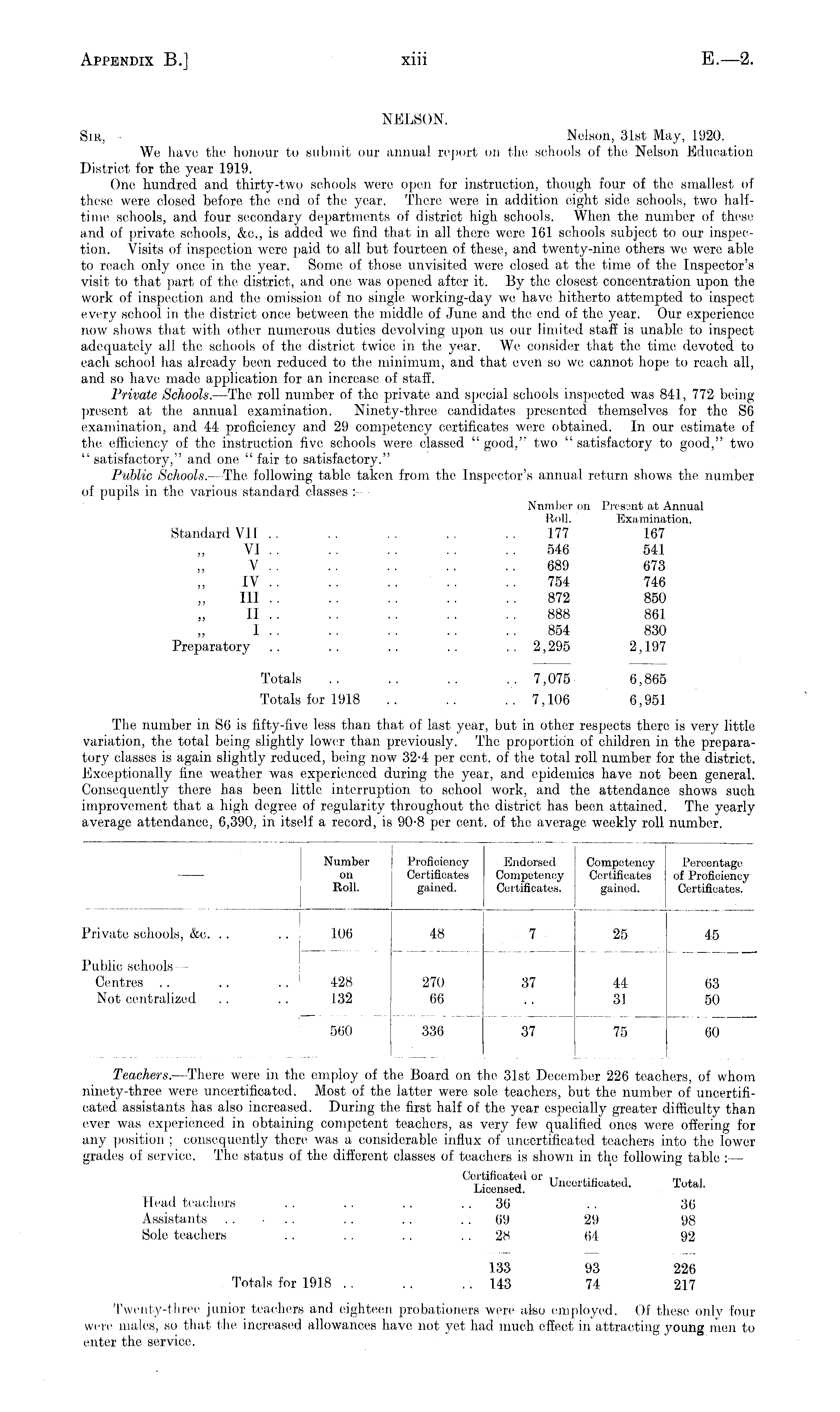 NELSON. Sir, Nelson, 31st May, 1920. We have the honour to submit our annual report on the schools of the Nelson Education District for the year 1919. One hundred and thirty-two schools were open for instruction, though four of the smallest of these were closed before the end of the. year. There were in addition eight side schools, two halftime schools, and four secondary departments of district high schools. When the number of these and of private schools, &c, is added we find that in all there were 161 schools subject to our inspection. Visits of inspection were paid to all but fourteen of these, and twenty-nine others we were able to reach only once in the year. Some of those, unvisited were closed at the time of the Inspector's visit to that part of the district, and one was opened after it. By the closest concentration upon the work of inspection and the omission of no single working-day we have hitherto attempted to inspect every school in the district once between the middle of June and the end of the year. Our experience now shows that with other numerous duties devolving upon us our limited staff is unable to inspect adequately all the schools of the district twice in the year. We consider that the time devoted to each school has already been reduced to the minimum, and that even so we cannot hope to reach all, and so have made application for an increase of staff. Private Schools. —The roll number of the private and special schools inspected was 841, 772 being present at the annual examination. Ninety-three candidates presented themselves for the S6 examination, and 44 proficiency and 29 competency certificates were obtained. In our estimate of the efficiency of the instruction five schools were classed " good," two " satisfactory to good," two " satisfactory," and one " fair to satisfactory." Public Schools.—The, following table, taken from the Inspector's annual return shows the number of pupils in the various standard classes : Nninbcr on Pressttt at Annual 8011. Kxaiiiination. Standard VII .. ~ ~ .. 177 167 VI .. .. .. .. .. 546 541 V .. .. .. .. ..689 673 IV .. .. .. .. 754 746 ~ 111 .. .. .. .. ..872 850 II .. .. .. ..888 861 I . . .. .. .. 854 830 Preparatory .. ~ .. .. ..2,295 2,197 Totals .. .. .. ... 7,075 6,865 Totals for 191.8 .. .. .. 7,106 6,951 The number in S6 is fifty-five less than that of last year, but in other respects there, is very little, variation, the total being slightly lower than previously. The. proportion of children in the preparatory classes is again slightly reduced, being now 32-4 per cent, of the total roll number for the district. Exceptionally fine weather was experienced during the year, and epidemics have not been general. Consequently there has been little interruption to school work, and the attendance shows such improvement that a high degree of regularity throughout the district has been attained. The yearly average attendance, 6,390, in itself a record, is 90-8 per cent, of the average weekly roll number.