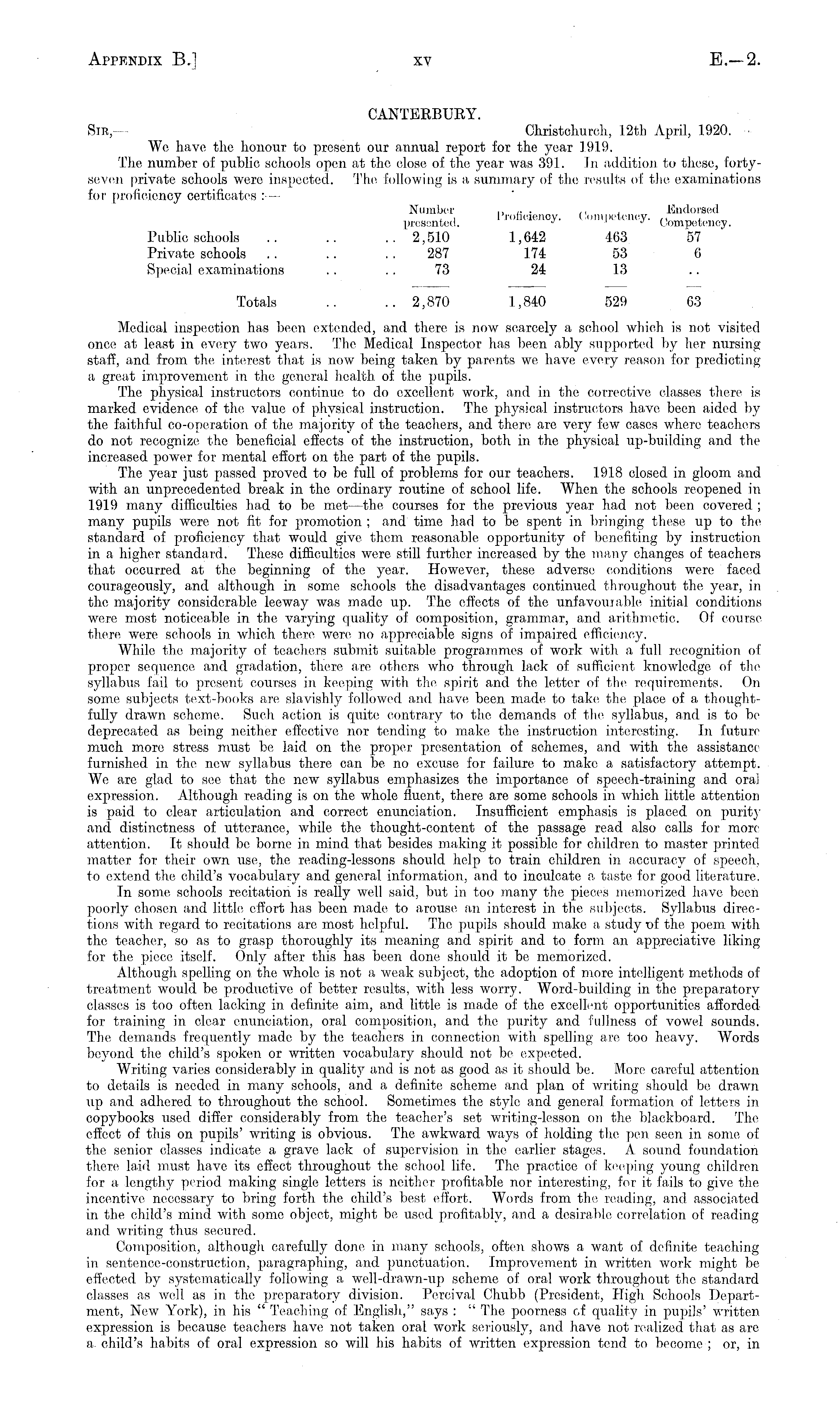 CANTERBURY. Sib,— Christohuroh, 12th April, 1920. ■ We have the honour to present our annual report for the year 1919. The number of public, schools open at the close, of the year was 391. In addition to those, fortyseven private schools were inspected. The. following is a summary of the results of the, examinations for proficiency certificates : — Number D „ __■ . ~ , Endorsed , , I'rofir.reiicy. Comnelonc.y. ~ , presented. ' J Competency. Public schools .. .. ..2,510 1,642 463 57 Private schools .. .. 287 174 53 6 Special examinations .. .. 73 24 13 Totals .. .. 2,870 1,840 529 63 Medical inspection has been extended, and then; is now scarcely a school which is not visited once at least in every two years. The Medical Inspector has been ably supported by her nursing staff, and. from the interest that is now being taken, by parents we have every reason for predicting a great improvement in the general health of the pupils. The physical instructors continue to do excellent work, and in the corrective, classes there is marked evidence of the value of physical instruction. The physical, instructors have been aided by the faithful co-operation of the, majority of the teachers, and there are very few cases where teachers do not recognize the beneficial effects of the instruction, both in the physical up-building and the increased power for mental effort on the part of the pupils. The year just passed proved to be full of problems for our teachers. 1918 closed in gloom and with an unprecedented break in the ordinary routine of school life. When the schools reopened in 1919 many difficulties had to be met —the courses for the previous year had not been covered ; many pupils were not fit for promotion ; and time had to be spent in bringing these up to the standard of proficiency that would give them reasonable opportunity of benefiting by instruction in a higher standard. These difficulties were still further increased by the many changes of teachers that occurred at the beginning of the year. However, these adverse conditions were faced courageously, and although in some schools the disadvantages continued throughout the year, in the majority considerable leeway was made up. The effects of the unfavourable initial conditions were most noticeable in the varying quality of composition, grammar, and arithmetic. Of course there were schools in which, there were no appreciable signs of impaired efficiency. While the majority of teachers submit suitable programmes of work with a full recognition of proper sequence and gradation, there are others who through lack of sufficient knowledge of the syllabus fail to present courses in. keeping with the, spirit and the letter of the requirements. On some subjects text-books are slavishly followed and. have been made to take, the place of a thoughtfully drawn scheme. Such action is quite contrary to the demands of tin; syllabus, and is to be deprecated as being neither effective nor tending to make the instruction interesting. In future much more stress must be laid on the proper presentation of schemes, and with the assistance furnished in the new syllabus there can be no excuse, for failure to make a satisfactory attempt. We are glad to see that the new syllabus emphasizes the importance of speech-training and oral expression. Although reading is on the whole fluent, there are some schools in which little attention is paid to clear articulation and correct enunciation. Insufficient emphasis is placed on purity and distinctness of utterance, while tin; thought-content of the passage read also calls for more attention. It should be borne in mind that besides making it possible for children to master printed matter for their own use, the reading-lessons should help to train children in accuracy of speech, to extend the child's vocabulary and general information, and to inculcate a, taste for good literature. In some schools recitation is really well said, but in too many the pieces memorized have been poorly chosen and little effort has been made to arouse an interest in the, subjects. Syllabus directions with regard to recitations arc most helpful. The pupils should make a study of the poem with the teacher, so as to grasp thoroughly its meaning and spirit and to form an appreciative liking for the piece itself. Only after this has been done should it bo memorized. Although spelling on the whole is not a weak subject, the adoption of more intelligent methods of treatment would be productive of better results, with less worry. Word-building in the preparatory classes is too often lacking in definite aim, and little is made of the excellent opportunities afforded for training in clear enunciation, oral composition, and the purity and fullness of vowel sounds. The demands frequently made by the teachers in connection with spelling are too heavy. Words beyond the child's spoken or written vocabulary should not be expected. Writing varies considerably in quality and is not as good as it should be. More careful attention to details is needed in many schools, and a definite scheme and plan of writing should be drawn up and adhered to throughout the school. Sometimes the style and genera] formation of letters in copybooks used differ considerably from the teacher's set writing-lesson on the blackboard. The effect of this on pupils' writing is obvious. The awkward ways of holding the pen seen in some, of the senior classes indicate a grave lack of supervision in the earlier stages. A sound foundation there laid must have its effect throughout the school life. The practice of keeping young children for a lengthy period making single letters is neither profitable nor interesting, for it fails to give the incentive necessary to bring forth the child's best effort. Words from the reading, and associated in the child's mind with some object, might be, used profitably, and a desirable, correlation of reading and writing thus secured. Composition, although caref