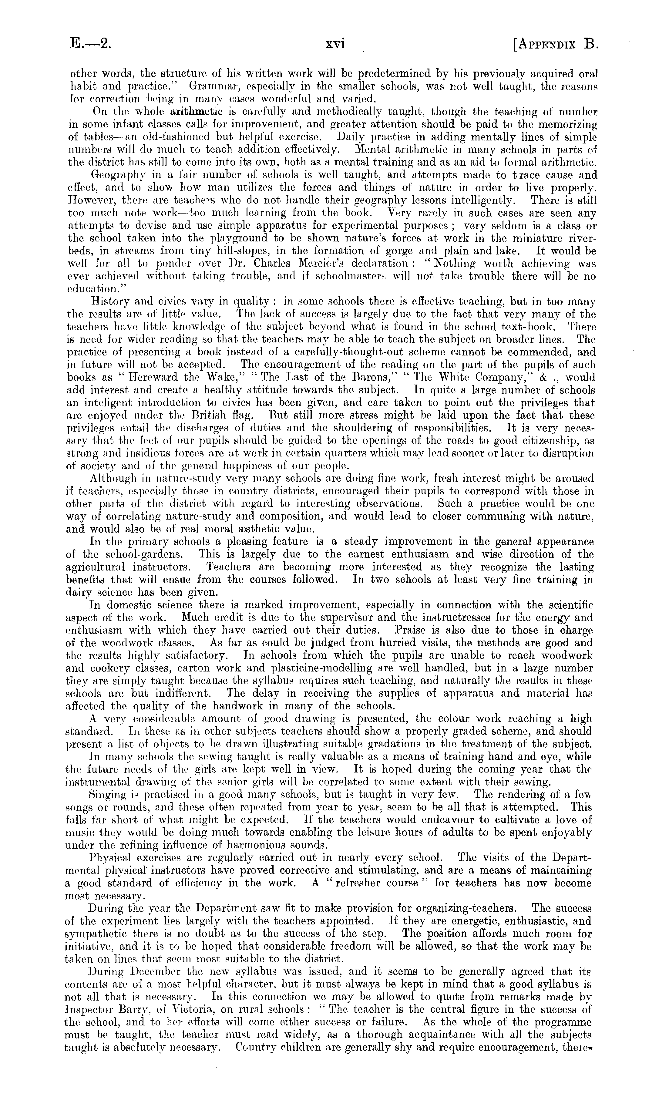 other words, the structure of his written work will be predetermined by his previously acquired oral habit and practice." Grammar, especially in the smaller schools, was not well taught, the reasons for correction being in many cases wonderful and varied. On the whole, arithmetic is carefully and methodically taught, though the teaching of number in some infant classes calls for improvement, and greater attention should, be paid to the memorizing of tables— an old-fashioned but helpful exercise. Daily practice in adding mentally lines of simple numbers will do much to teach addition effectively. Mental arithmetic in many schools in parts of the district has still to come into its own, both as a mental training and as an aid to formal arithmetic. Geography in a fair number of schools is well taught, and attempts made to trace cause and effect, and to show how man utilizes the forces and things of nature in order to live properly. However, there are teachers who do not handle their geography lessons intelligently. There is still too much note work—too much learning from the book. Very rarely in such cases are seen any attempts to devise and use simple apparatus for experimental purposes ; very seldom is a class or the school taken into the playground to be shown nature's forces at work in the miniature riverbeds, in streams from tiny hill-slopes, in the formation of gorge and plain and lake. It would be well for all to ponder over Dr. Charles Mercicr's declaration : " Nothing worth achieving was ever achieved without taking trouble, and if schoolmasters will not take trouble there will be no education." History and civics vary in quality : in some schools there is effective teaching, but in too many the results are of little value. The lack of success is largely due to the fact that very many of the teachers have little knowledge of the subject beyond what is found in the school text-book. There is need for wider reading so that the teachers may be, able to teach the subject on broader lines. The practice of presenting a book instead of a carefully-thought-out scheme cannot be commended, and in future will not be accepted. The encouragement of the reading on the part of the pupils of such books as " Hereward the Wake," " The Last of the Barons," " The White Company," & ~ would add interest and create a, healthy attitude towards the subject. In quite a, la.rge number of schools an intcligent introduction to civics has been given, and care taken to point out the privileges that are enjoyed under the British flag. But still more stress might be, laid upon the fact that these privileges entail the discharges of duties and the shouldering of responsibilities. It is very necessary that tin; feet of our pupils should be guided to the openings of tin: roads to good citizenship, its strong and insidious forces are at work in certain quarters which may lead sooner or later to disruption of society and of the general happiness of our people. Although in nature-study very many schools are doing fine work, fresh interest might be aroused if teachers, especially those in country districts, encouraged their pupils to correspond with, those in other parts of the district with regard to interesting observations. Such a practice would bo one way of correlating nature-study and composition, and would lead to closer communing with nature, and would also be of real moral aesthetic value. In the primary schools a pleasing feature is a steady improvement in the general appearance of the school-gardens. This is largely due to the, earnest enthusiasm and wise direction of the agricultural instructors. Teachers are becoming more interested as they recognize the lasting benefits that will ensue from the courses followed. In two schools at least very fine training in dairy science has been given. In domestic science there is marked improvement, especially in connection with the scientific aspect of the work. Much credit is due to the supervisor and the instructresses for the energy and enthusiasm with which they have carried out their duties. Praise is also due to those in charge of the woodwork classes. As far as could be judged from hurried visits, the methods are good and the results highly satisfactory. In schools from which the pupils are unable to reach woodwork and cookery classes, carton work and plasticine-modelling are well handled, but in a large number they are simply taught because the syllabus requires such teaching, and naturally the results in these schools are but indifferent. The delay in receiving the supplies of apparatus and material has affected the quality of the handwork in many of the schools. A very considerable amount of good drawing is presented, the colour work reaching a high standard. In these as in other subjects teachers should show a properly graded scheme, and should present a list of objects to be drawn illustrating suitable gradations in the treatment of the subject. In many schools the sewing taught is really valuable, as a means of training hand and eye, while the future needs of the, girls are kept well in view. It is hoped during the coming year that the instrumental drawing of the senior girls will be correlated to some extent with their sewing. Singing is practised in a good many schools, but is taught in very few. The rendering of a few songs or rounds, and these often repeated from year tc year, seem to be all that is attempted. This falls far short of what might be expected. If the teachers would endeavour to cultivate a love of music they would be doing much towards enabling the leisure hours of adults to be spent enjoyably under the refining influence of harmonious sounds. Physical exercises are regularly carried out in nearly every school. The visits of the Departmental physical instructors have proved corrective and stimulating, and are a means of maintaining a good standard of efficiency in the work. A " refresher course " for teachers has now become most necessa