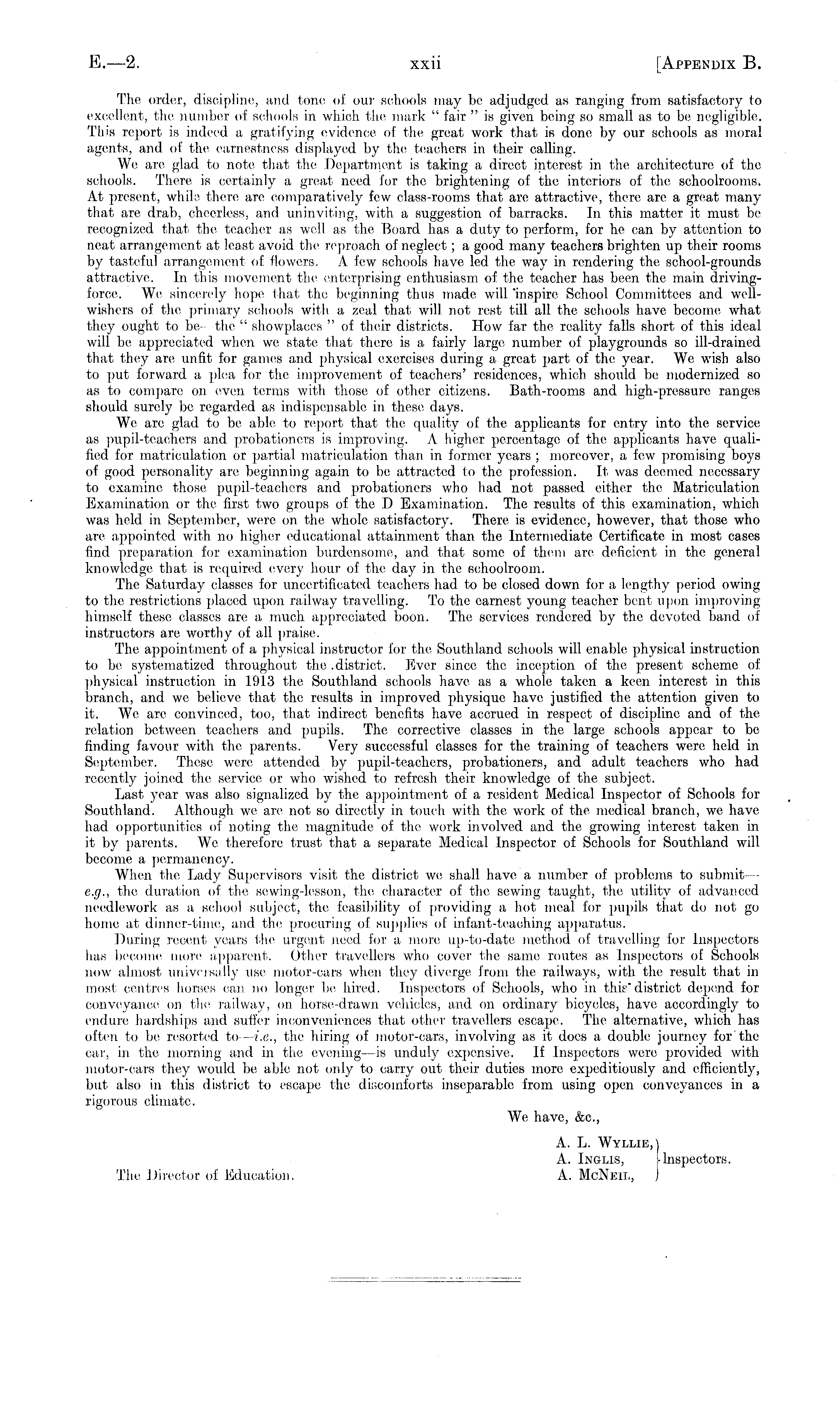 The order, discipline, and tone, of our sohools may be adjudged as ranging from satisfactory to excellent, the number of schools in which the mark " fair " is given being so small as to be negligible. This report is indeed a gratifying evidence of the great work that is done by our schools as moral agents, and of the earnestness displayed by the teachers in their calling. We are glad to note that the Department is taking a direct interest in the architecture, of the schools. There is certainly a great need for the brightening of the interiors of the schoolrooms. At present, while there are comparatively few class-rooms that are attractive, there are a great many that are, drab, cheerless, and uninviting, with a suggestion of barracks. In this matter it must be recognized that the teacher as well as the Board has a duty to perform, for he can by attention to neat arrangement at least avoid the, reproach of neglect; a good many teachers brighten up their rooms by tasteful arrangement of flowers. A few schools have led the way in rendering the school-grounds attractive. In this movement the enterprising enthusiasm of the teacher has been the main drivingforce.. We sincerely hope that the beginning thus made will 'inspire School Committees and wellwishers of the primary schools with a zeal that will not rest till all the schools have become what they ought to be, the " showplaces "of their districts. How far the reality falls short of this ideal will be appreciated when we state that there is a, fairly large number of playgrounds so ill-drained that they are unfit for games and physical exercises during a great part of the year. We wish also to put forward a plea for the improvement of teachers' residences, which should be modernized so as to compare on even terms with those of other citizens. Bath-rooms and high-pressure ranges should surely be regarded as indispensable in these days. We are, glad to be able to report that the quality of the applicants for entry into the service as pupil-teachers and probationers is improving. A higher percentage of the applicants have qualified for matriculation or partial matriculation than in former years ; moreover, a few promising boys of good personality are beginning again to be attracted lo the profession. It was deemed necessary to examine, those pupil-teachers and probationers who had not passed either the Matriculation Examination or the first two groups of the D Examination. The results of this examination, which was held in September, were on the whole satisfactory. There, is evidence, however, that those who are appointed with no higher educational attainment than the Intermediate Certificate in most cases find preparation for examination burdensome, and that some of them are deficient in the general knowledge that is required every hour of the day in the schoolroom. The Saturday classes for uncertificated teachers had to be closed down for a lengthy period owing to the restrictions placed upon railway travelling. To the earnest young teacher bent upon improving himself these classes are a much appreciated boon. The services rendered by the devoted band of instructors are worthy of all praise. The appointment of a physical instructor for the Southland schools will enable physical instruction to be systematized throughout the .district. Ever since, the inception of the present scheme of physical instruction in 1913 the Southland schools have, as a whole taken a keen interest in this branch, and we believe that the results in improved physique have justified the attention given to it. We are convinced, too, that indirect benefits have, accrued in respect of discipline and of the relation between teachers and pupils. The corrective classes in the large schools appear to be finding favour with the parents. Very successful classes for the training of teachers were held in September. These were attended by pupil-teachers, probationers, and adult teachers who had recently joined the service or who wished to refresh their knowledge of the subject. Last year was also signalized by the appointment of a resident Medical Inspector of Schools for Southland. Although we are not so directly in touch with the work of the medical branch, we have had opportunities of noting the magnitude of the work involved and the growing interest taken in it by parents. We therefore trust that a separate Medical Inspector of Schools for Southland will become a permanency. When the Lady Supervisors visit the district we shall have a number of problems to submit e.g., the, duration of the sewing-lesson, the character of the sewing taught, the utility of advanced needlework as a school subject, the feasibility of providing a hot meal for pupils that do not go home at dinner-time, and the procuring of supplies of infant-teaching apparatus. During recent years the urgent need for a more up-to-date method of travelling for Inspectors has become more apparent. Other travellers who cover the same routes as Inspectors of Sohools now almost universally use motor-cars when they diverge from the railways, with the result that in most centres horses can no longer be hired. Inspectors of Schools, who in this"district depend for conveyance on the railway, on horse-drawn vehicles, and on ordinary bicycles, have accordingly to endure hardships and suffer inconveniences that other travellers escape. The alternative, which has often to be resorted to—i.e., the hiring of motor-cars, involving as it does a double journey for'the car, in the morning and in the evening—is unduly expensive. If Inspectors were provided with motor-cars they would be, able not only to carry out their duties more expeditiously and efficiently, but also in this district to escape the discomforts inseparable from using open conveyances in a rigorous climate. We have, &c, A. L. Wylliu,) A. Inglis, [ Inspectors. The Director of Education. A. McNeil, J