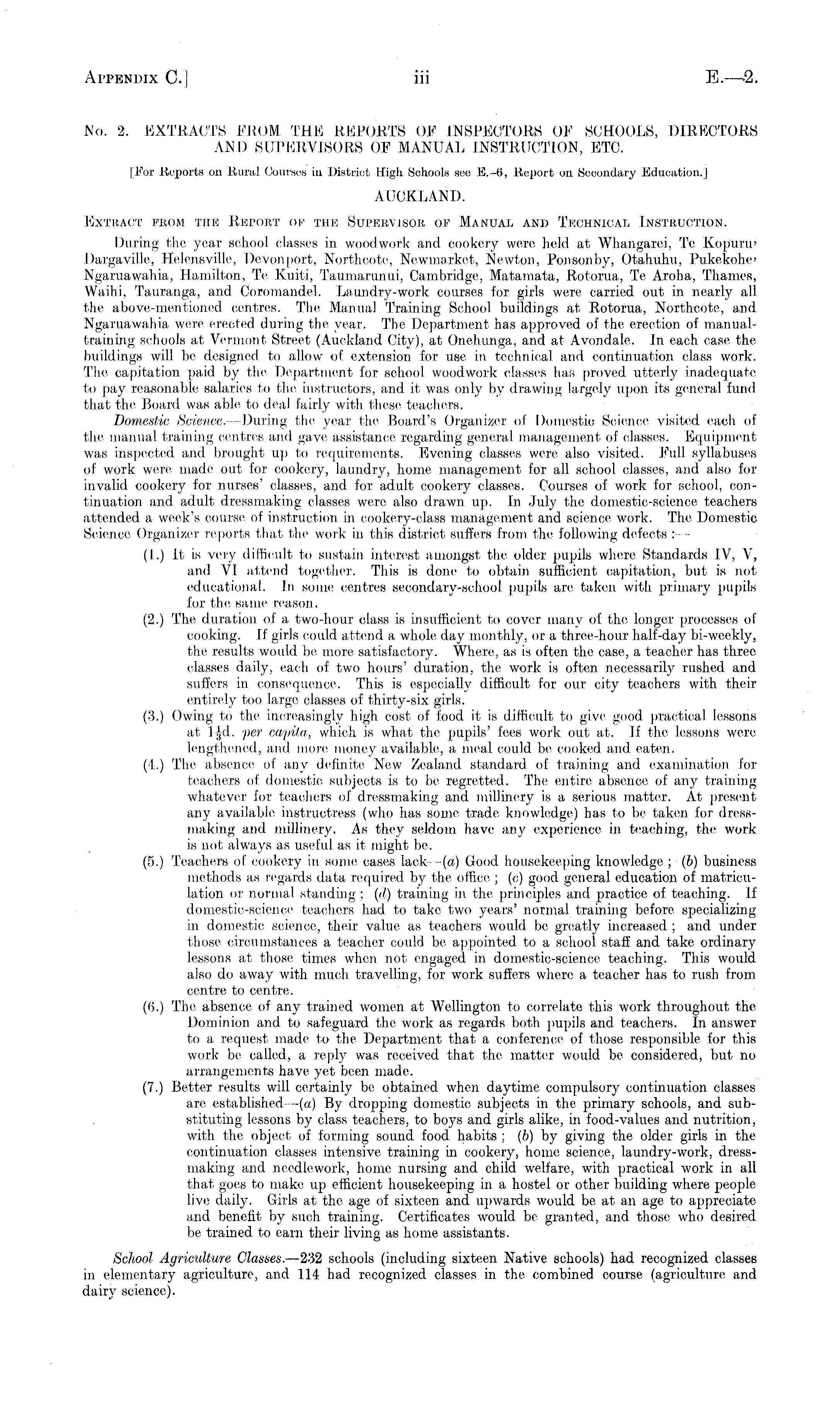 No. 2. EXTRACTS PROM THE REPORTS OF INSPECTORS OK SCHOOLS, DIRECTORS AND SUPERVISORS OF MANUAL INSTRUCTION, ETC. [For Reports on Rural Courses in District High Sohools see E.-6, Report on Secondary Education.] AUCKLAND. Extract from the Report of the Supervisor of Manual and Technical Instruction. During the year school classes in woodwork and cookery were held at Whangarei, Tc Kopuni> Dargaville, Helensville, Devon port, Northeote, Newmarket, Newton, Ponsonby, Otahuhu, Pukekohc Ngaruawahia, Hamilton, Te Kuiti, Taumarunui, Cambridge, Matamata, Rotorua, Tc Aroha, Thames, Waihi, Tauranga, and Coromandel. Laundry-work courses for girls were carried out in nearly all the above-mentioned centres. The Manual Training School buildings at Rotorua, Northeote, and Ngaruawahia were erected during the year. The Department, has approved of the erection of manualtraining schools at Vermont Street (Auckland City), at Onehunga, and at Avondale. In each case, the buildings will be designed to allow of extension for use in technical and continuation class work. The capitation paid by the Department for school woodwork classes has proved utterly inadequate to pay reasonable salaries to the instructors, and it was only by drawing largely upon its general fund that the Board was able, to deal fairly with these teachers. Domestic Science. —During the year the Board's Organizer of Domestic Science visited each of the manual training centres and gave assistance regarding general management of classes. Equipment was inspected and brought up to requirements, Evening classes were also visited. Full syllabuses of work were made out for cookery, laundry, home management for all school classes, and also for invalid cookery for nurses' classes, and for adult cookery classes. Courses of work for school, continuation and adult dressmaking classes were also drawn up. In July the domestic-science teachers attended a week's course of instruction in cookery-class management and science work. The, Domestic Science Organizer reports that the work in this district suffers from the following defects : - (I.) It is very difficult to sustain interest amongst the older pupils where Standards IV, V, and VI attend together. This is done to obtain sufficient capitation, but is not educational. In some centres secondary-school pupils are taken with primary pupils for the same reason. (2.) The duration of a two-hour class is insufficient to cover many of the longer processes of cooking. If girls could attend a whole day monthly, or a three-hour half-day bi-weekly, the results would be, more satisfactory. Where, as is often the case, a teacher has three classes daily, each of two hours' duration, the work is often necessarily rushed and suffers in consequence. This is especially difficult for our city teachers with their entirely too large, classes of thirty-six girls. (3.) Owing to the increasingly high cost of food it is difficult to give good practical lessons at 1-Jd. per capita, which is what the pupils' fees work out at. If the, lessons were lengthened, and more money available, a meal could be, cooked and eaten. (4.) The absence of any definite New Zealand standard of training and examination for teachers of domestic subjects is to be regretted. The entire absence of any training whatever for teachers of dressmaking and millinery is a serious matter. At present any available instructress (who has some trade knowledge) has to be taken for dressmaking and millinery. As they seldom have any experience in teaching, the work is not always as useful as it might be. (5.) Teachers of cookery in some cases lack—(a) Good housekeeping knowledge ; (b) business methods as regards data required by the office ; (c) good general education of matriculation or normal standing ; (d) training in the principles and practice of teaching. If domestic-science teachers had to take two years' normal training before specializing in domestic science, their value, as teachers would be greatly increased ; and under those circumstances a teacher could be, appointed, to a school staff and take ordinary lessons at those, times when not engaged in domestic-science teaching. This would also do away with much travelling, for work suffers where a teacher has to rush from centre to centre. (6.) The absence of any trained women at Wellington to correlate this work throughout the, Dominion and to safeguard the work as regards both pupils and teachers. In answer to a request made to the. Department that a conference of those responsible for this work be called, a reply was received that the, matter would be considered, but no arrangements have yet been made. (7.) Better results will certainly be obtained when daytime compulsory continuation classes are established— (a) By dropping domestic, subjects in the primary schools, and substituting lessons by class teachers, to boys and girls alike, in food-values and nutrition, with the, object of forming sound food habits ; (b) by giving the older girls in the continuation classes intensive training in cookery, home science, laundry-work, dressmaking and needlework, home nursing and child welfare, with practical work in all that goes to make up efficient housekeeping in a hostel or other building where people live daily. Girls at the, age of sixteen and upwards would be at an age to appreciate and benefit by such training. Certificates would be granted, and those who desired be trained to earn their living as home assistants. School Agriculture Classes. —232 schools (including sixteen Native schools) had recognized classes in elementary agriculture, and 114 had recognized classes in the, combined course (agriculture and dairy science).
