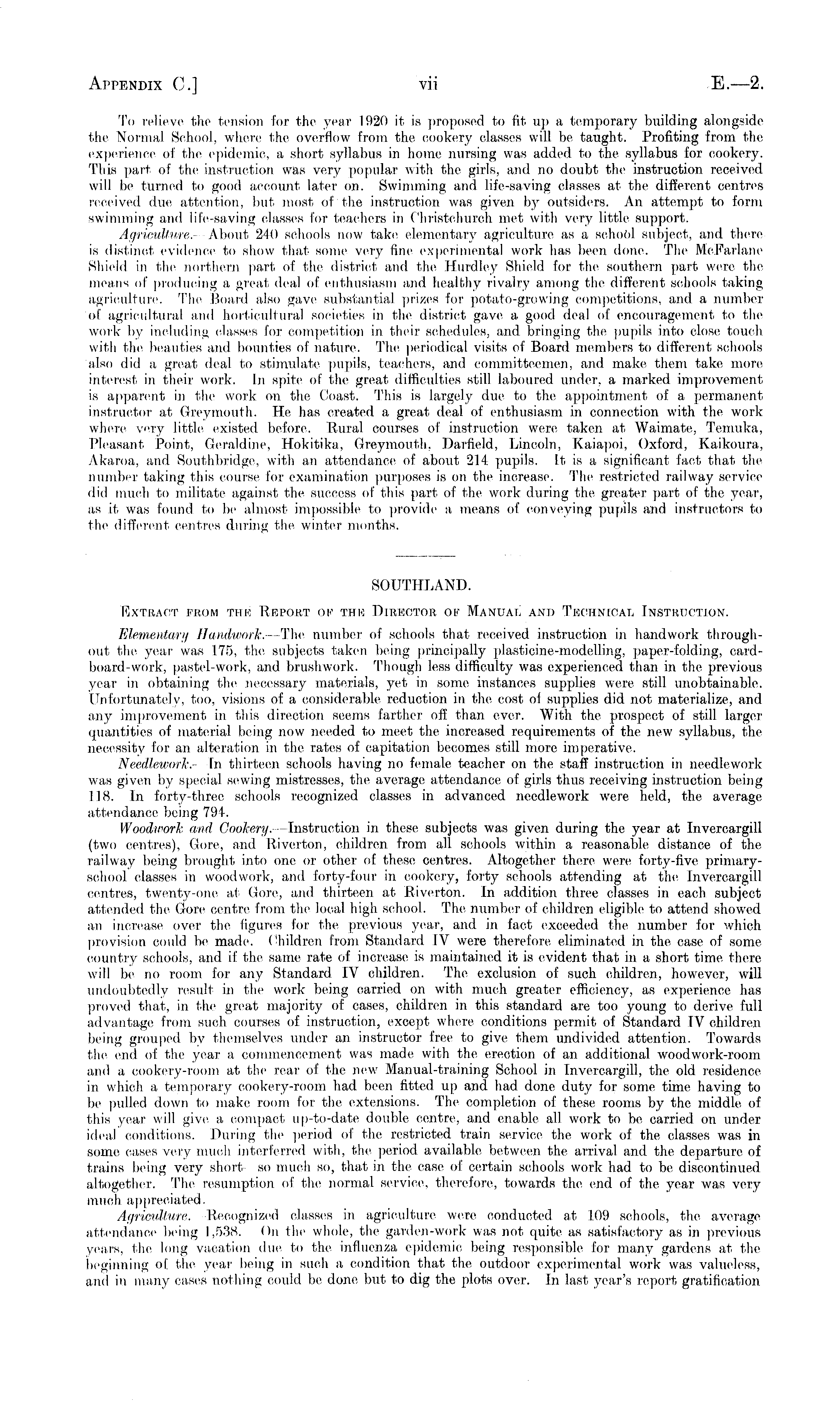 To relieve the tension for the year 1920 it is proposed to fit up a temporary building alongside the Normal School, where the, overflow from the cookery classes will be taught. Profiting from the experience of the epidemic, a short syllabus in home nursing was added to the syllabus for cookery. This part of the instruction was very popular with the girls, and no doubt the instruction received will be turned to good account later on. Swimming and life-saving classes at the different centres received due attention, but most of the instruction was given by outsiders. An attempt to form swimming and life-saving classes for teachers in Cliristchurch met with very little support. Agriculture. —About 240 schools now take, elementary agriculture as a school subject, and there is distinct evidence to show that- some very fine experimental work has been done. The McFarlane Shield in the northern part of the district and the Hurdley Shield for the southern part were, the means of producing a great deal of enthusiasm and healthy rivalry among the different schools taking agriculture. The Board also gave substantial prizes for potato-growing competitions, and a number of agricultural and horticultural societies in the district gave a. good deal of encouragement to the work by including classes for competition in their schedules, and bringing the pupils into close touch with the beauties and bounties of nature. The periodical visits of Board members to different schools also did a great deal to stimulate pupils, teachers, and committeemen, and make them take more interest in their work. In spite of the great difficulties still laboured under, a marked improvement is apparent in the work on the Coast. This is largely due to the appointment of a permanent instructor at Greymouth. He has created a great deal of enthusiasm in connection with the work where very little existed before. Rural courses of instruction were taken at Waimate, Temuka, Pleasant Point, Geraldine, Hokitika, Greymouth, Darfield, Lincoln, Kaiapoi, Oxford, Kaikoura, Akaroa, and South bridge, with an attendance of about 214 pupils. It is a significant fact that the number taking this course for examination purposes is on the increase. The restricted railway service did much to militate against the success of this part of the work during the greater part of the year, as it was found to be almost- impossible to provide a means of conveying pupils and instructors to th<' different centres during the winter months. SOUTH LAND. Extract from the Report of the Director oe Manual and Technical Instruction. Elementary Handwork. —The number of schools that received instruction in handwork throughout the year was 175, the, subjects taken being principally plasticine-modelling, paper-folding, card-board-work, pastel-work, and brushwork. Though less difficulty was experienced than in the previous year in obtaining the necessary materials, yet in some instances supplies were still unobtainable. Unfortunately, too, visions of a considerable reduction in the. cost oi supplies did not materialize, and any improvement in this direction seems farther off than ever. With the prospect of still larger quantities of material being now needed to meet the increased requirements of the new syllabus, the necessity for an alteration in the rates of capitation becomes still more imperative. Needlework- In thirteen schools having no female teacher on the staff instruction in needlework was given by special sewing mistresses, the average attendance of girls thus receiving instruction being 118. In forty-three schools recognized classes in advanced needlework were, held, the average attendance being 791. Woodwork and Cookery. —Instruction in these subjects was given during the year at Invercargill (two centres), Gore, and Riverton, children from all schools within a reasonable distance of the railway being brought into one or other of these centres. Altogether there were forty-five primaryschool classes in woodwork, and forty-four in cookery, forty schools attending at the Invercargill centres, twenty-one at Gore, and thirteen at Riverton. In addition three classes in each subject attended the, Gore centre from the local high school. The number of children eligible to attend showed an increase over the figures for the previous year, and in fact exceeded the number for which provision could be made. Children from Standard IV were therefore, eliminated in the case of some country schools, and if the same rate of increase is maintained it is evident that in a short time there will be no room for any Standard IV children. The exclusion of such children, however, will undoubtedly result in the work being carried on with much greater efficiency, as experience has proved that, in the great majority of cases, children in this standard are too young to derive full advantage from such courses of instruction, except where conditions permit of Standard TV children being grouped by themselves under an instructor free to give them undivided attention. Towards the end of the year a commencement was made with the erection of an additional woodwork-room and a cookery-room at the rear of the new Manual-training School in Invercargill, the old residence in which a temporary cookery-room had been fitted up and had done duty for some time having to be pulled down to make room for the extensions. The completion of these rooms by the middle, of this year will give a compact up-to-date double centre, and enable all work to be, carried on under ideal conditions. During the, period of the restricted train service the work of the, classes was in some cases very much interferred with, the period available between the arrival and the departure of trains being very short—so much so, that in the case of certain schools work had to be, discontinued altogether. The resumption of the, normal service, therefore, towards the end of the, year was very much appreciated. Agriculture. Recognized clas